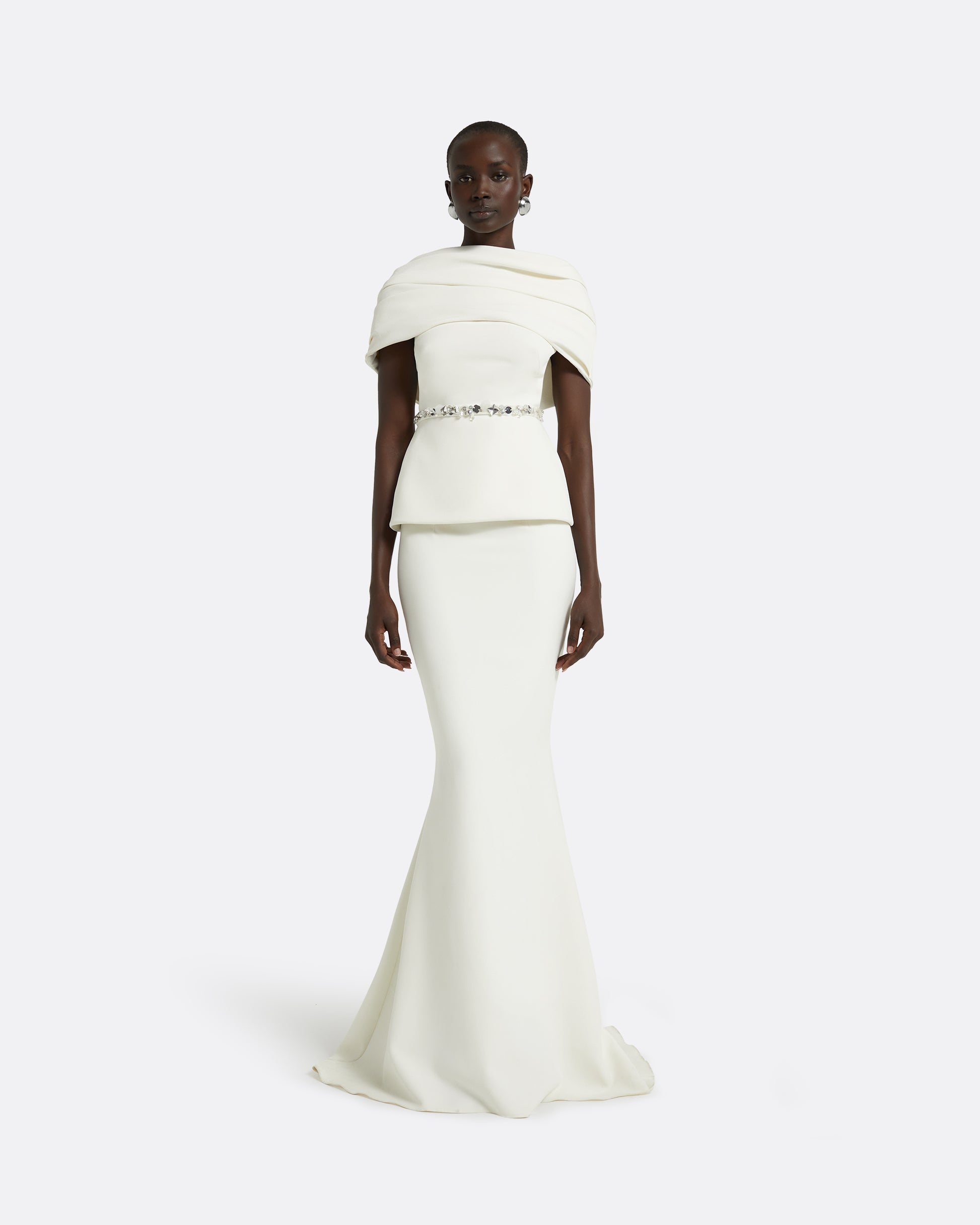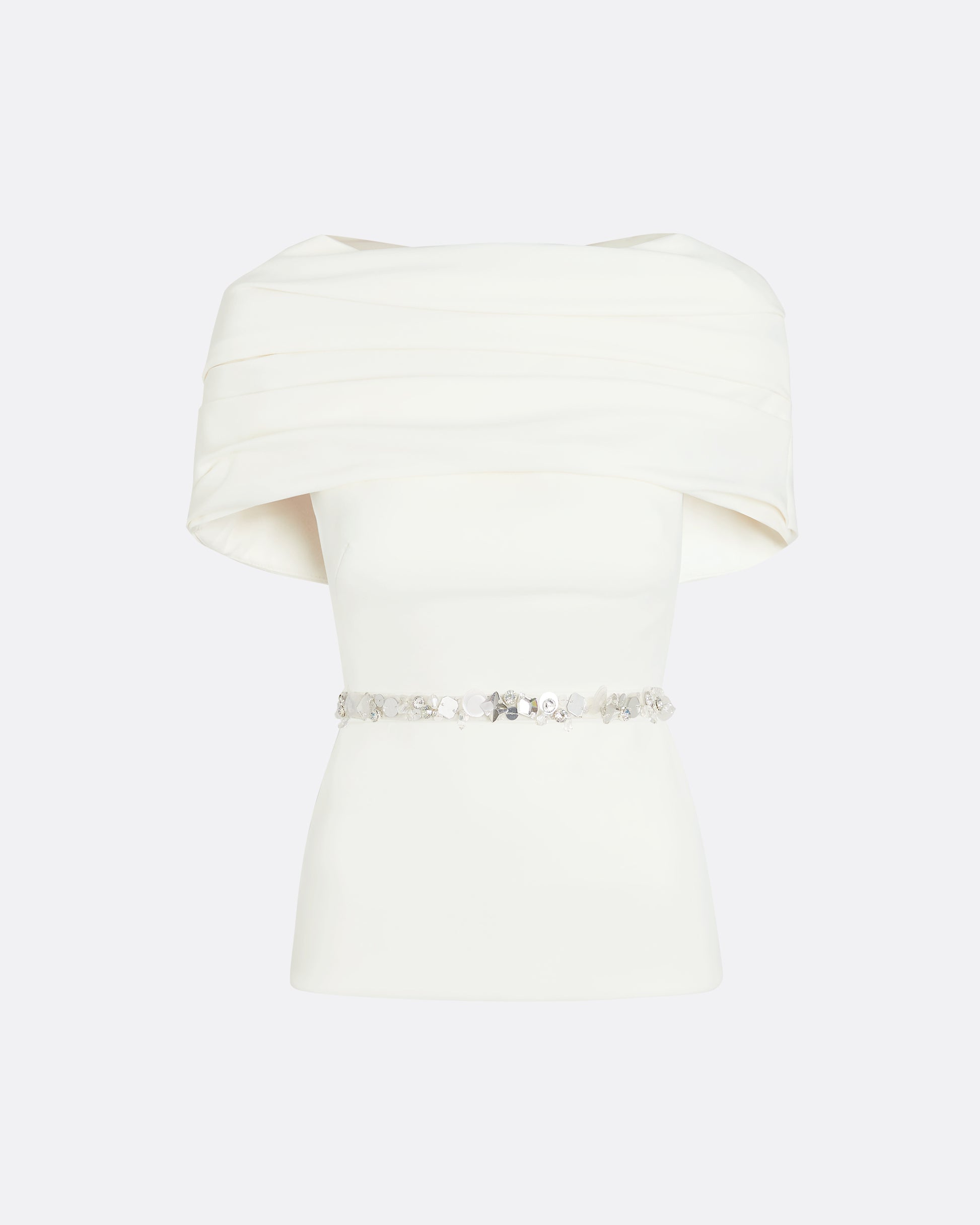Top with attached pleated cape and peplum in ivory Heavy Crepe with crystal Elisabetta Trim embroidery.