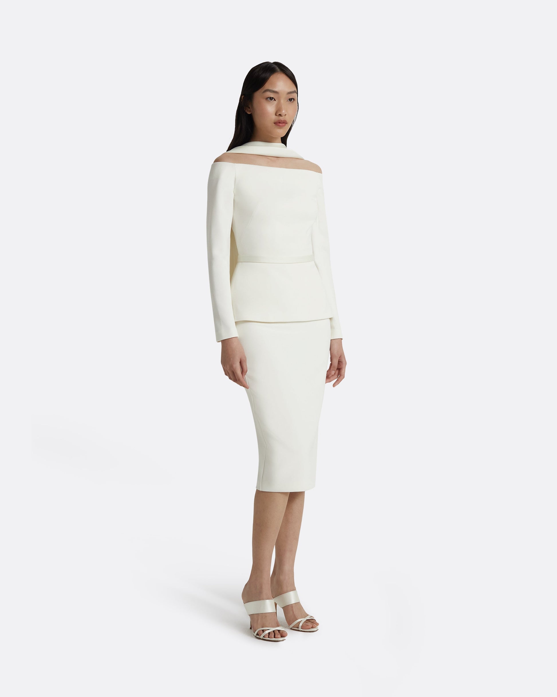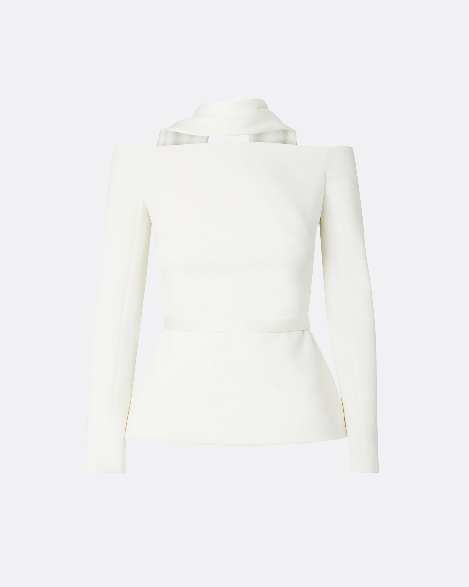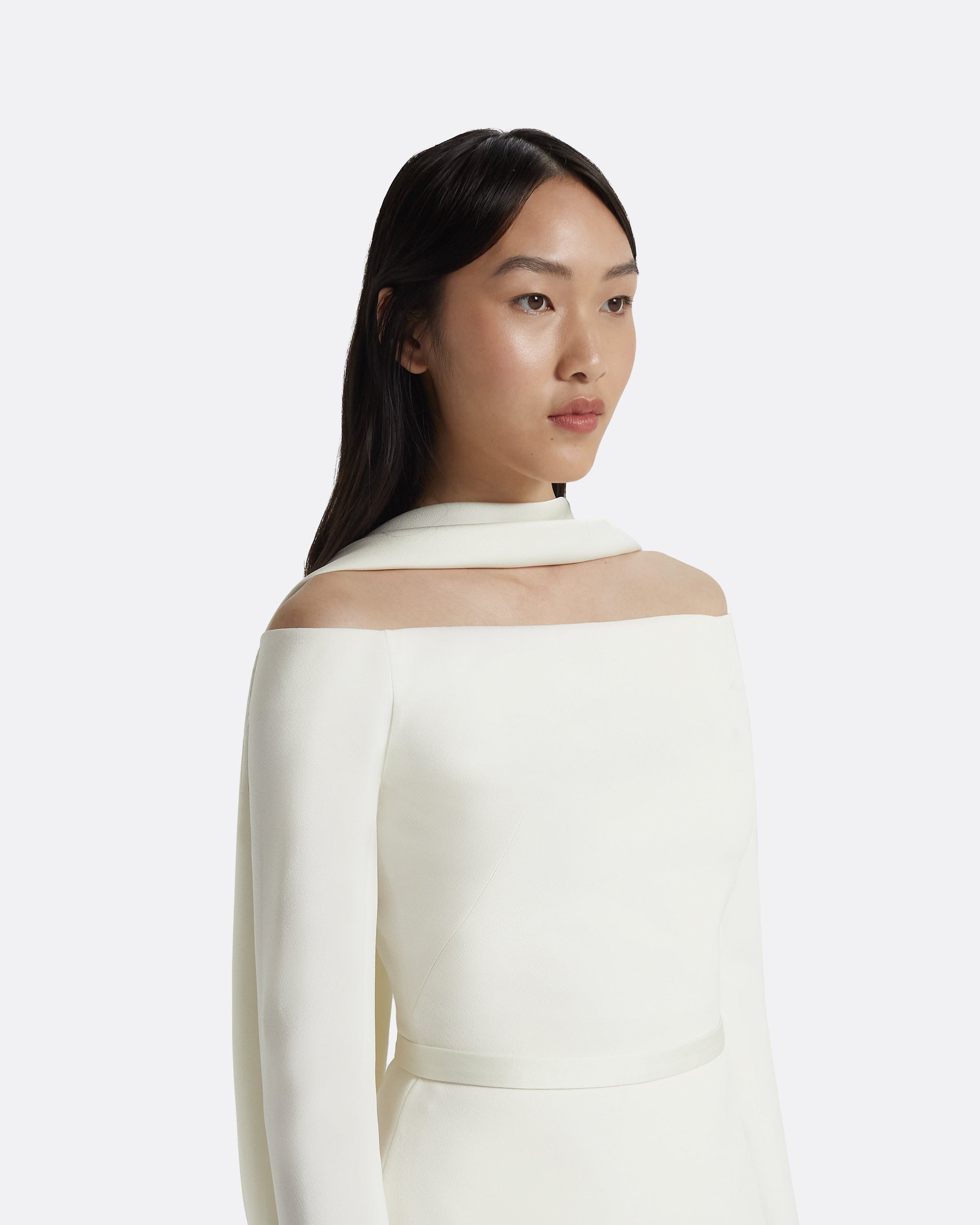 Off the shoulder top with sleeves and scarf drape in ivory Heavy Crepe and Satin Back Crepe.