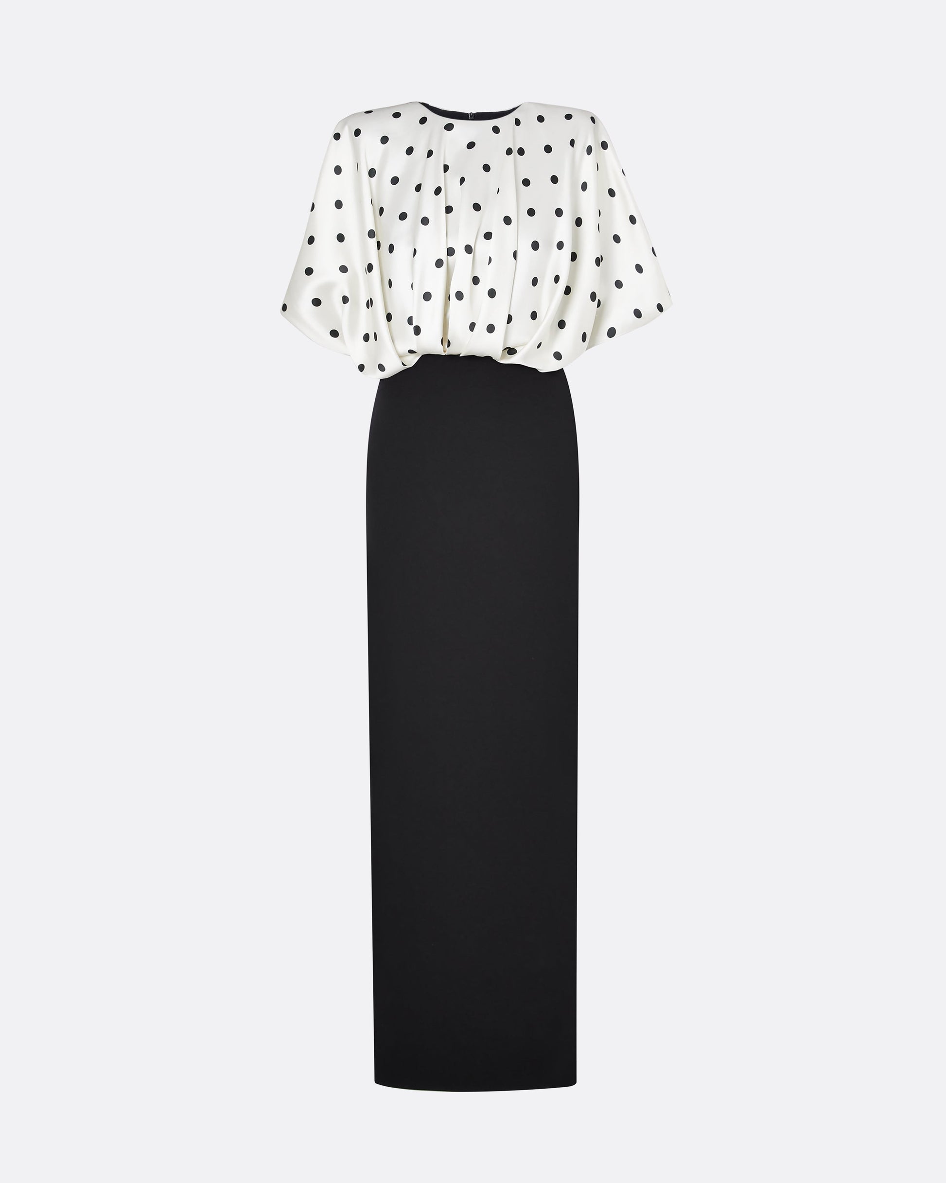 Gown with structured shoulder and draped bodice in egret/ black Polka Heavy Satin on black Heavy Crepe.