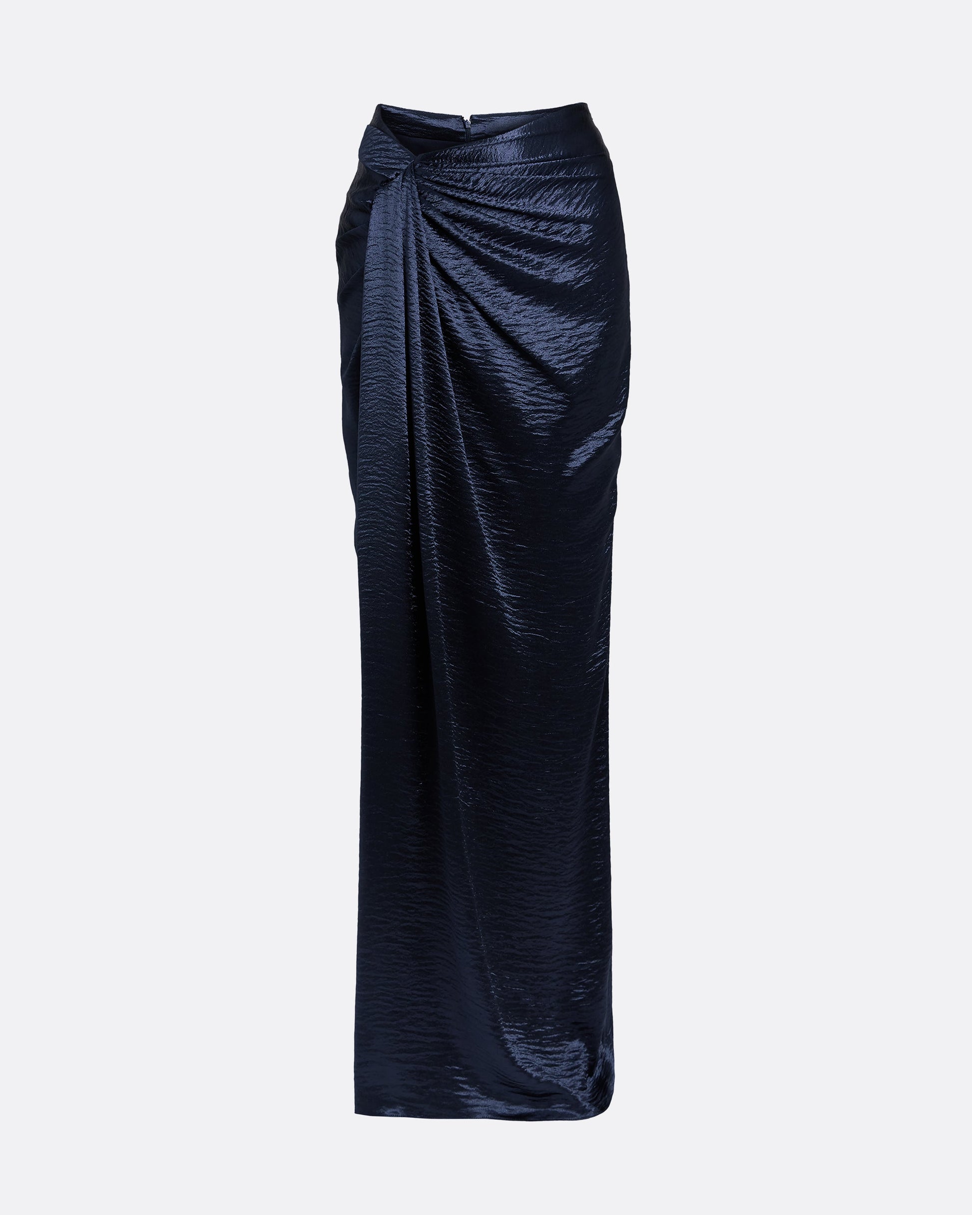 Long skirt with drape and slit detail in maritime Crushed Satin.