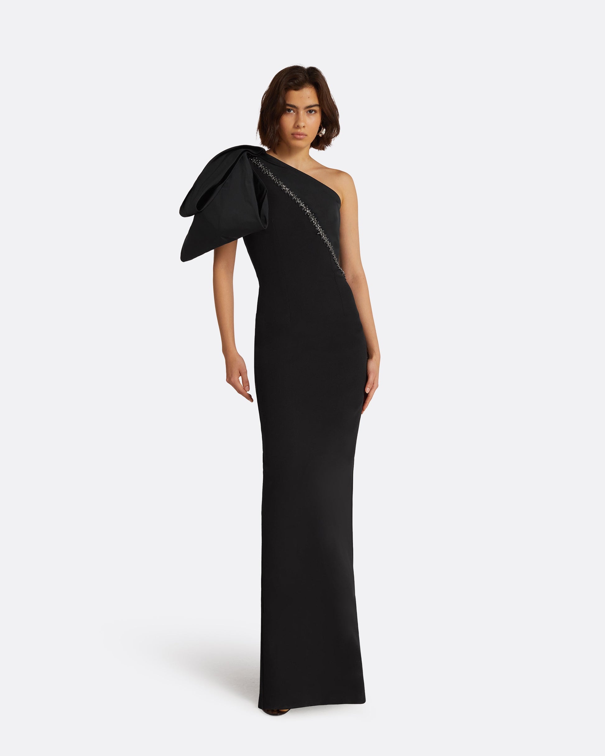 Asymmetric shouldered gown with statement bow drape detail in black Heavy Crepe and Faille, with Geometrica embroidery.