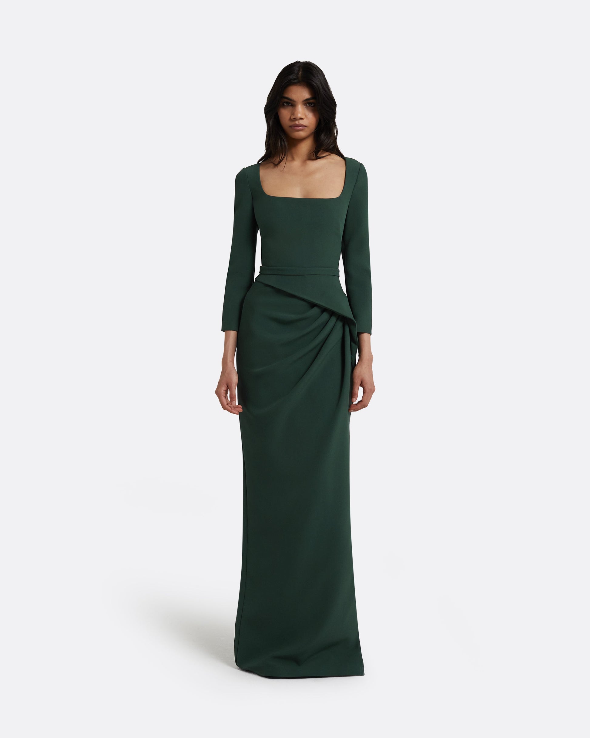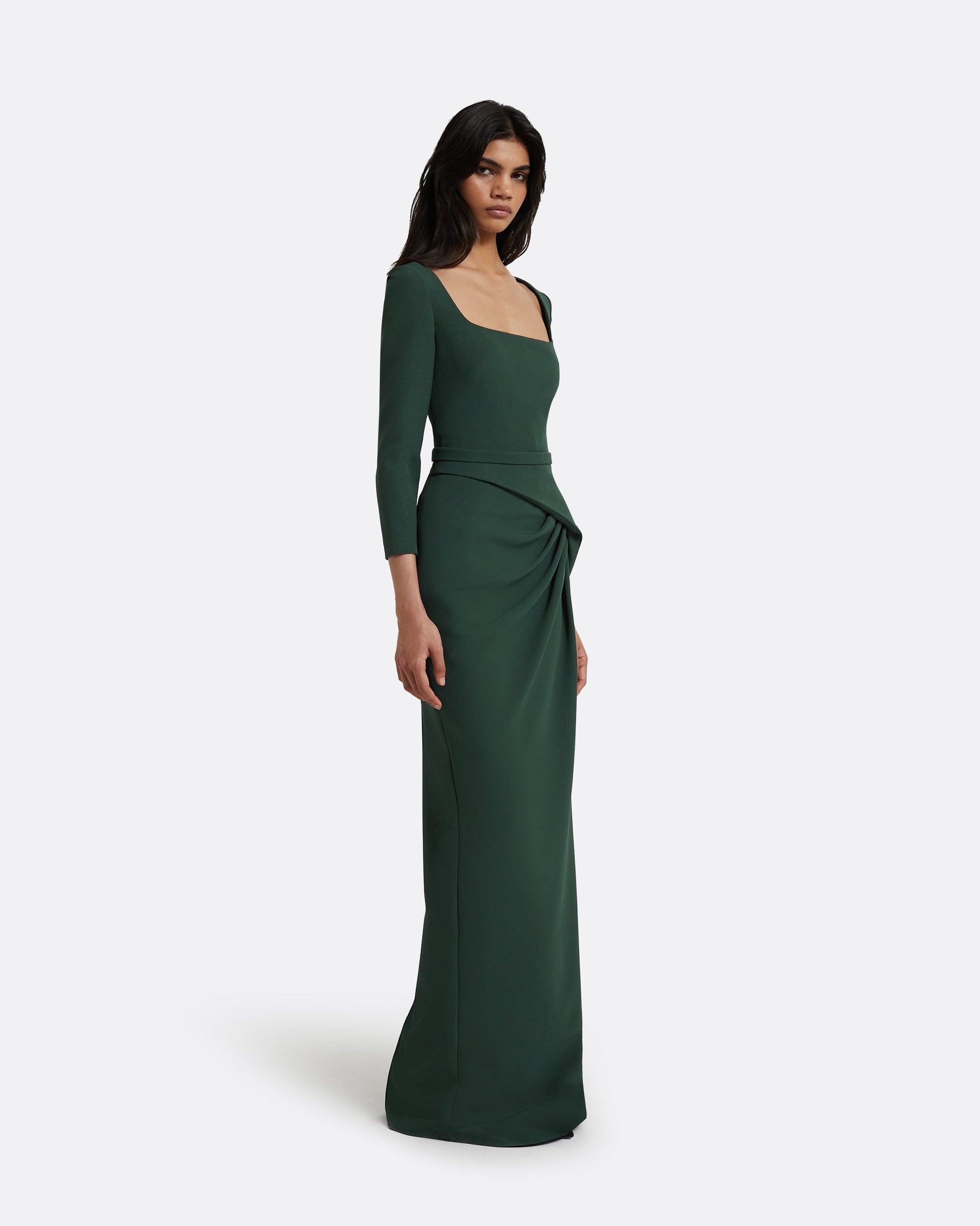 Gown with square neck with drape detail in darkest spruce Heavy Crepe.