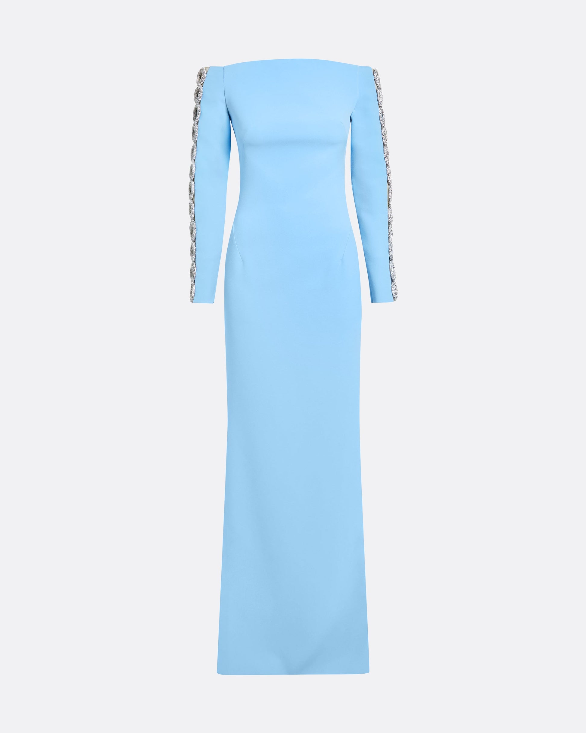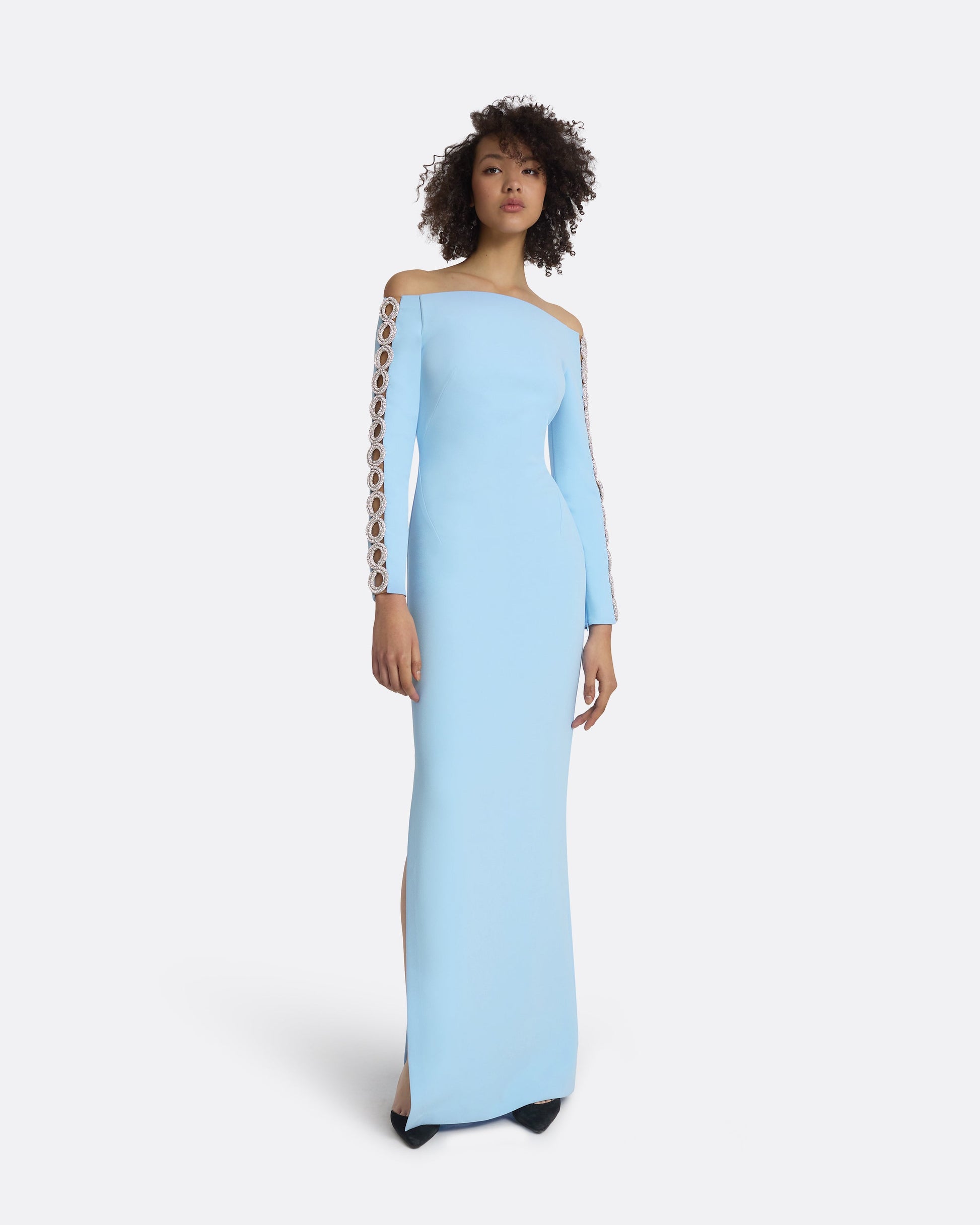 Floor length gown with off the shoulder neckline and side slit detail in vista Heavy Crepe with Crystal Chain embroidery.