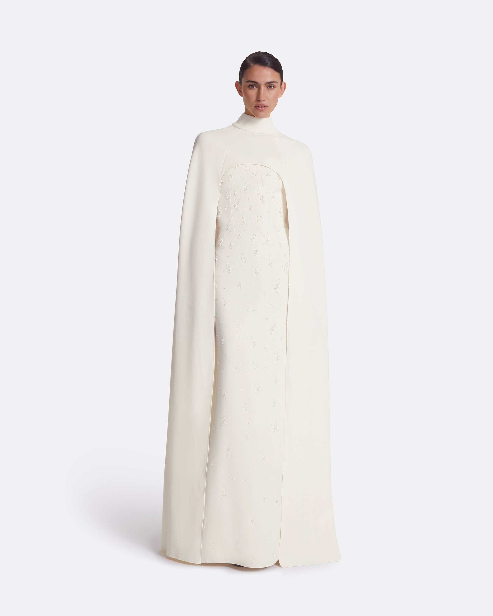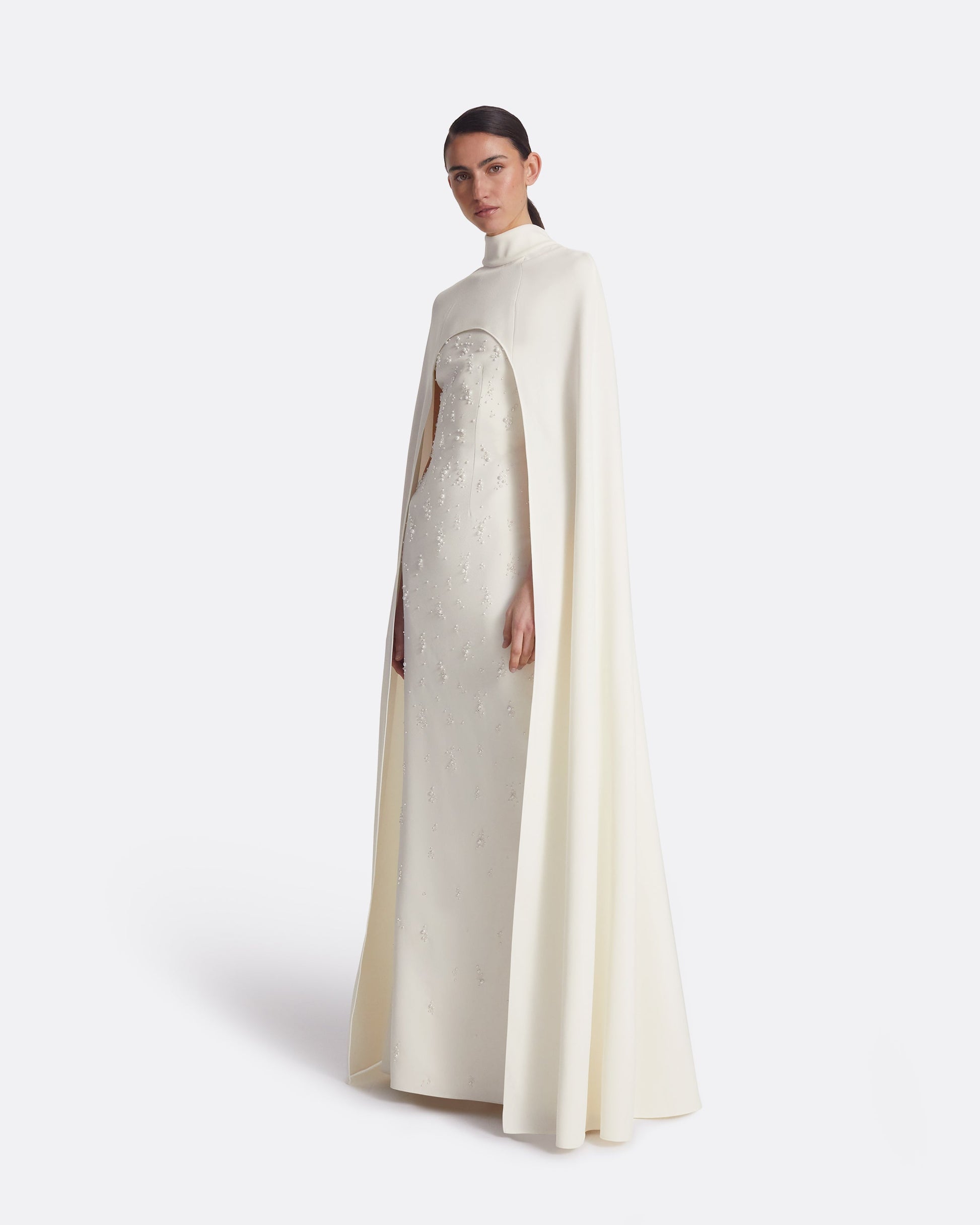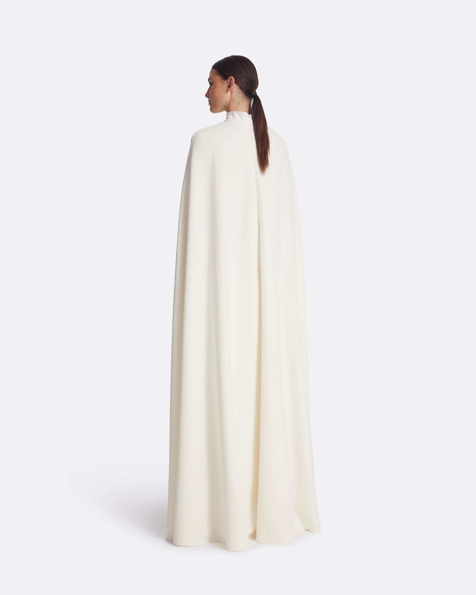 Statement high neck cape with curved line opening in ivory Heavy Crepe.