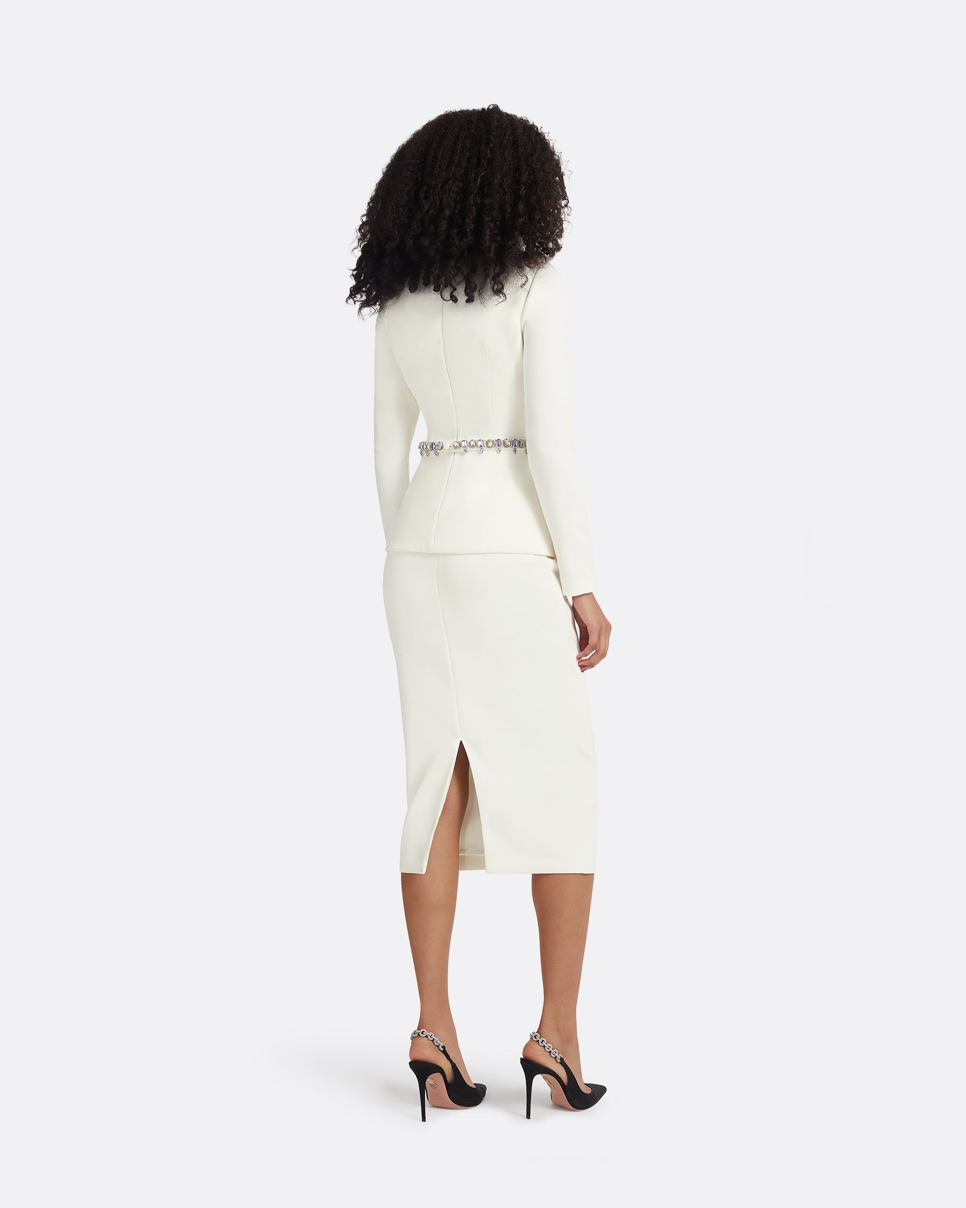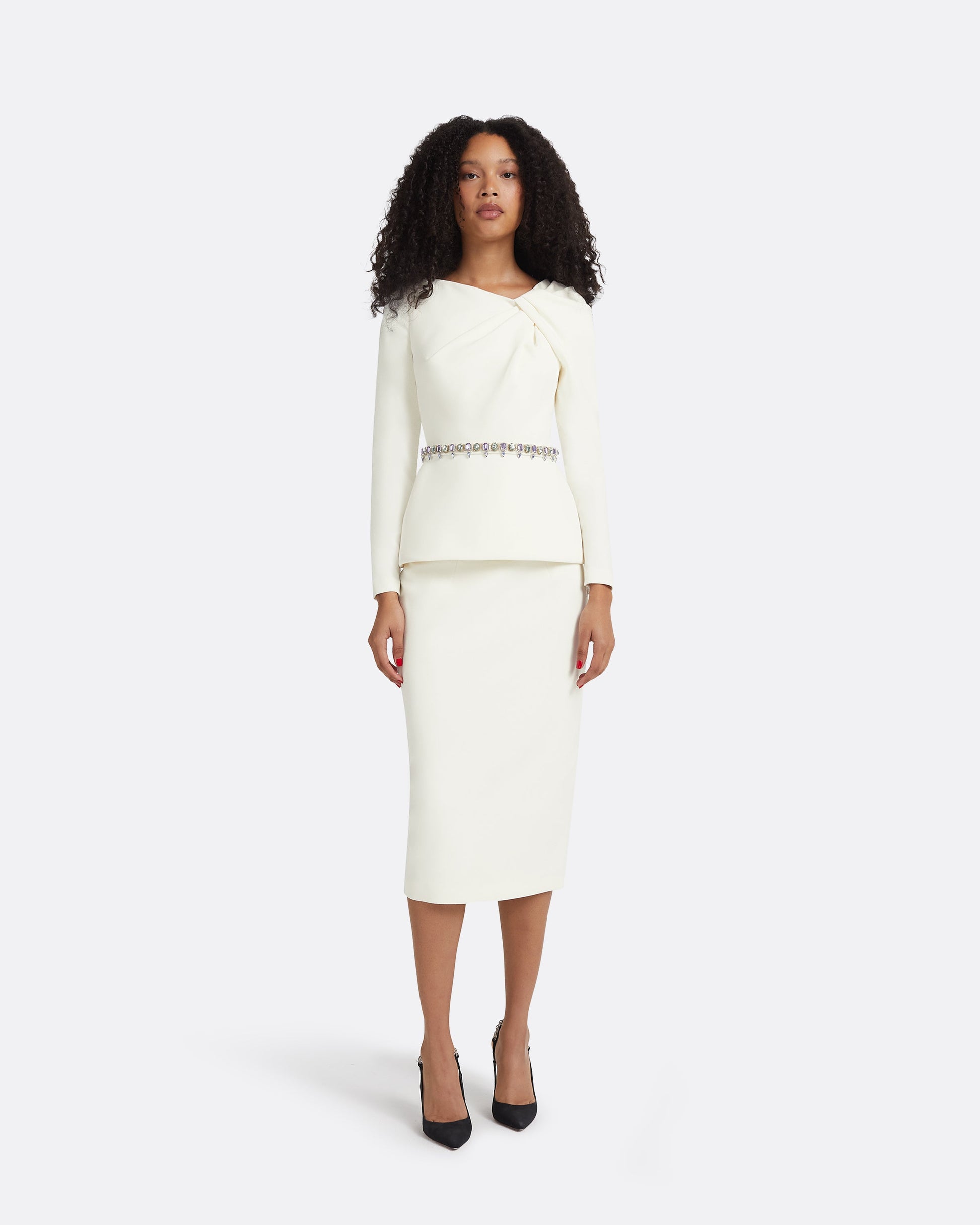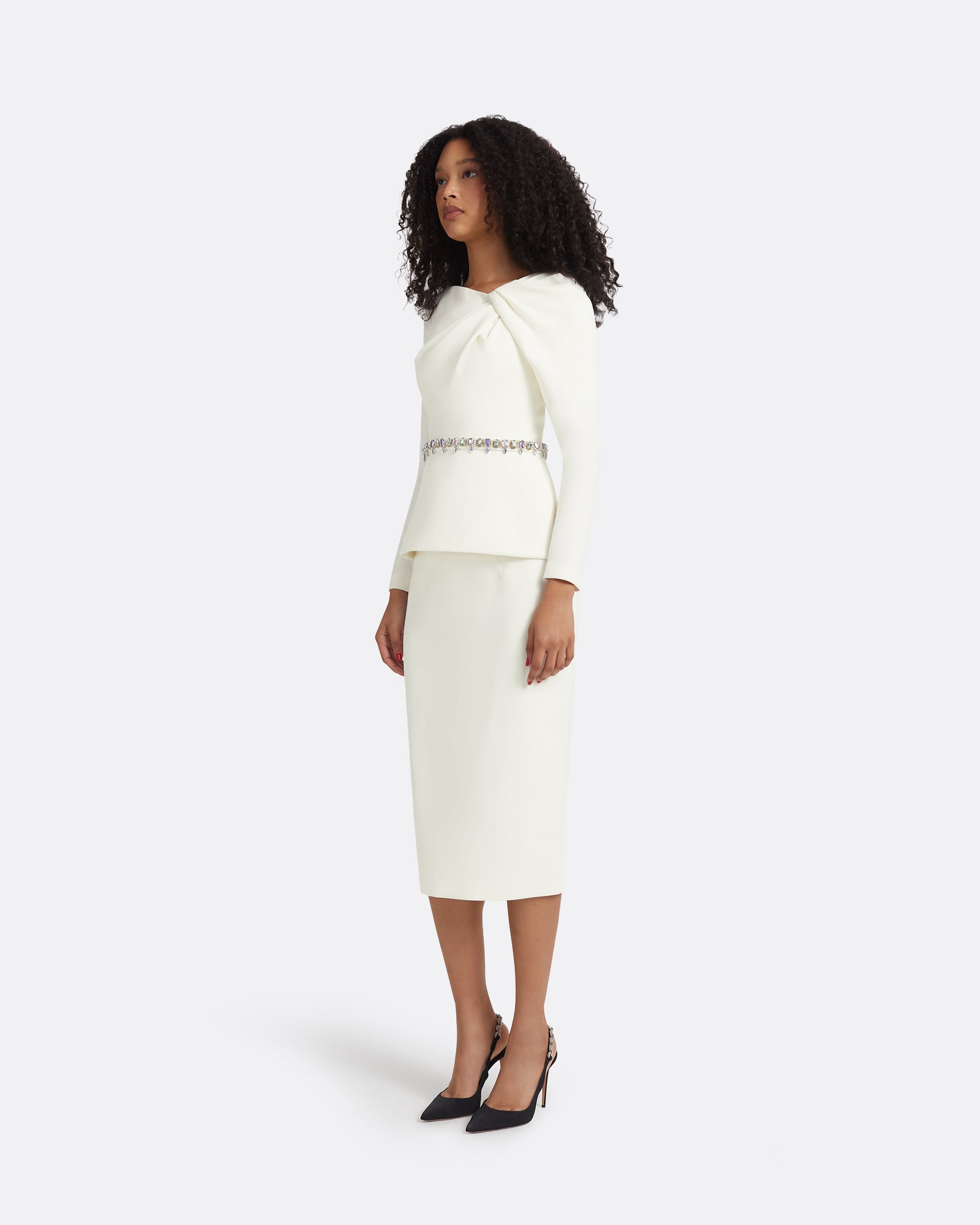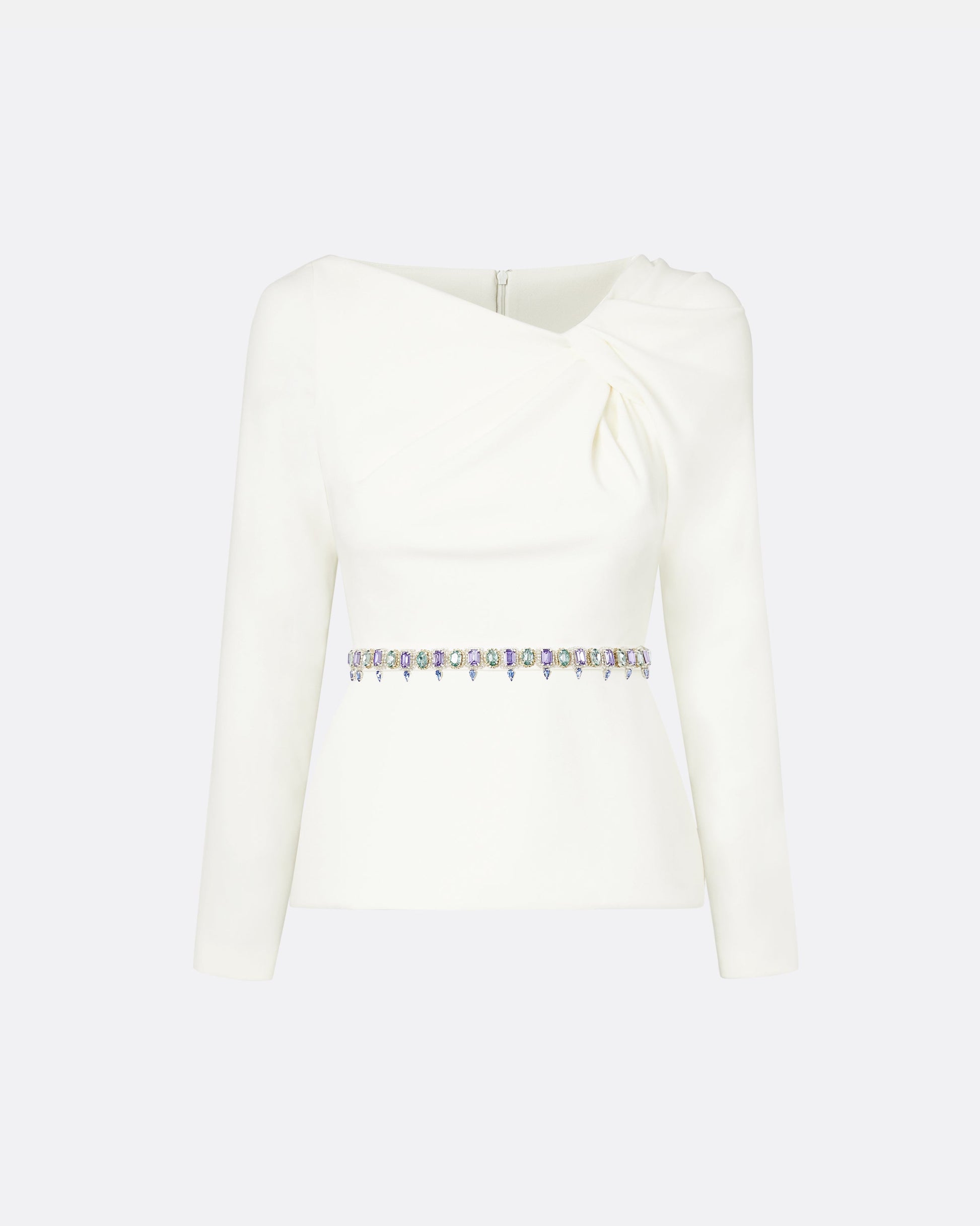 Long sleeved top with twisted drape neckline in ivory Heavy Crepe with verbena Adorned Trim Chain embroidery.