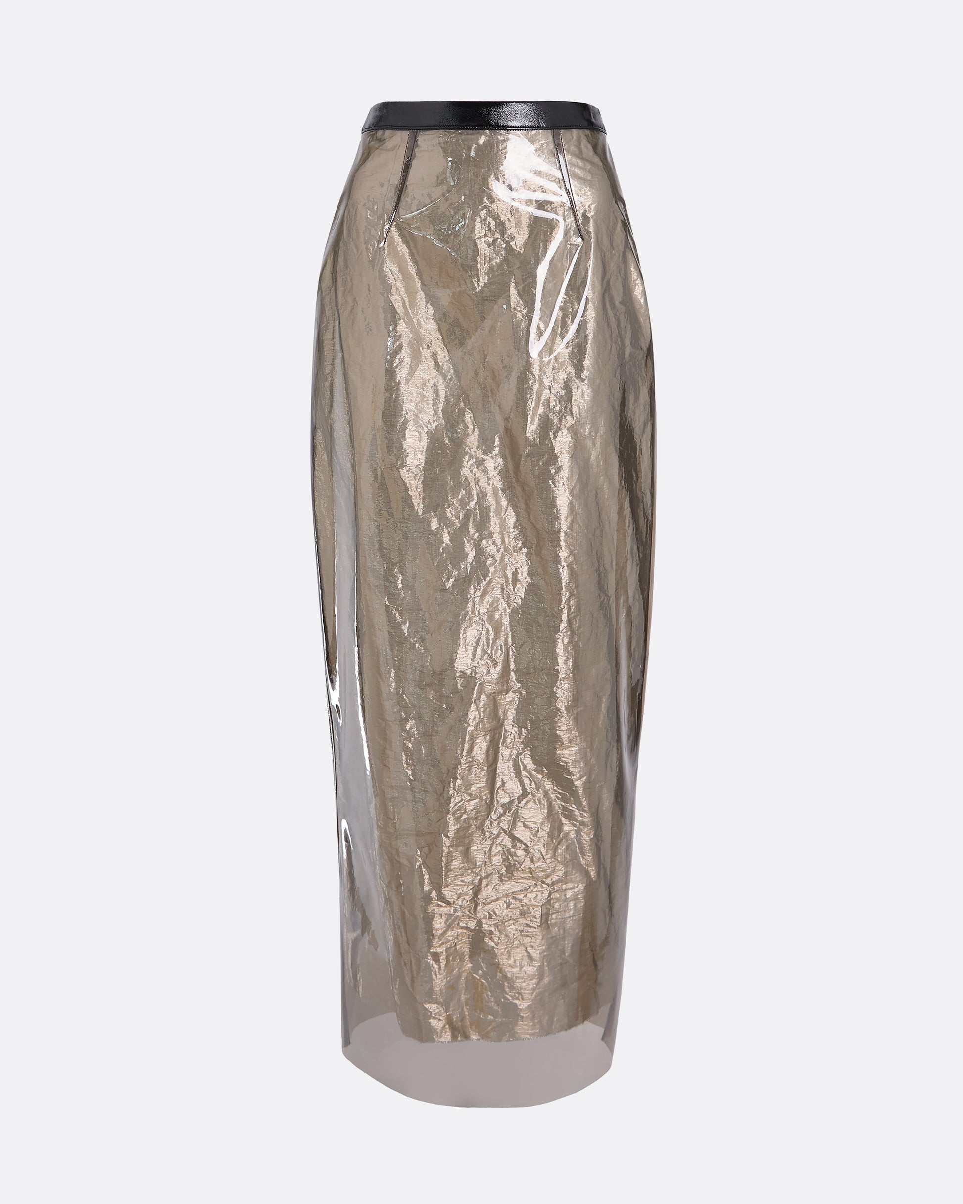 Midi, sheath skirt in astronaut Crushed Metallic on taupe Transparent PVC.