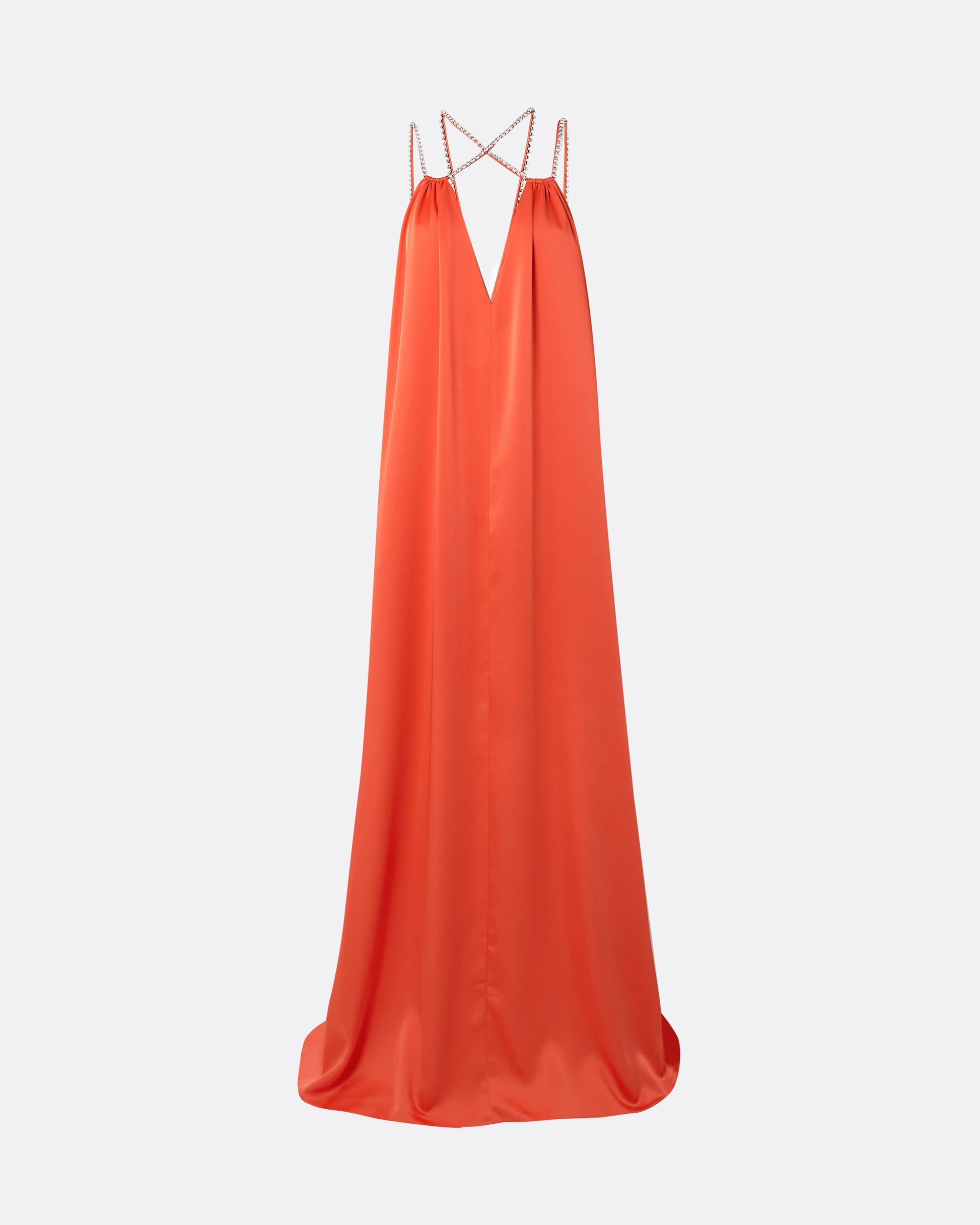 Trapeze style gown with plunging neckline in reef Light Satin Back Crepe with Crystal Wave Chain.