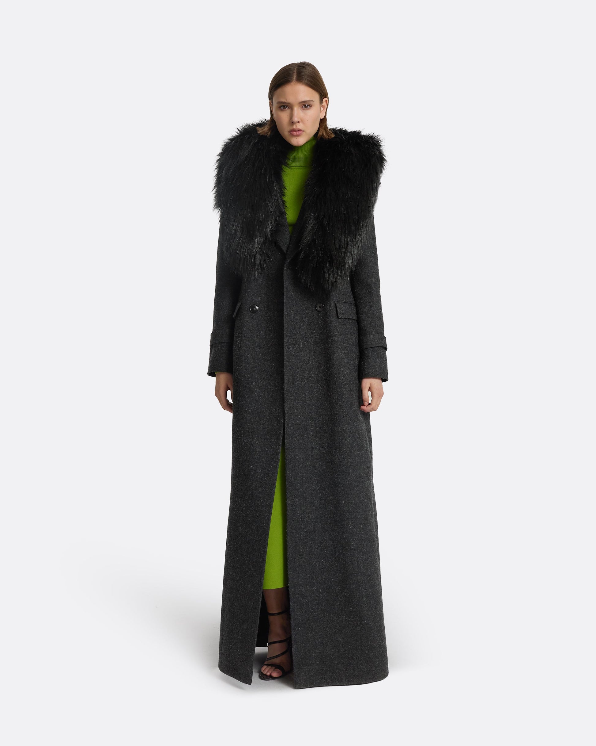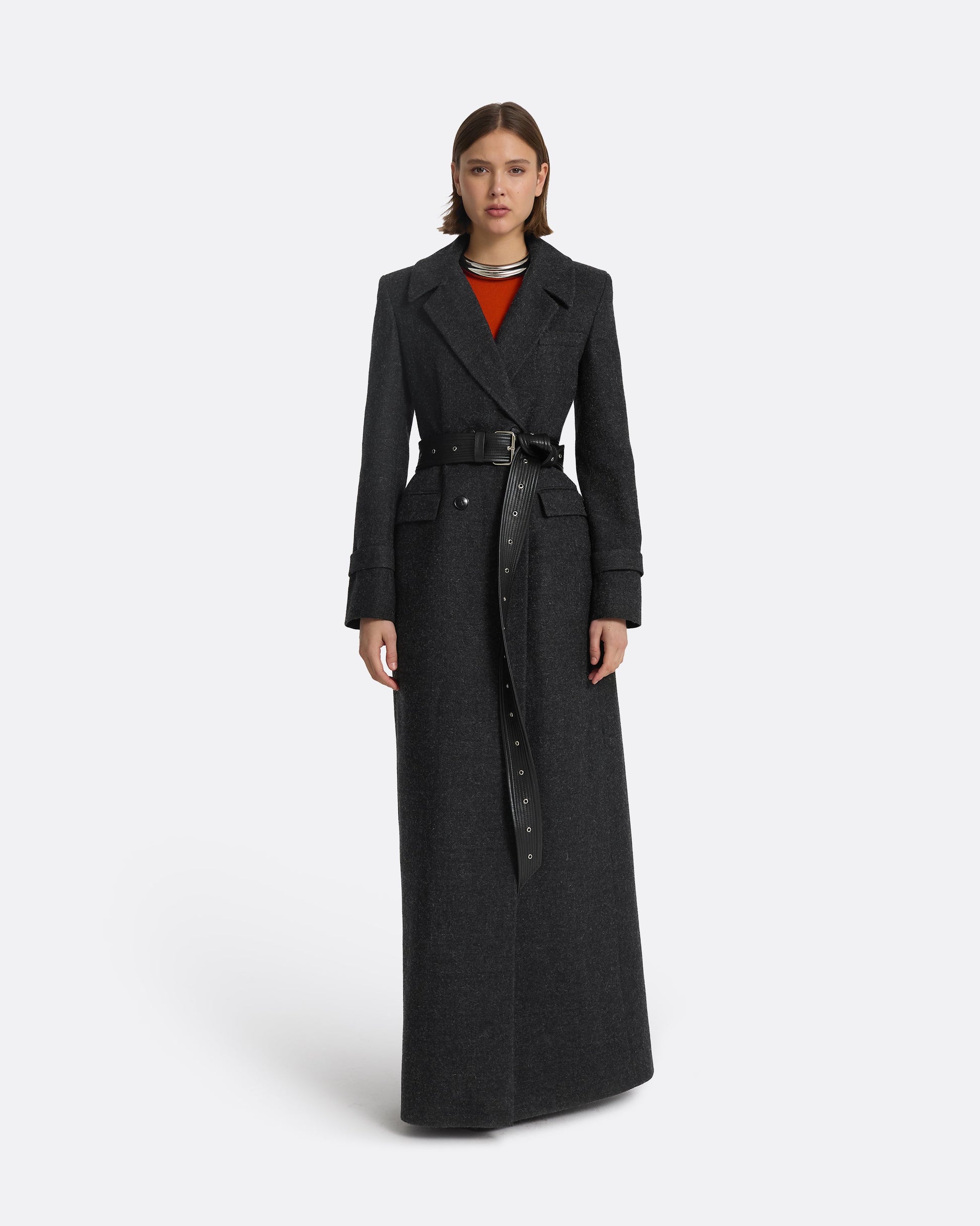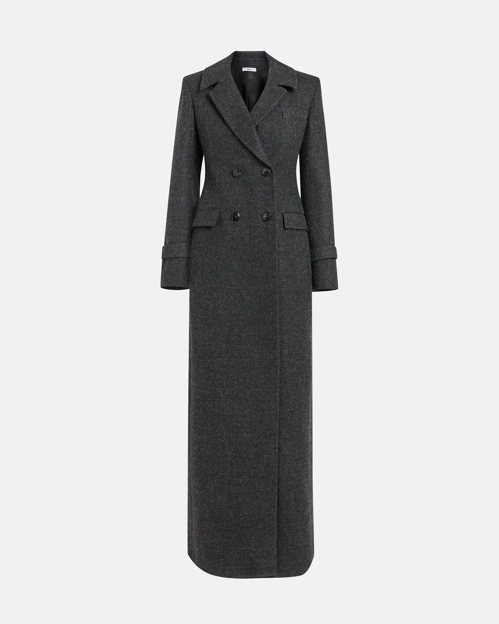 Floor length, double breasted coat with classic tailoring details including two welt pockets with flap in speckled grey Heavy Wool.