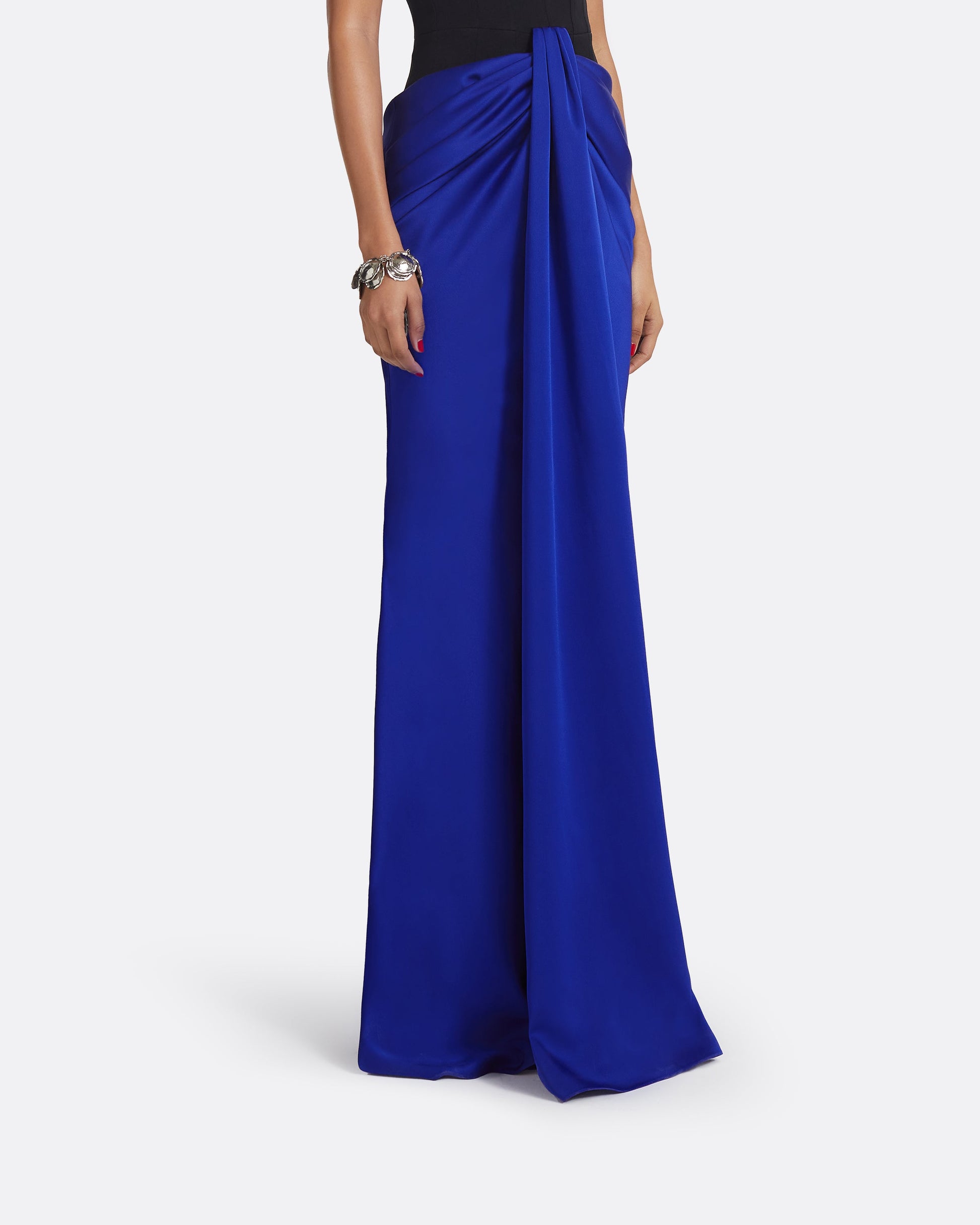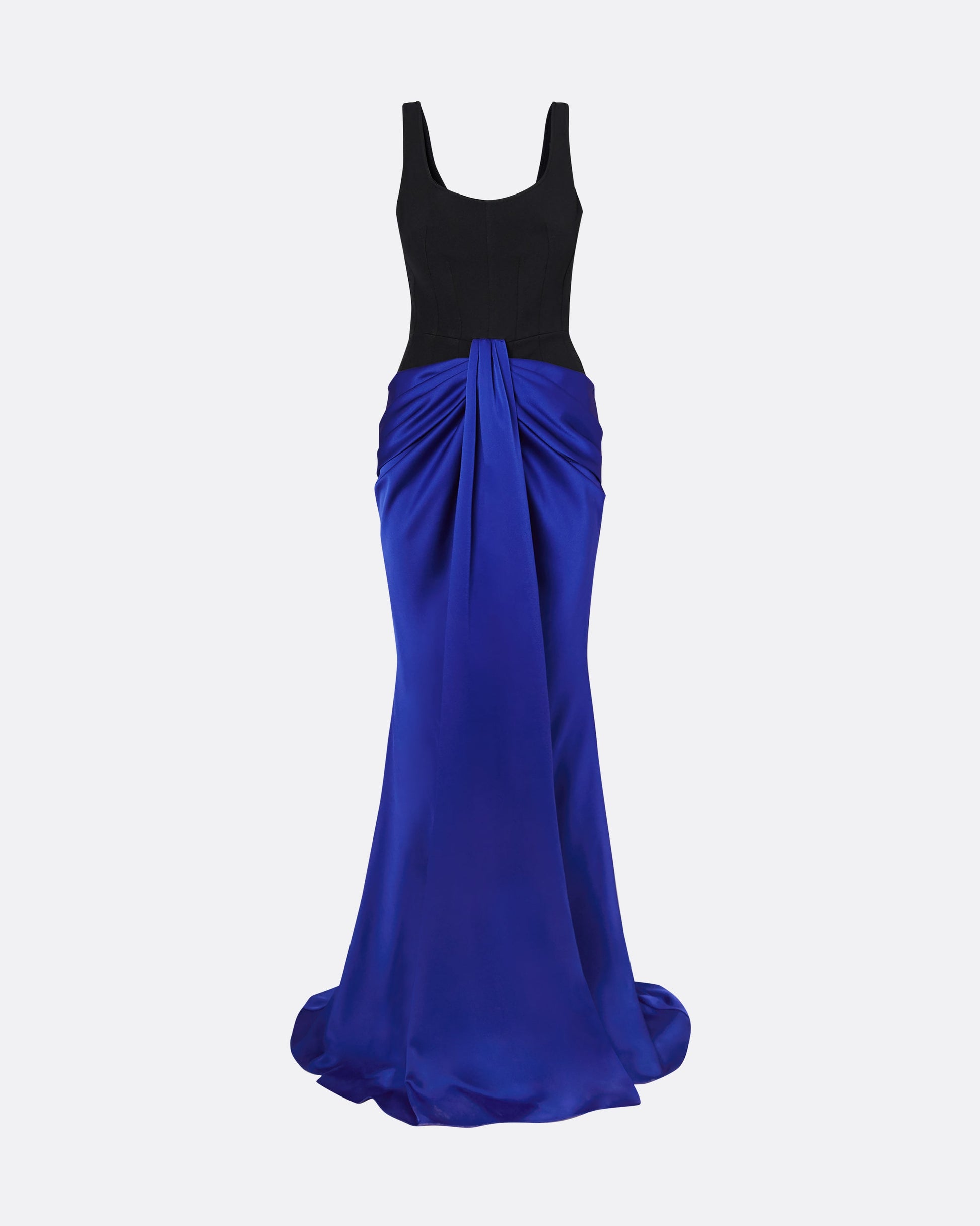 Gown with scoop neck, corseting and draped skirt in marrakech Light Satin Back Crepe on black Heavy Crepe.