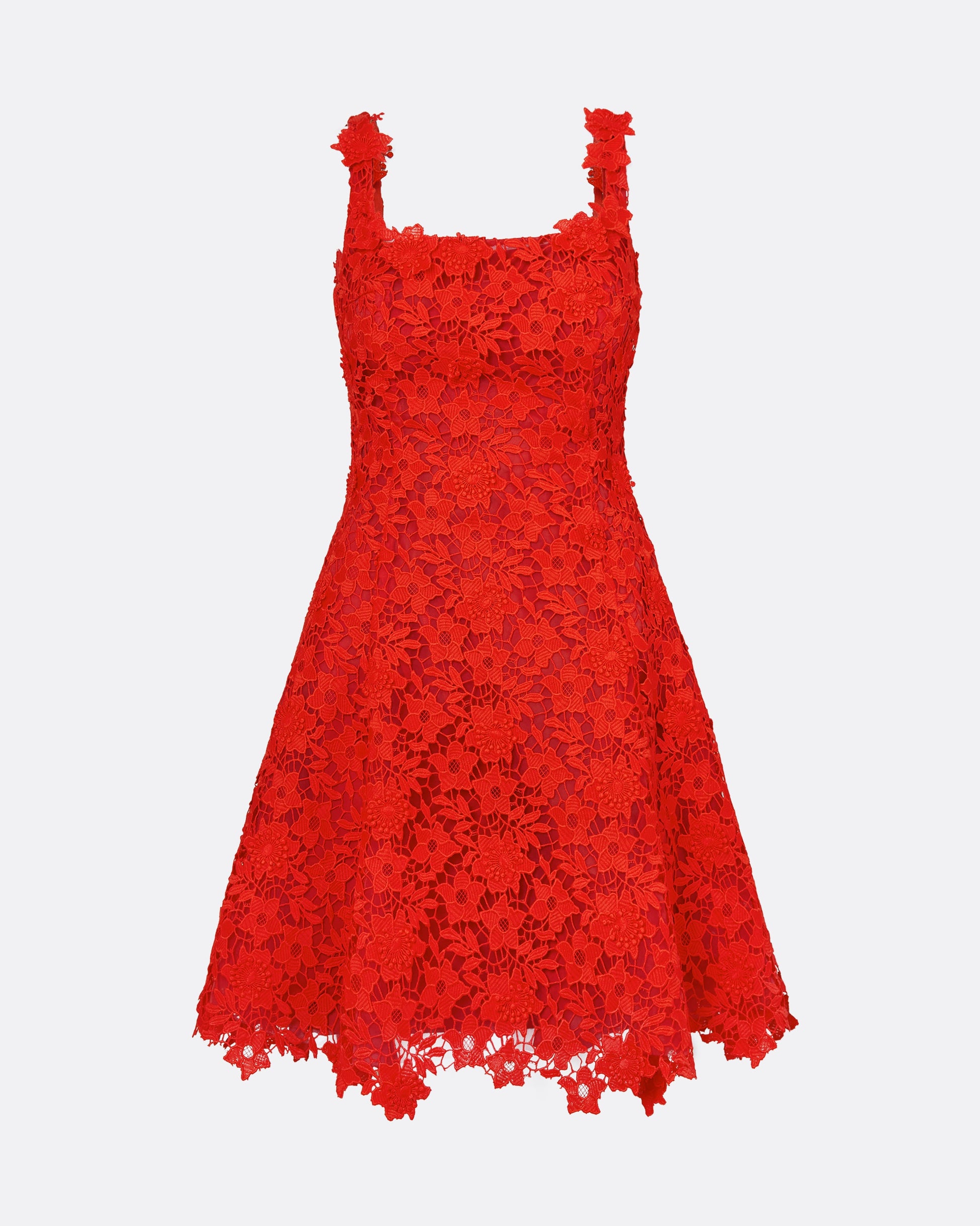 Mini, A line dress with square neckline in lacquer red Picasso Lace.