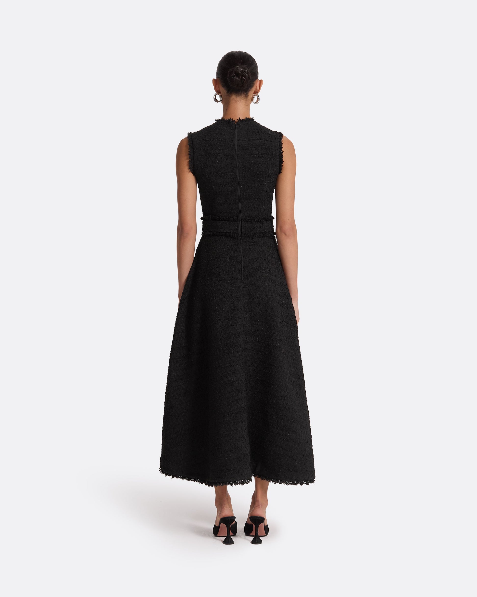 Crew neck dress with full skirt and seam detail in black Munich Tweed.