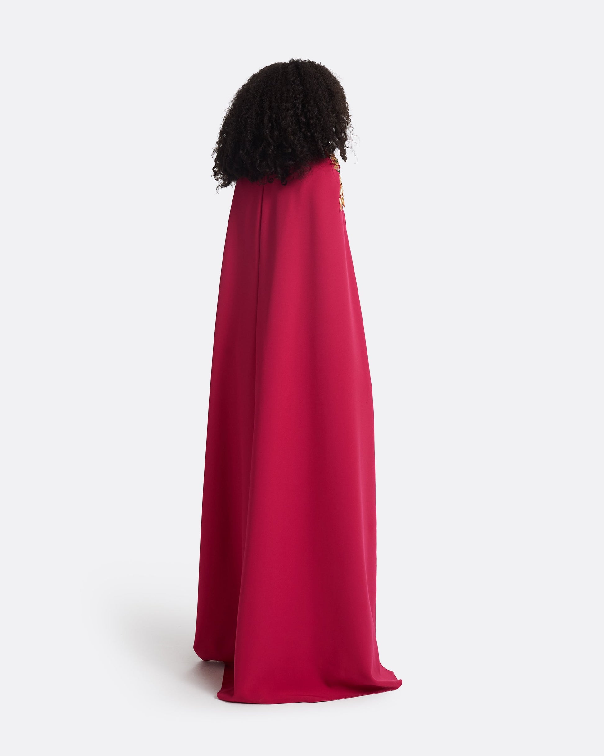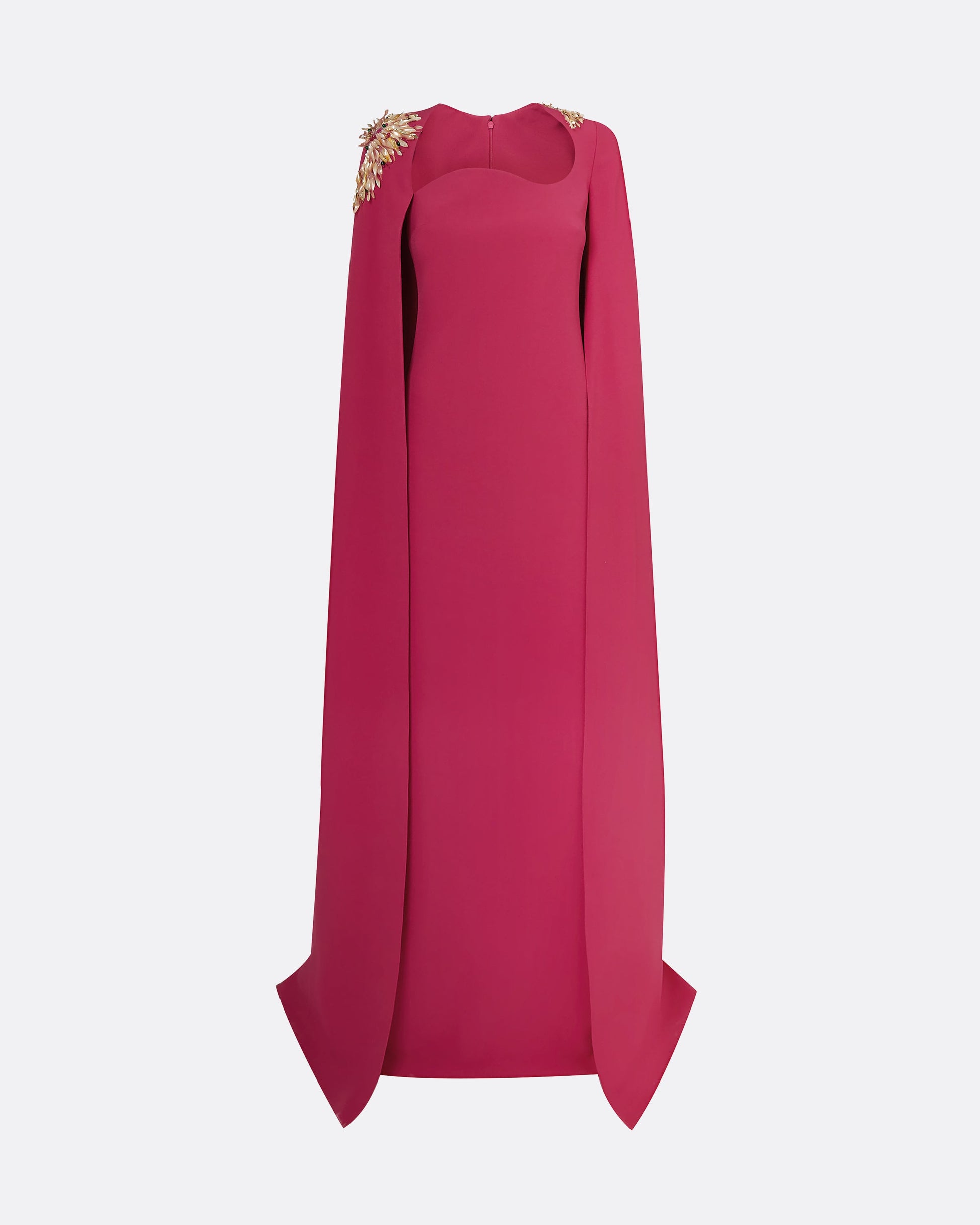 A-line gown with relaxed waist and curved neckline in granita Heavy Crepe with gold Fossil Motif embroidery.