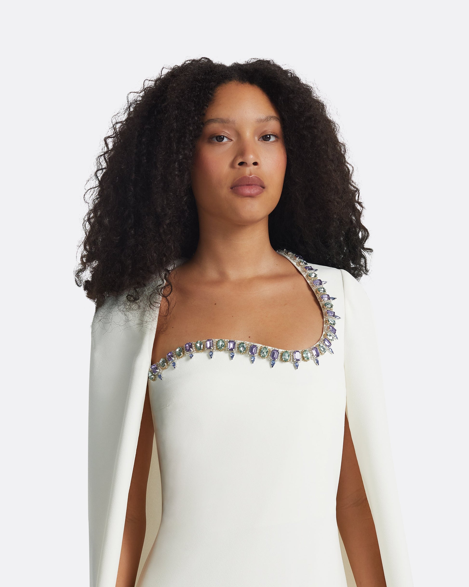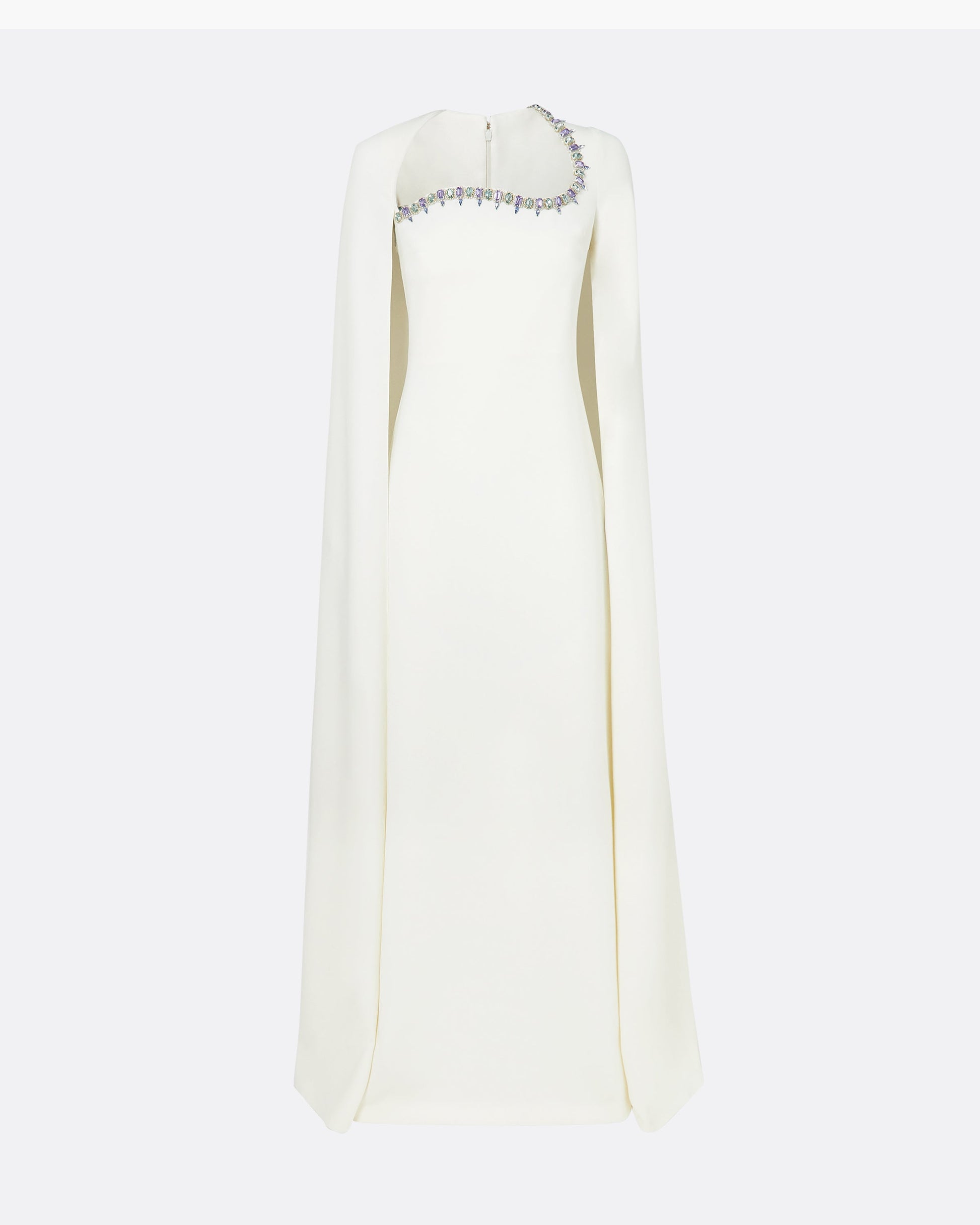 A-line gown with relaxed waist and curved neckline in ivory Heavy Crepe with verbena Adorned Trim Chain embroidery.