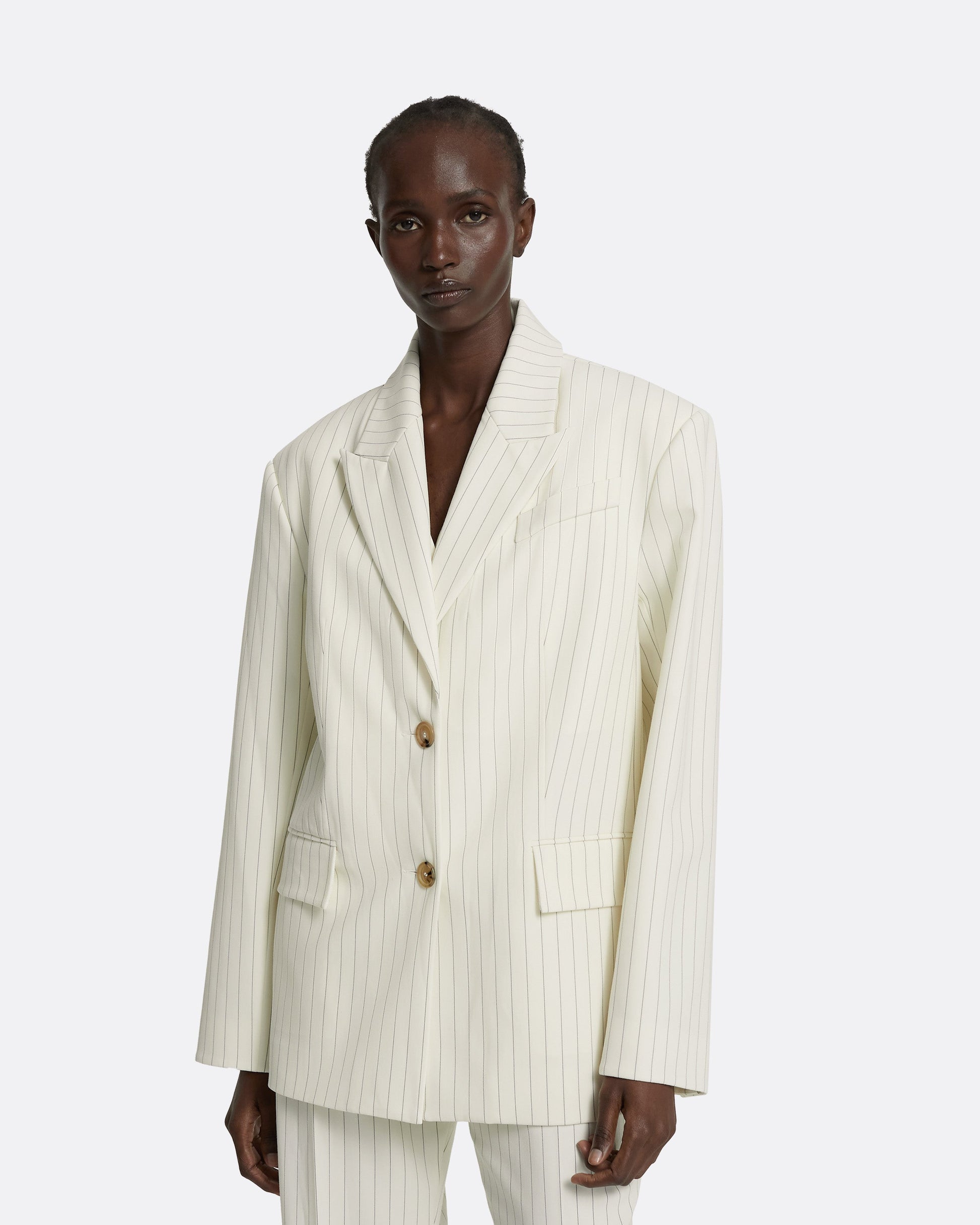 Classic, relaxed oversized blazer in ivory pinstripe.