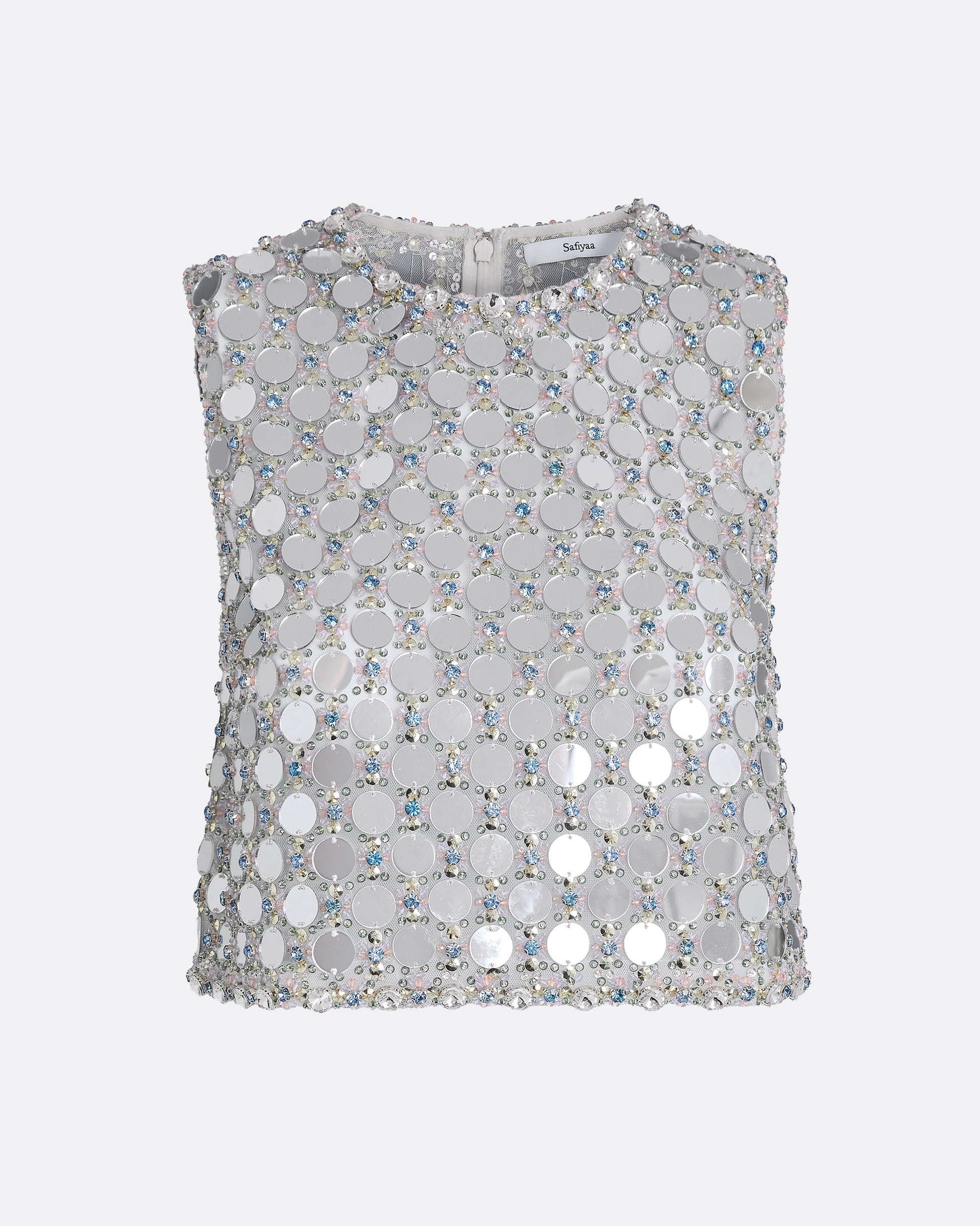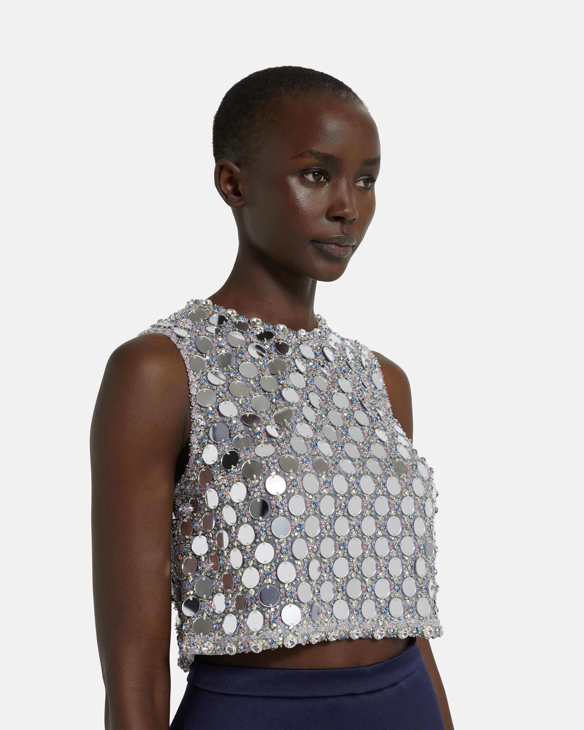 Sleeveless, embellished top in ivory Light Tulle with multi-pastel Recchi embroidery.