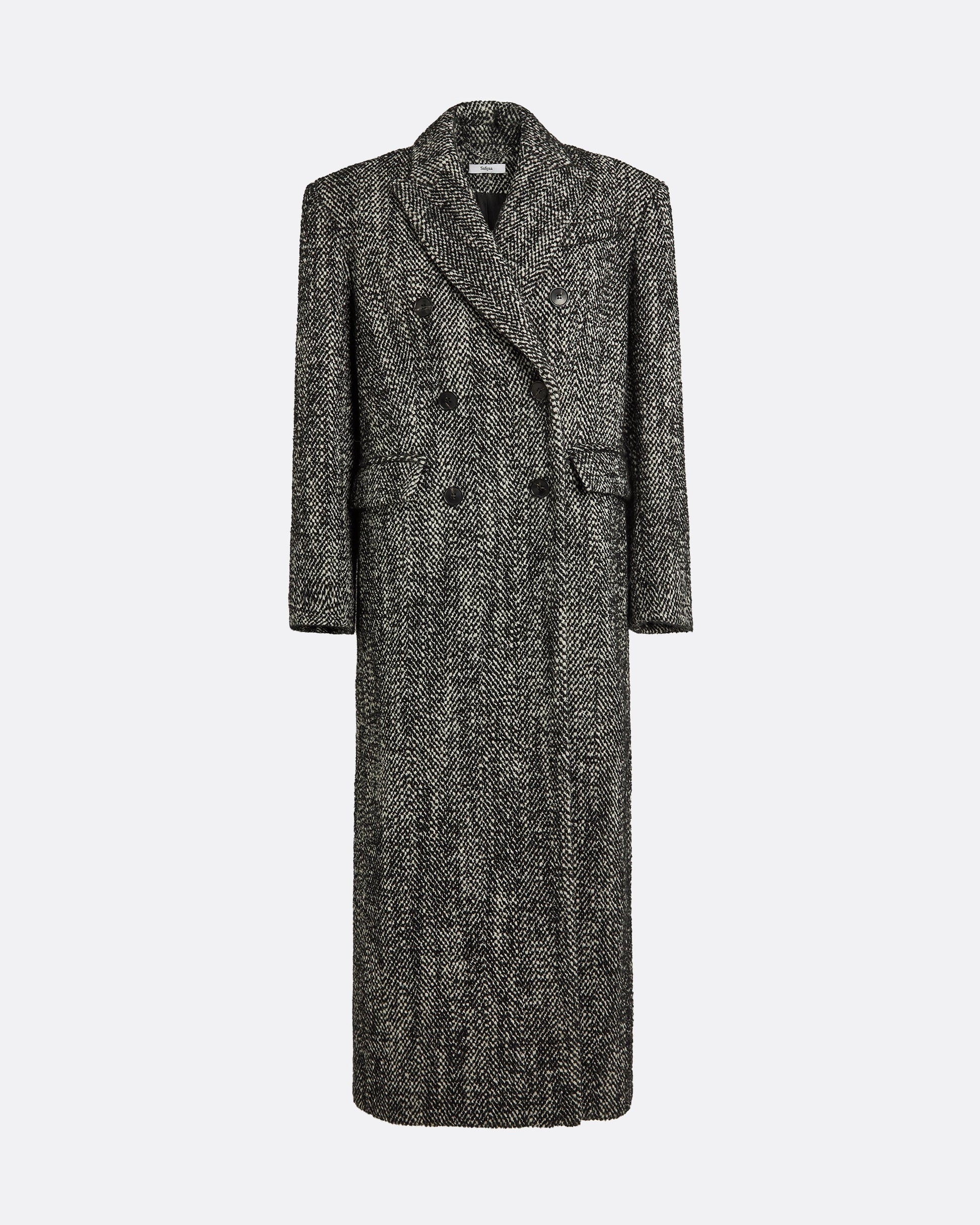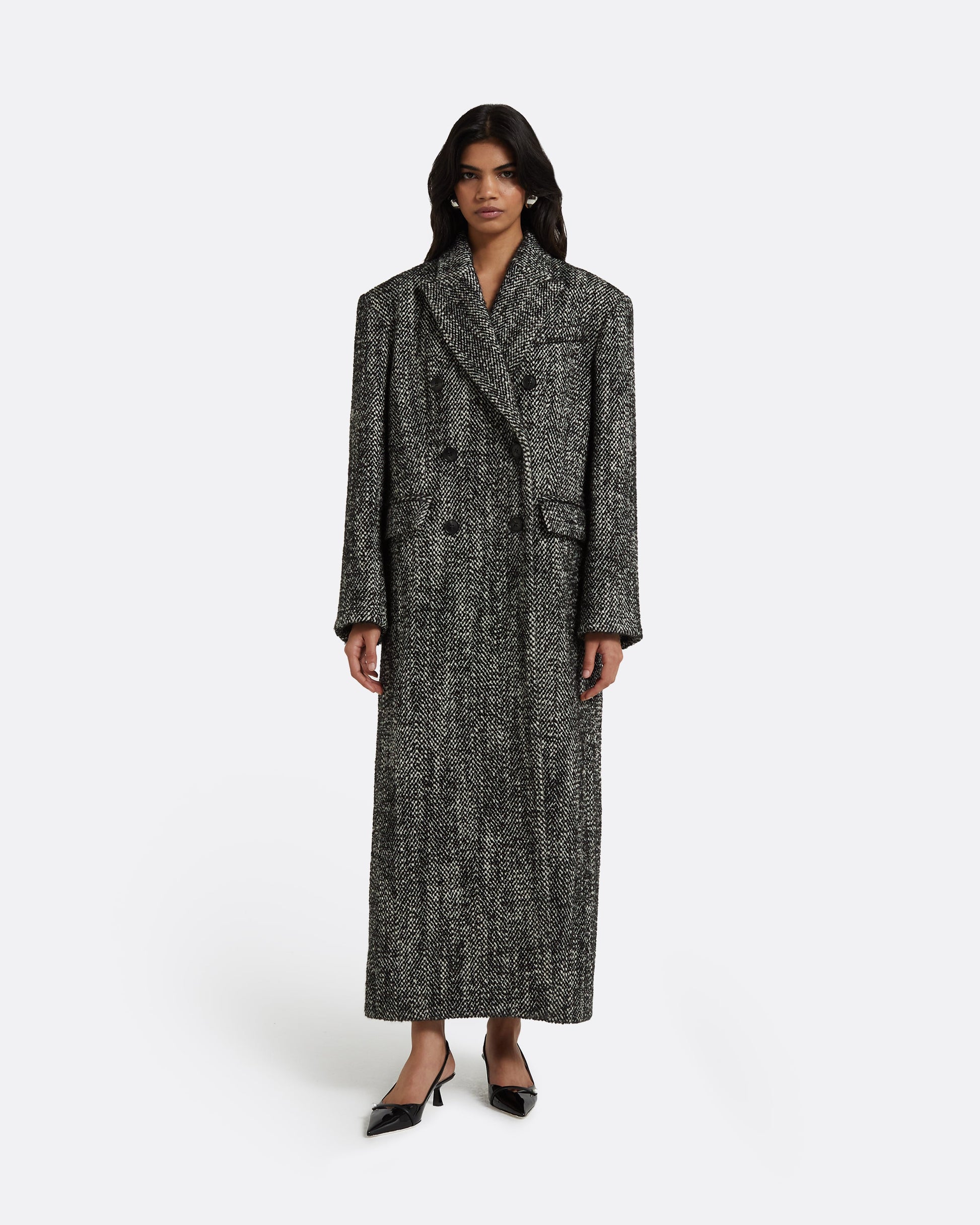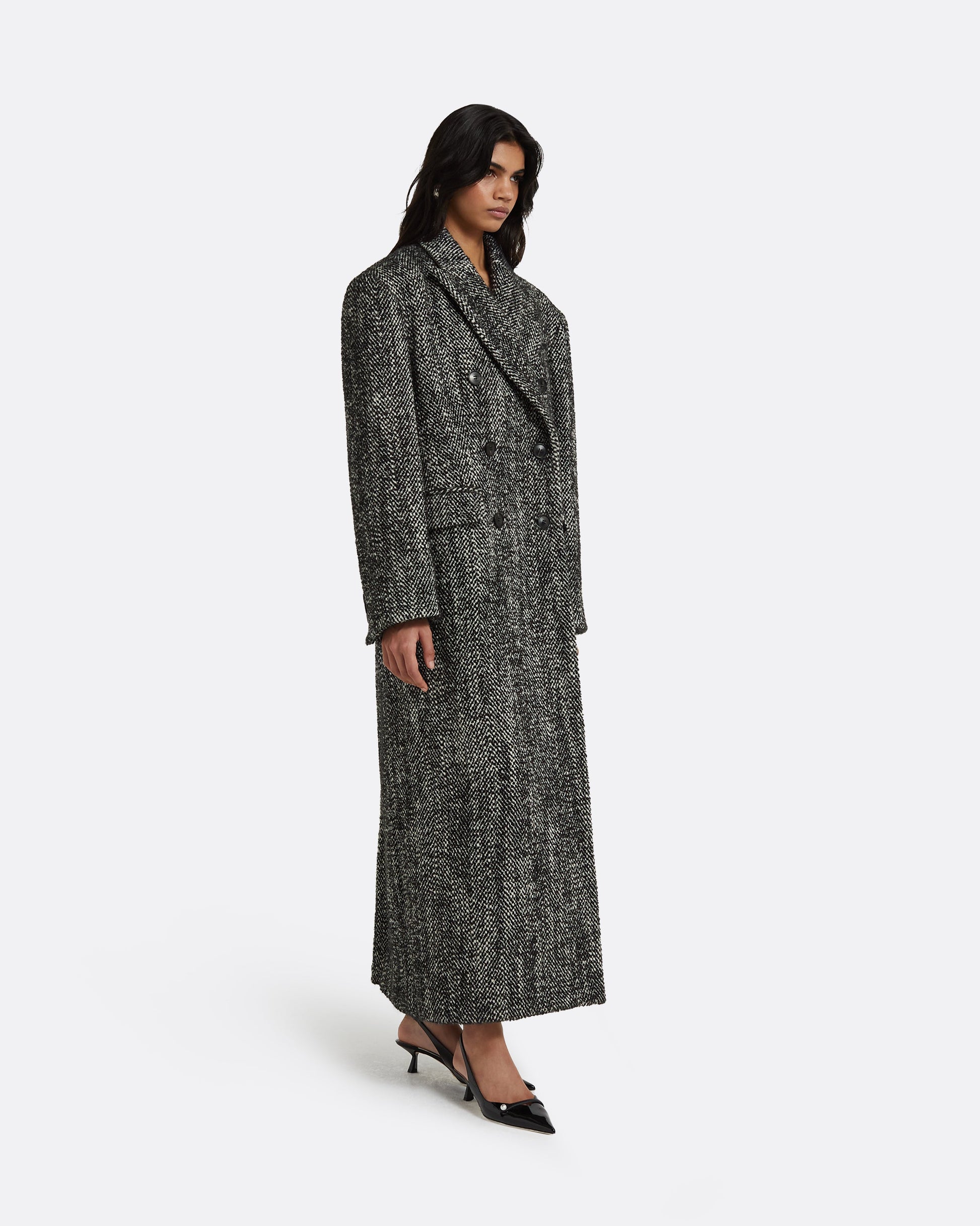 Double-breasted, tailored over coat in black Herringbone Wool.