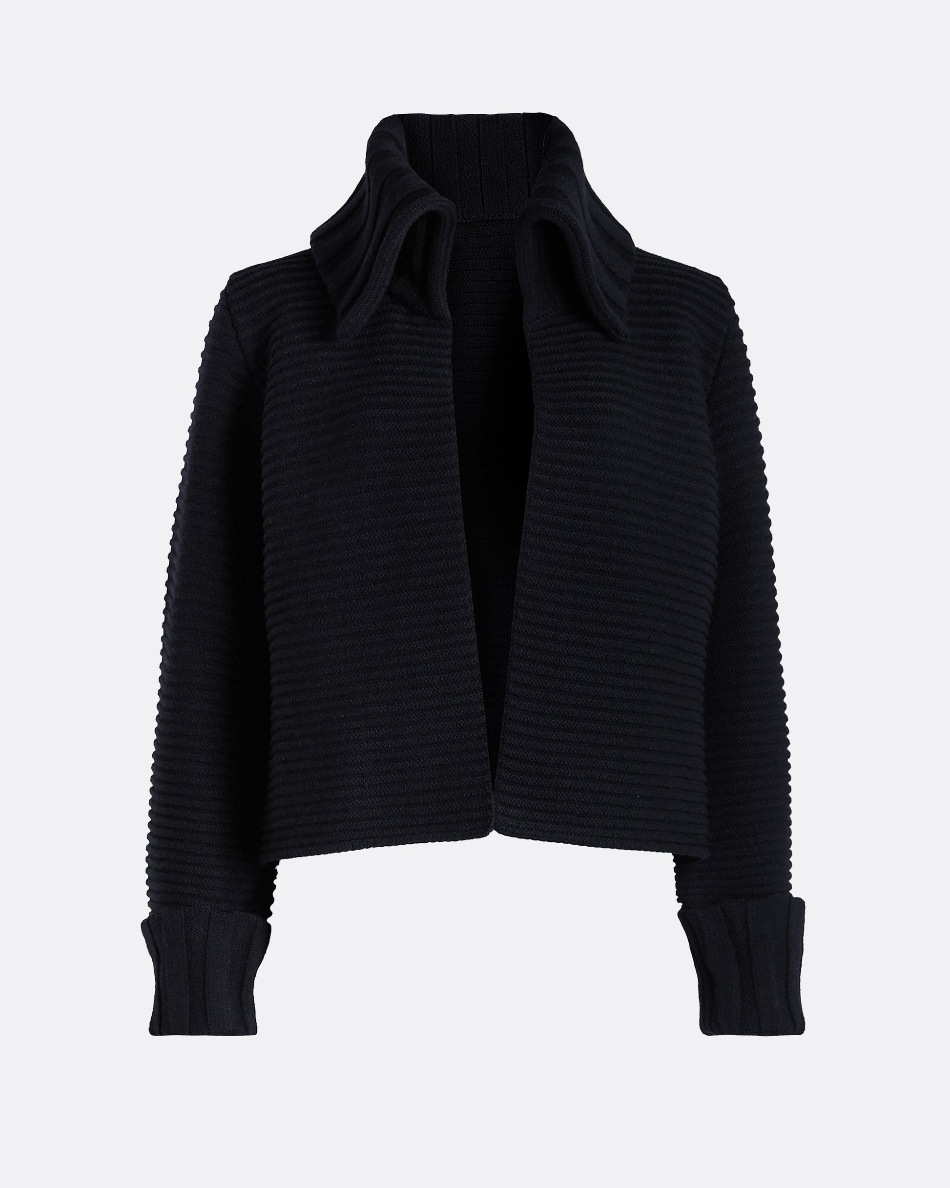 Foldover collared cardigan with draped, cuffed sleeve in navy.