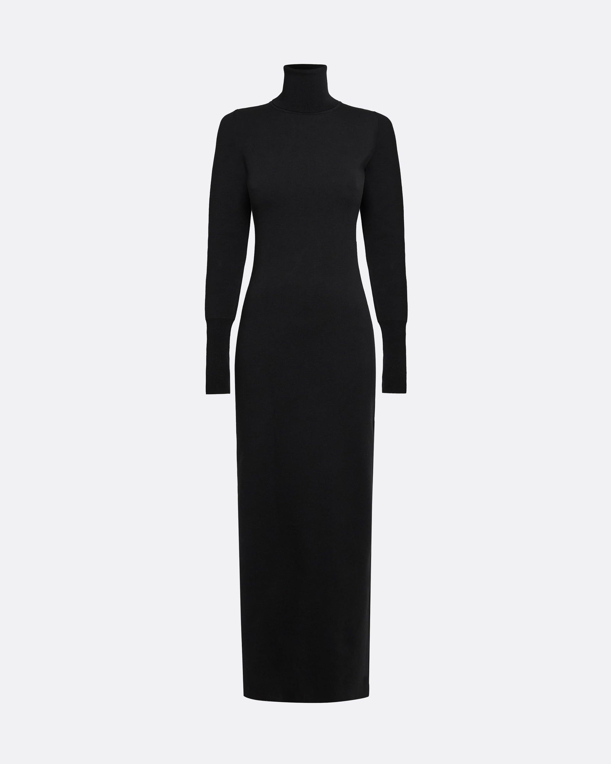Turtleneck, long sleeved dress with side slit and wide cuff in black Bodycon Stretch Knit.