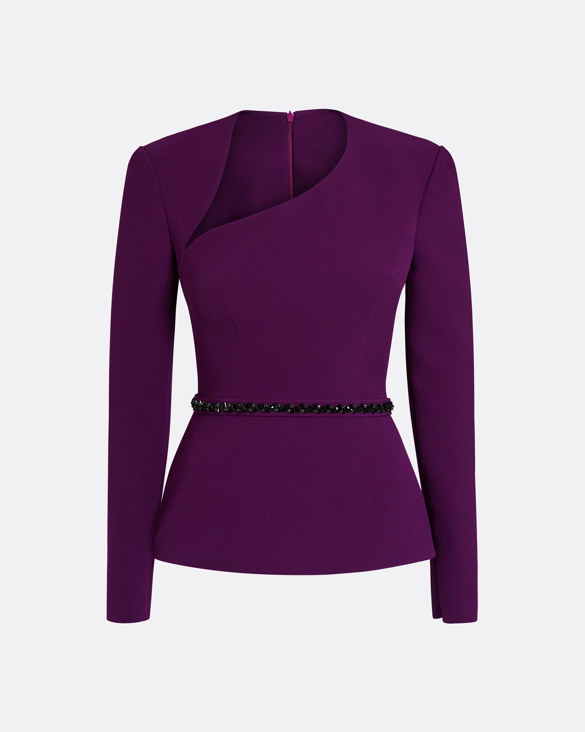 Simple peplum top with curved neckline and sharp shoulder in currant Heavy Crepe with black Nuit Trim embroidery.
