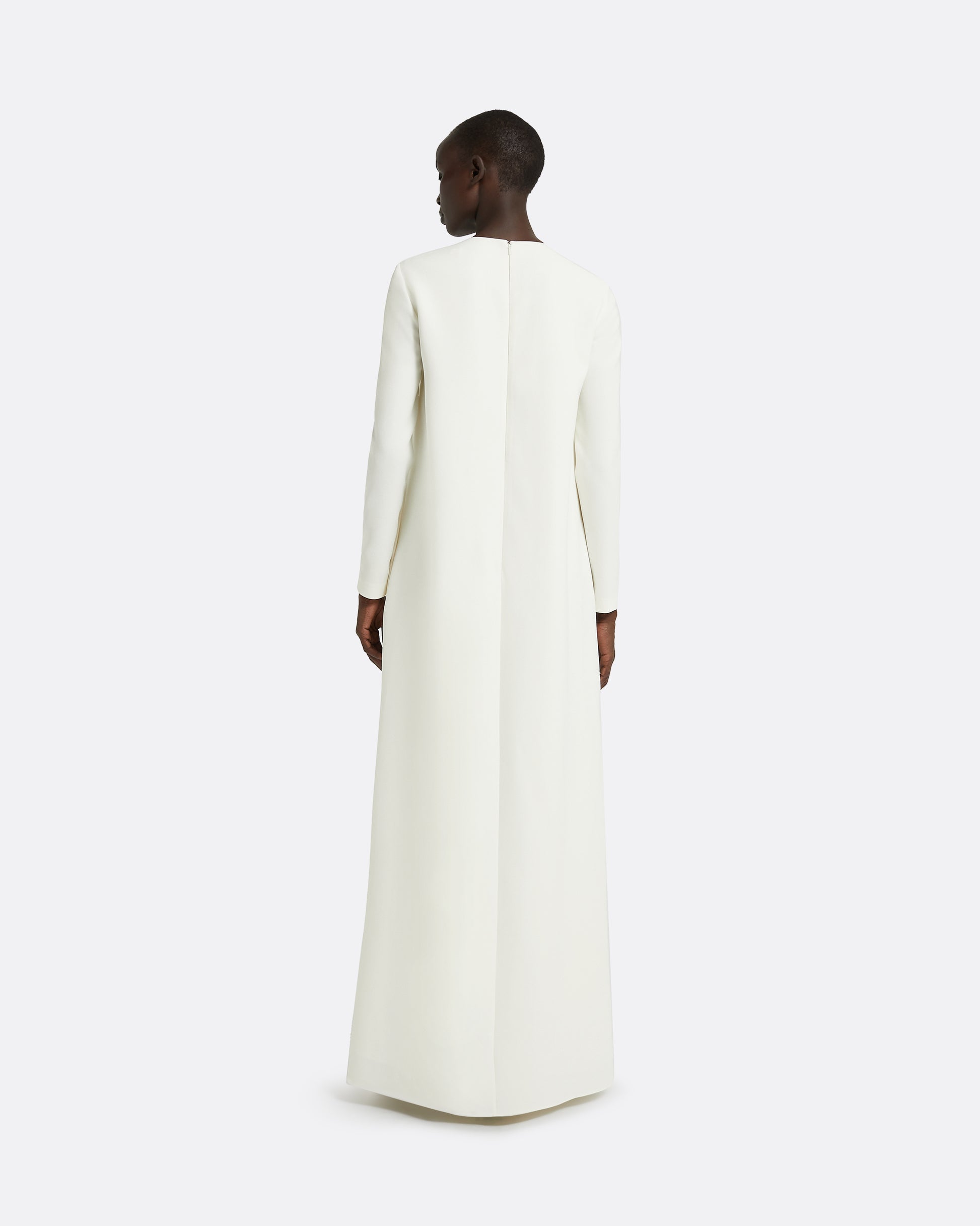 Round neck, long sleeve, A-shaped gown in ivory Heavy Crepe with silver Metallic Leaf embroidery.