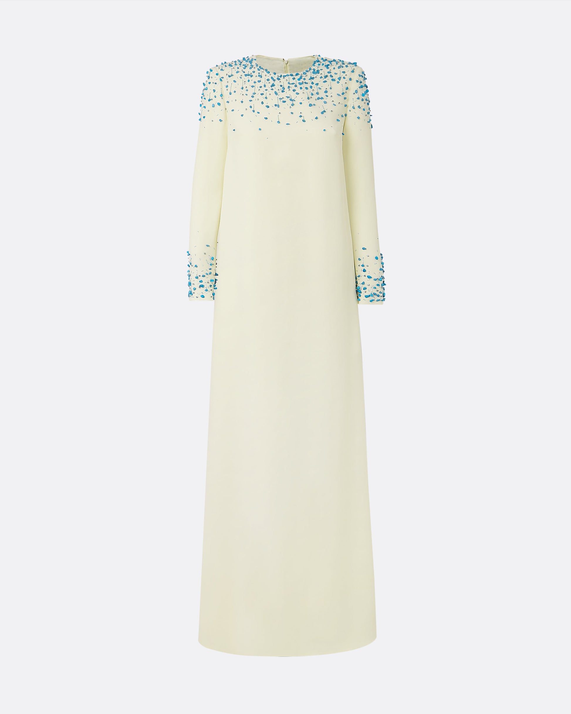 Round neck, long sleeve, A-line gown in sorbet Heavy Crepe with aquamarine Lagoon embroidery.