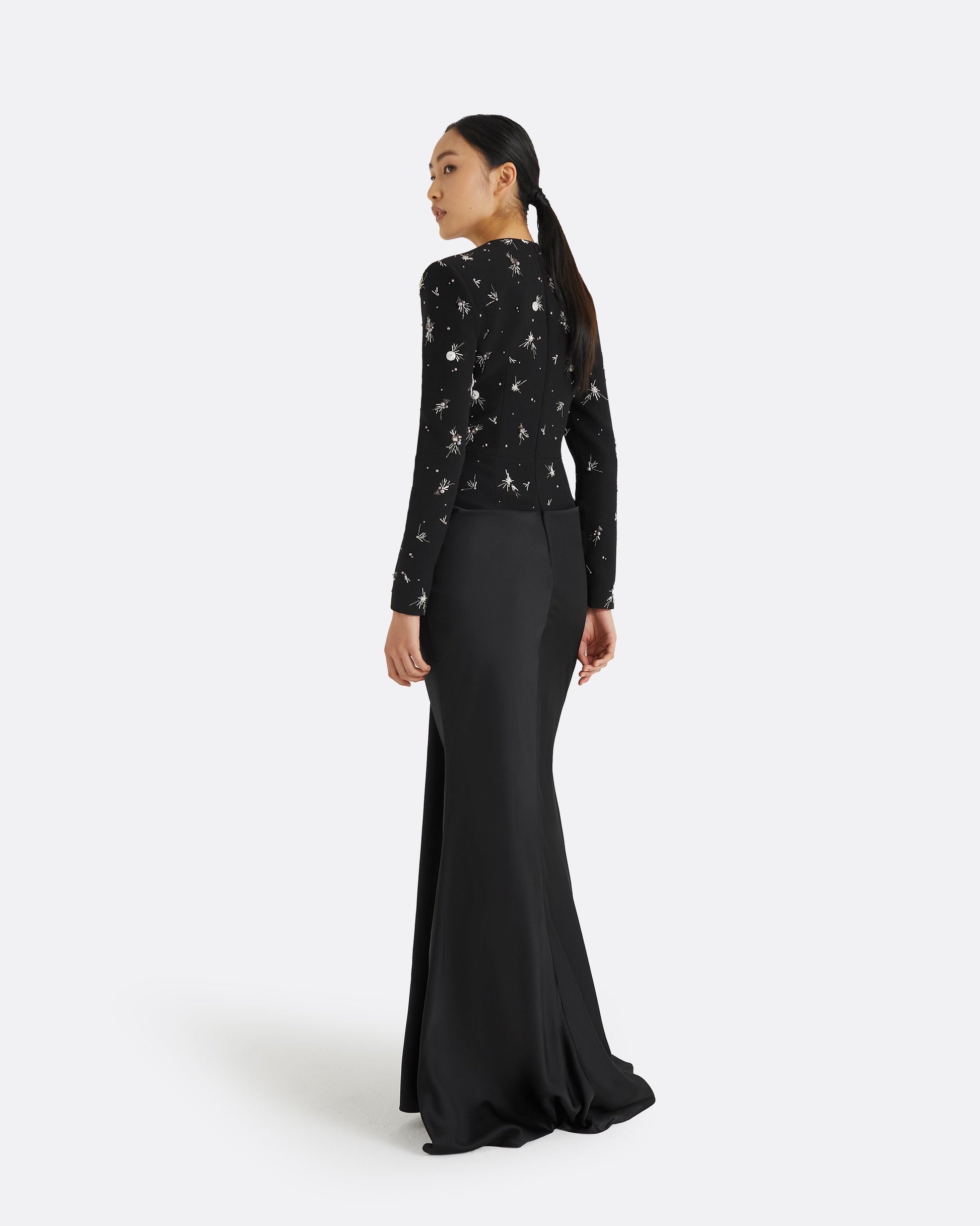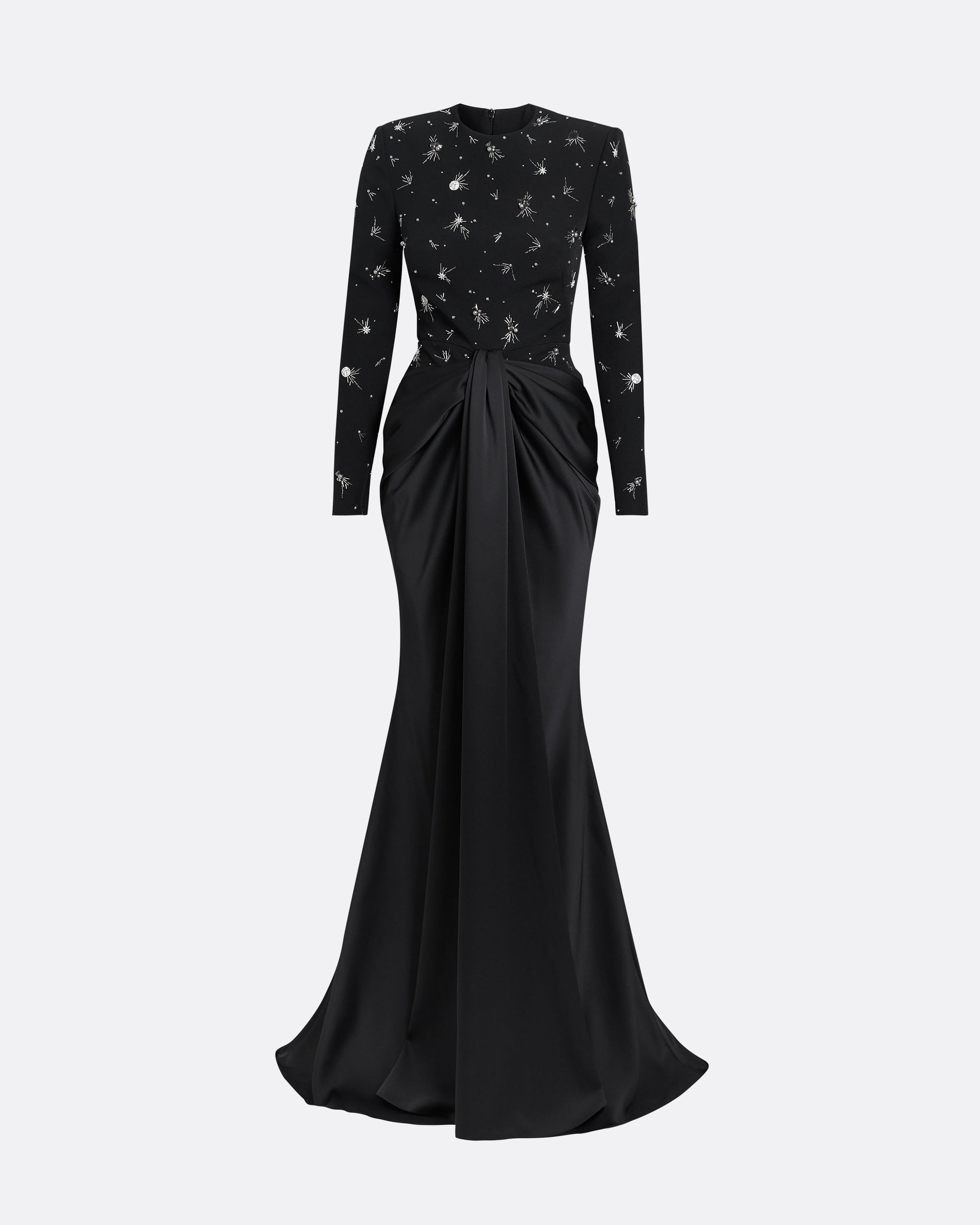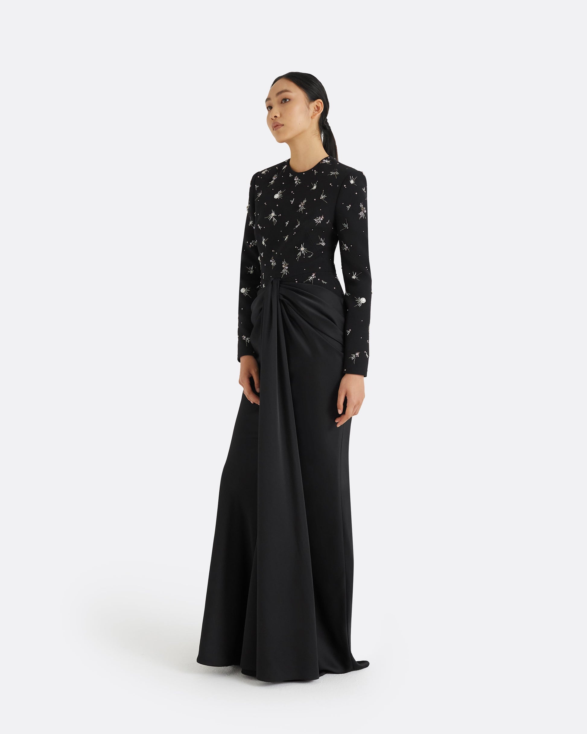 Long sleeved, floor length gown with draped contrast skirt in black Heavy Crepe and Light Satin Back Crepe, with silver/gold Aquila embroidery.