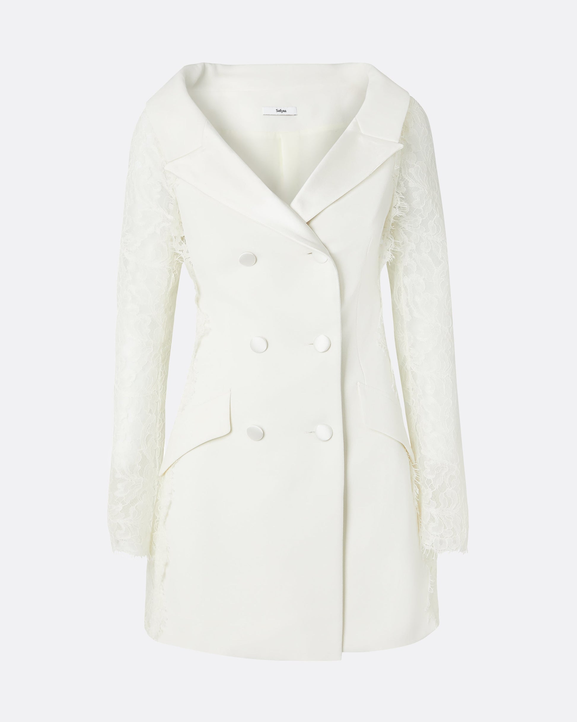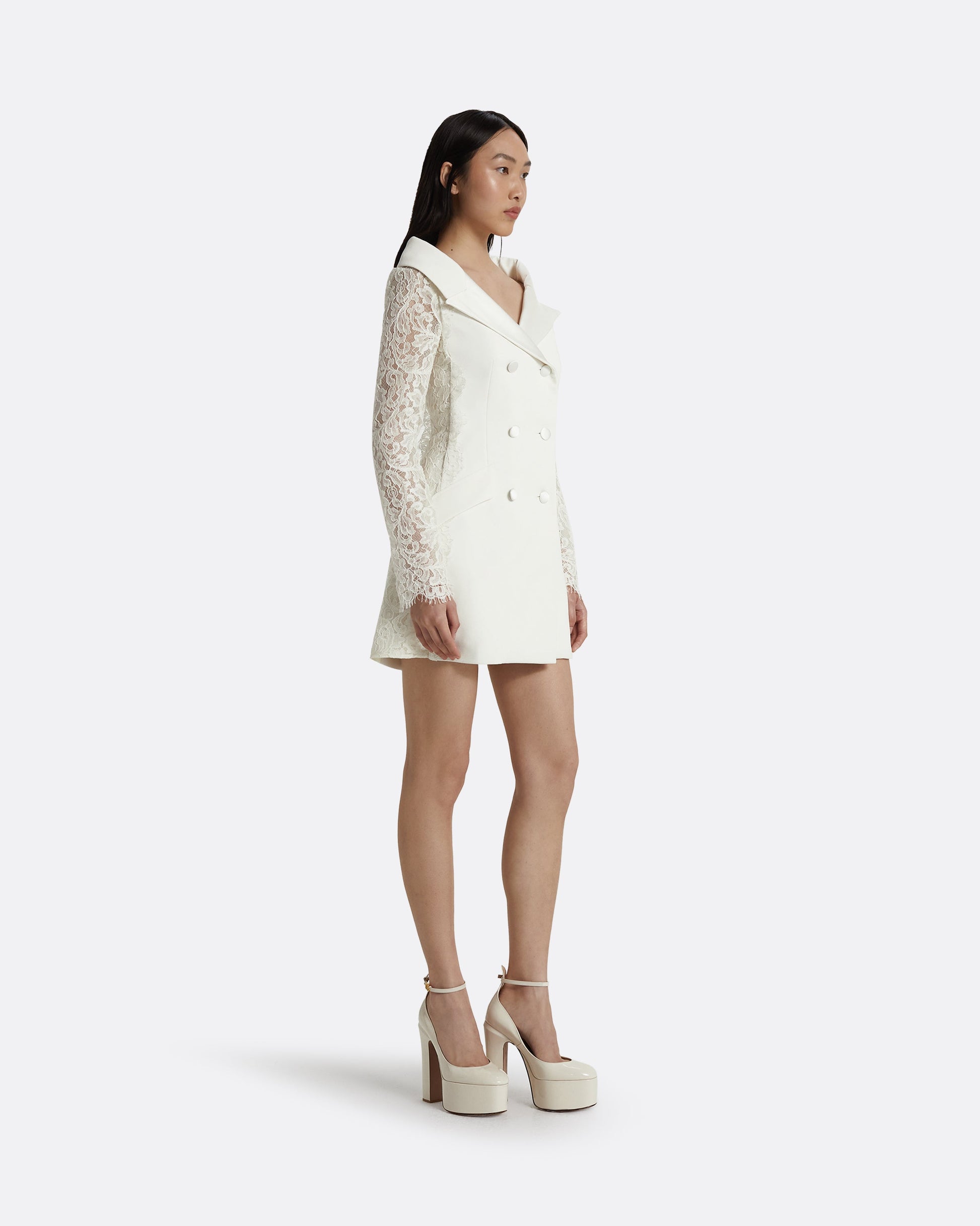 Blazer mini dress, open neckline and lace sleeve in ivory Heavy Crepe, Corded Lace and Shine Satin Stretch.