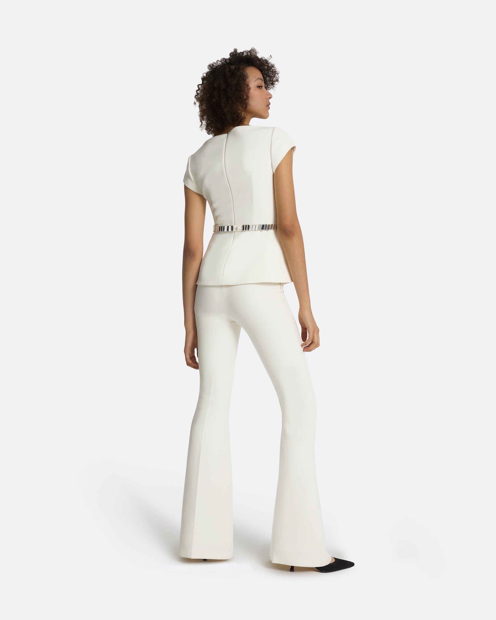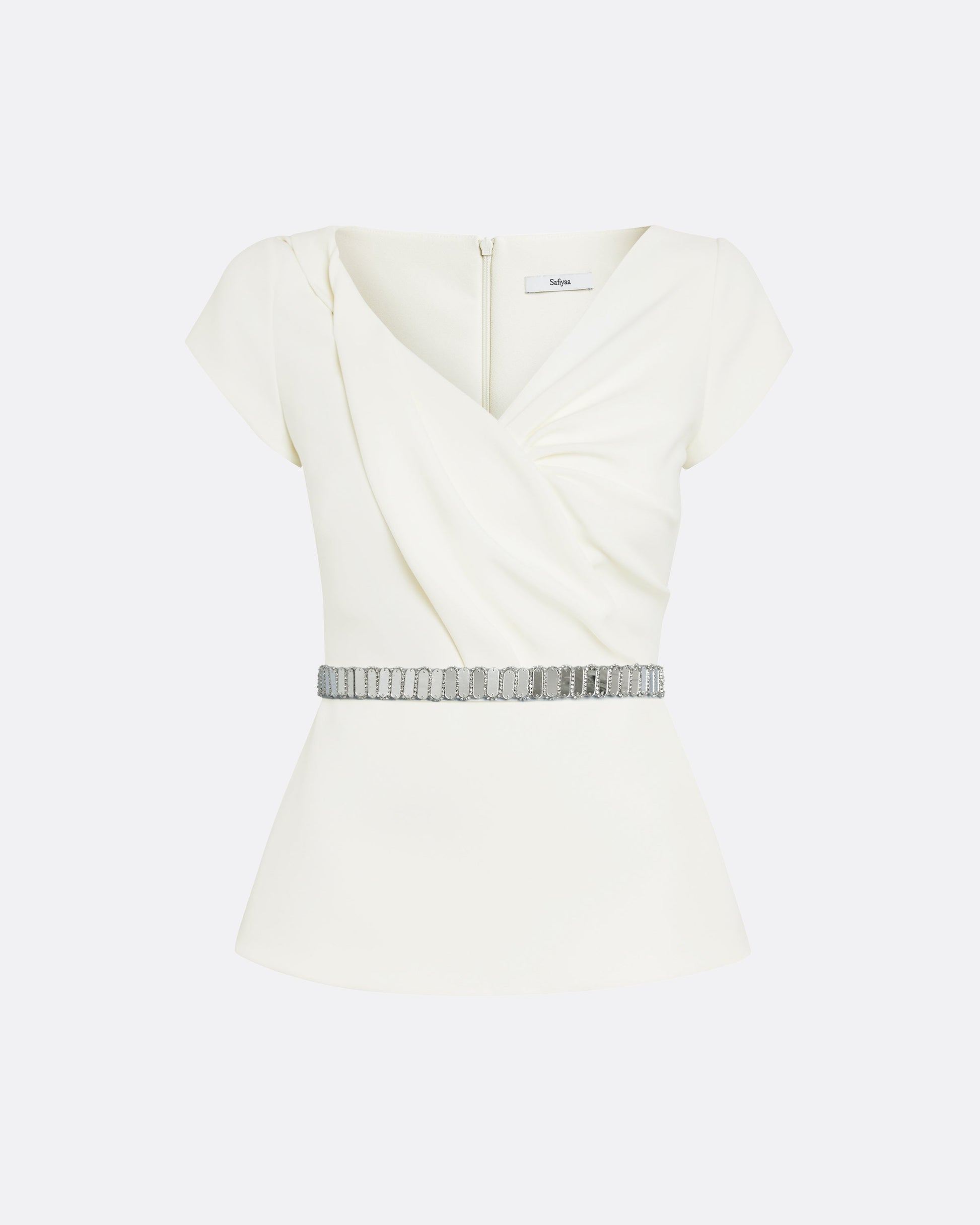 Peplum top with twist bodice and capped sleeve in ivory Heavy Crepe with mirrored silver Medusa Trim embroidery.