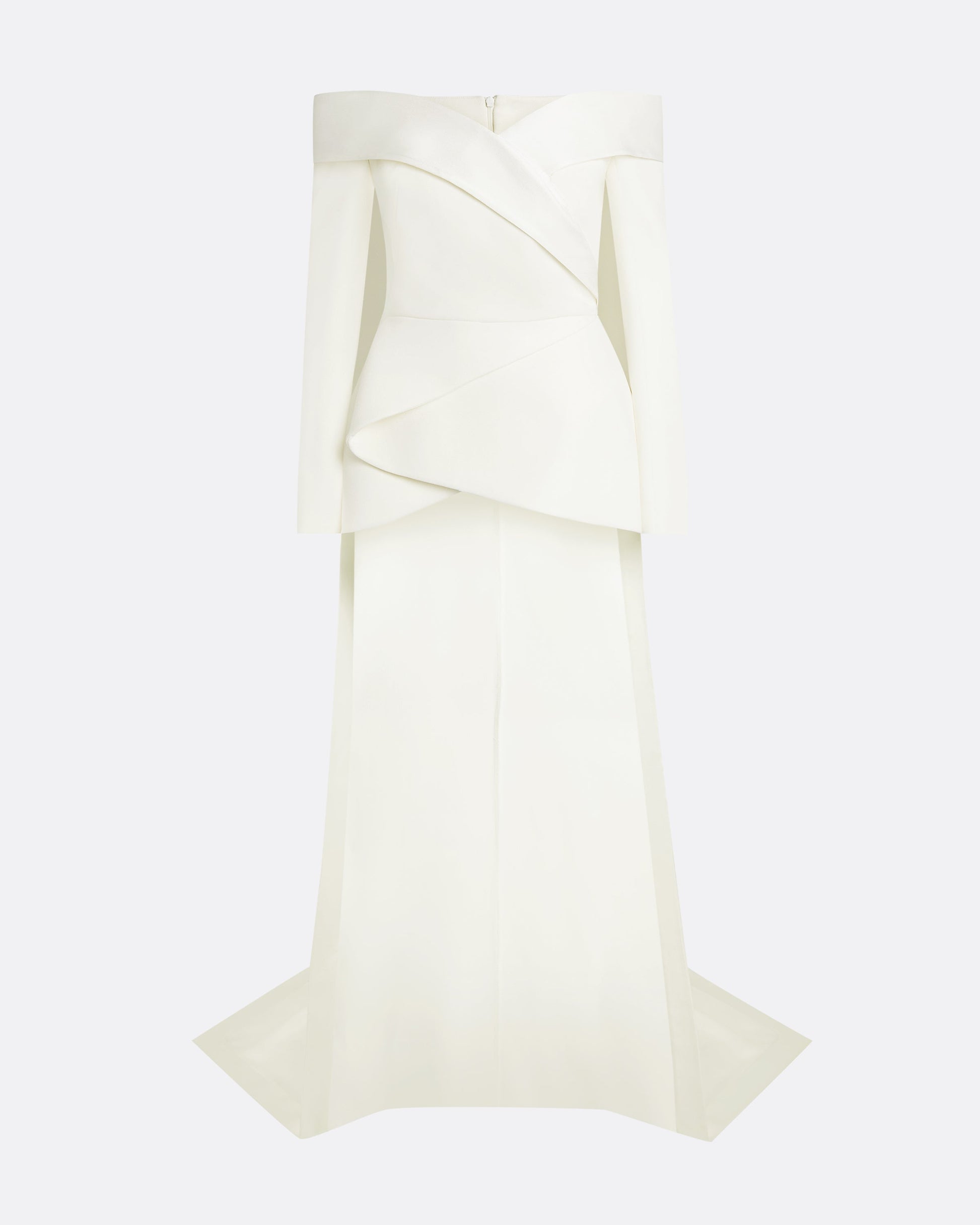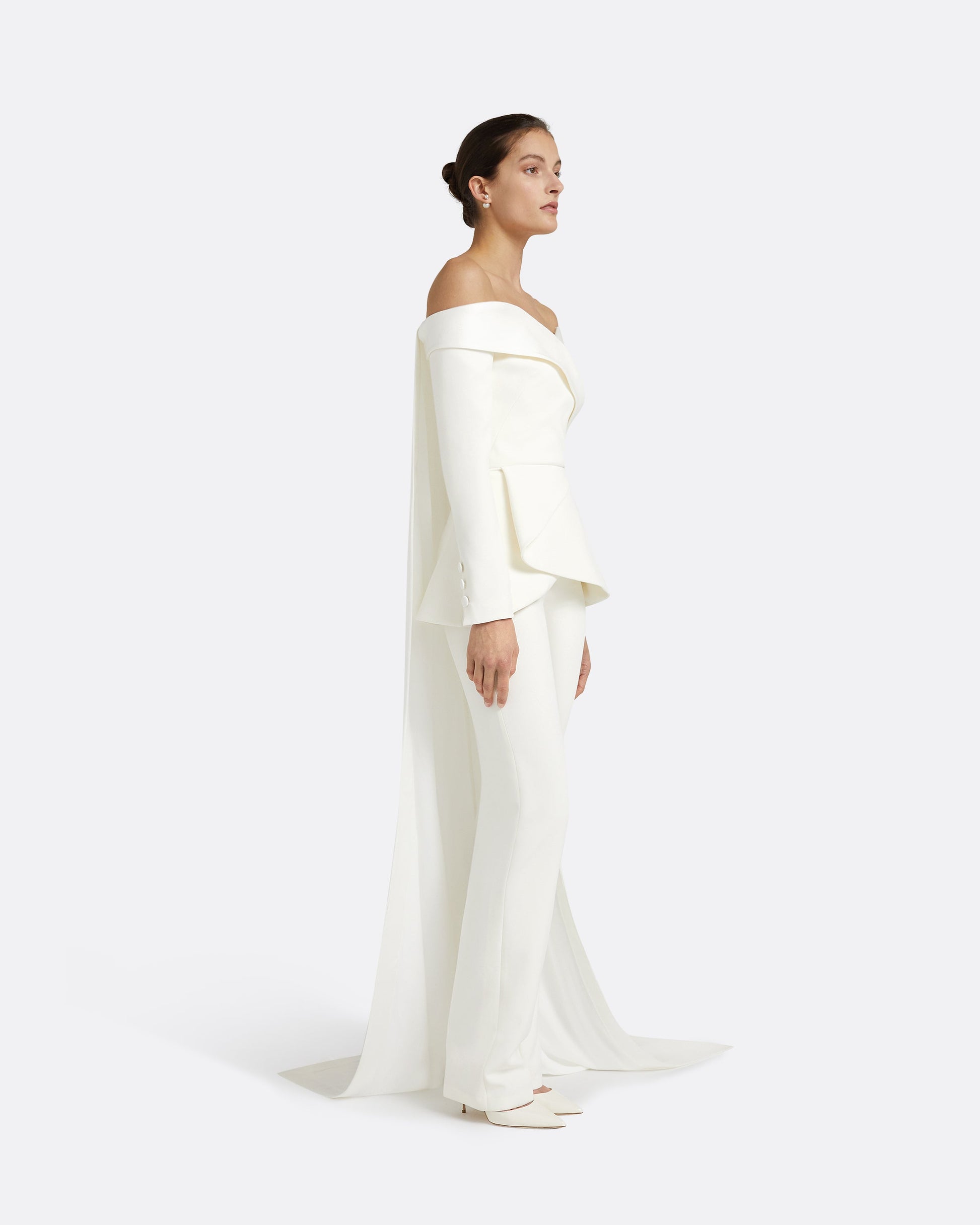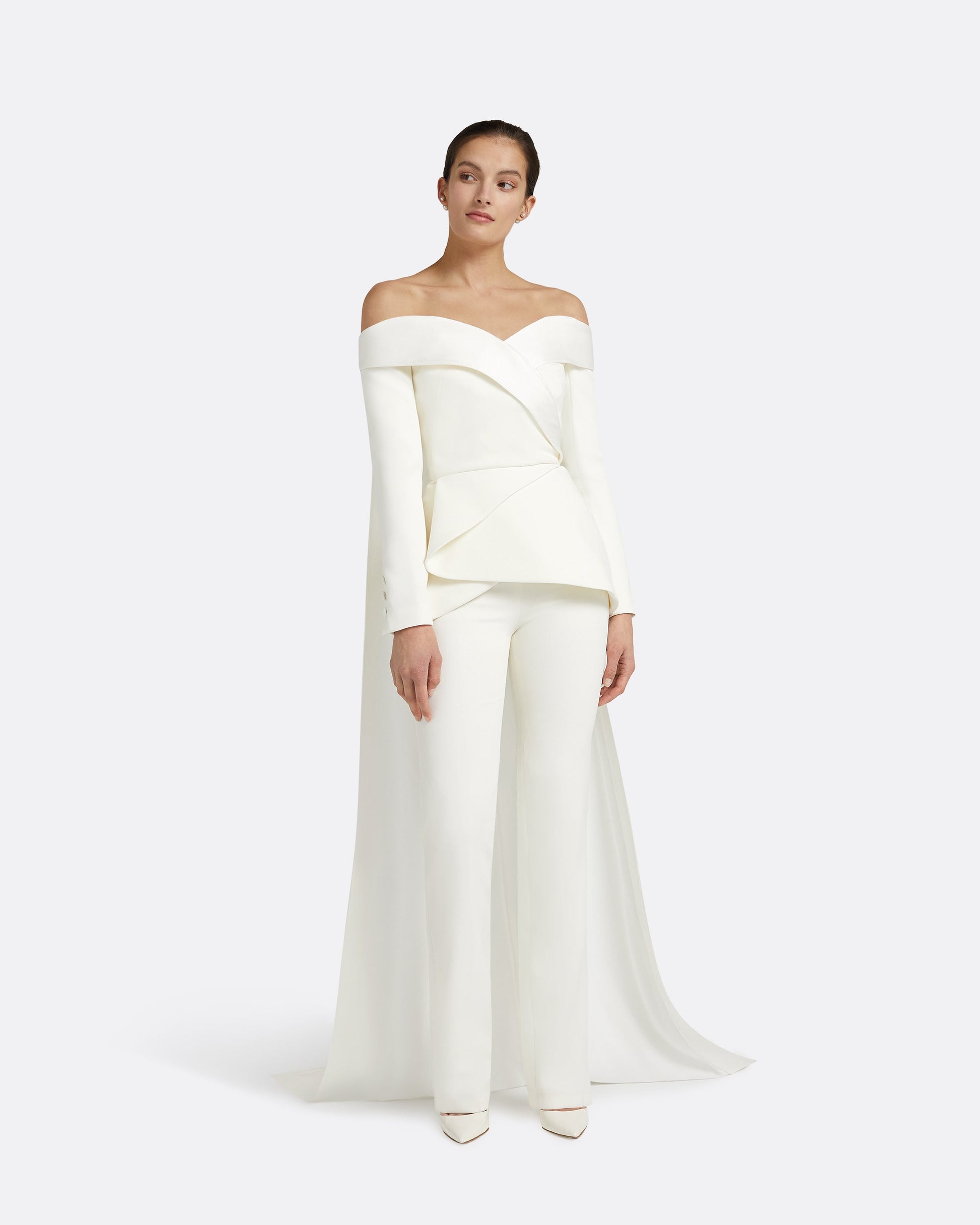 Fold over front detail top with statement collared cape in ivory Heavy Crepe and Satin Back Crepe.