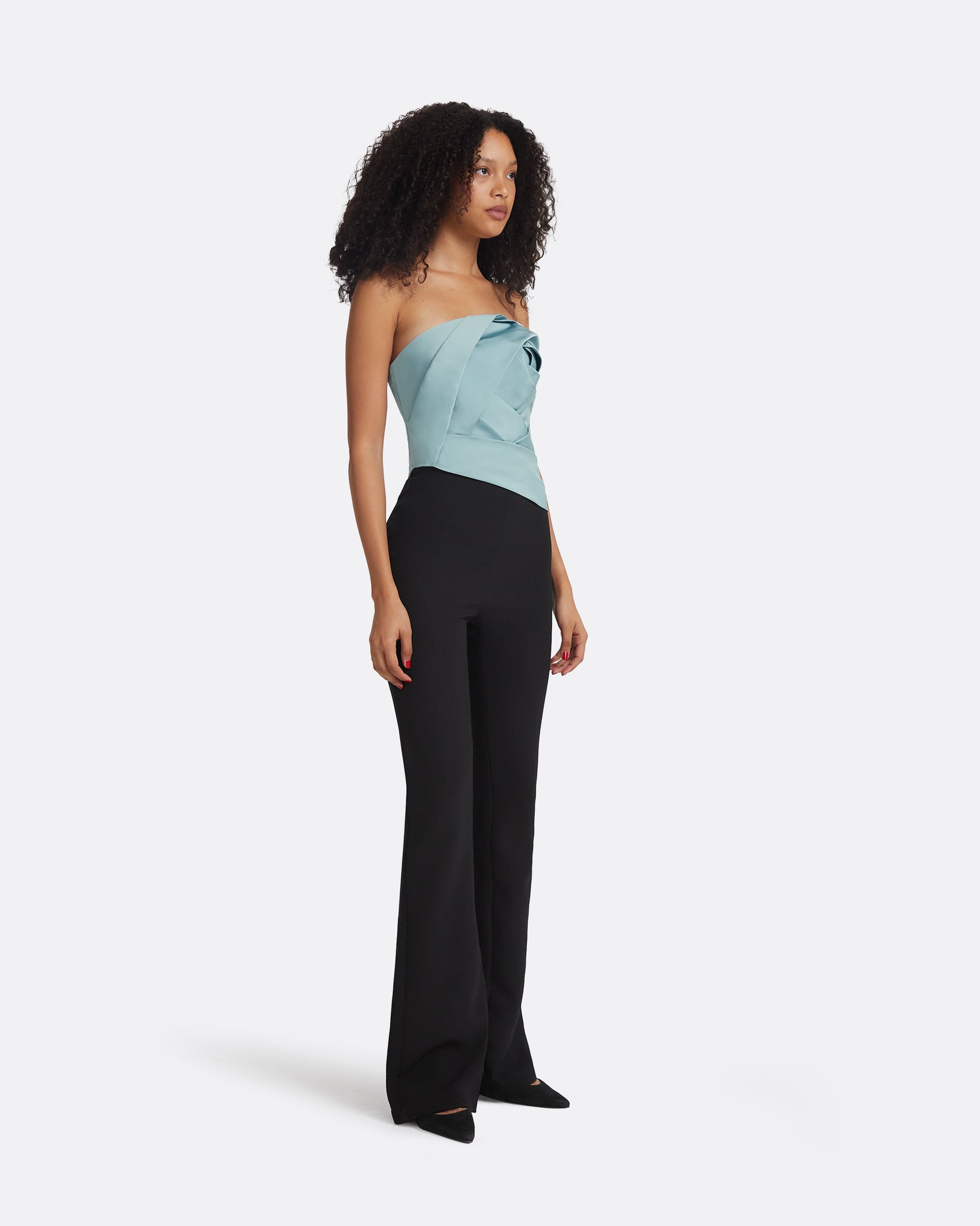Semi-flare leg jumpsuit with rose drape in spearmint Faille on black Heavy Crepe.