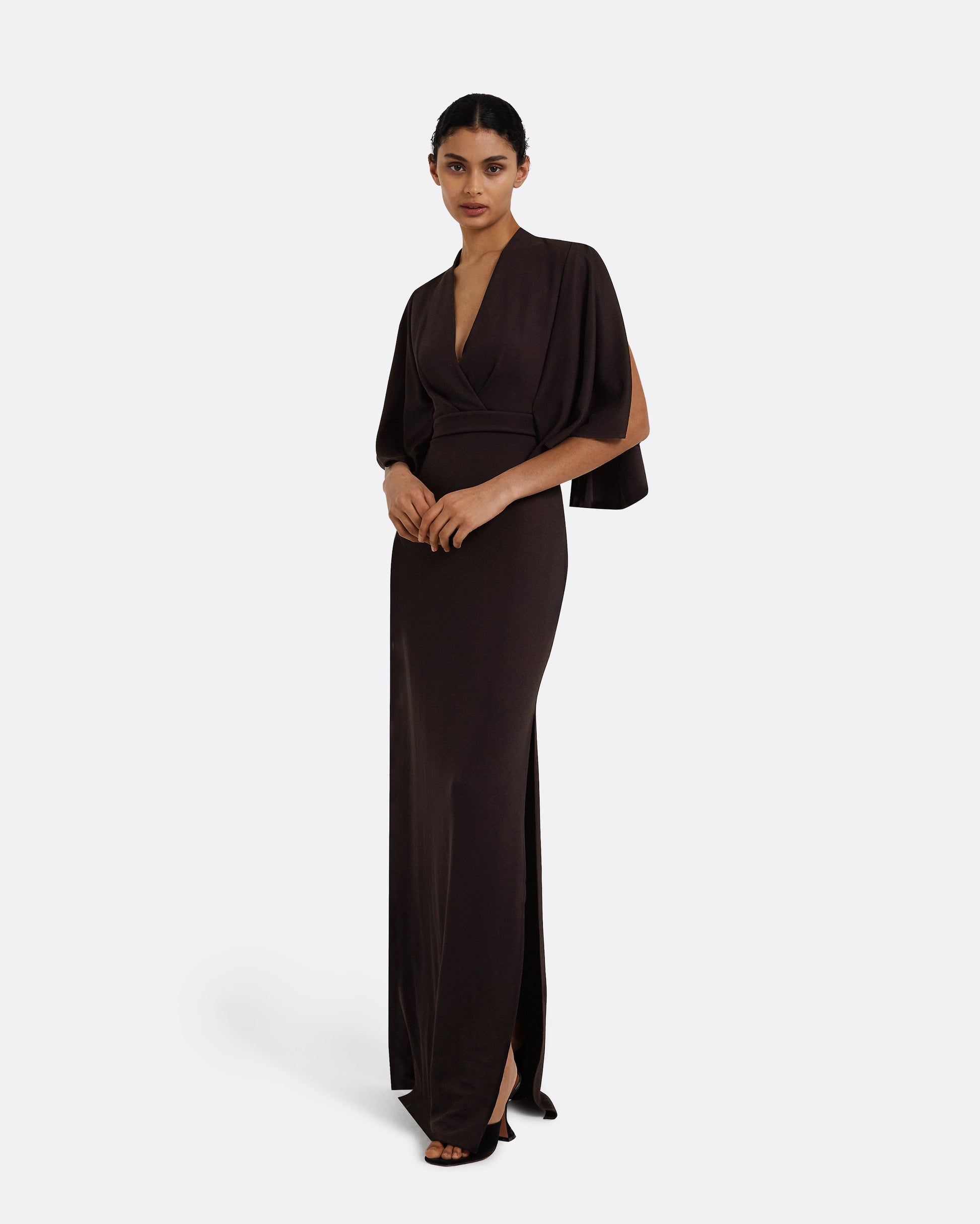 Deep V neck long dress with side slits and belted, drape kaftan style top in dark mocha.