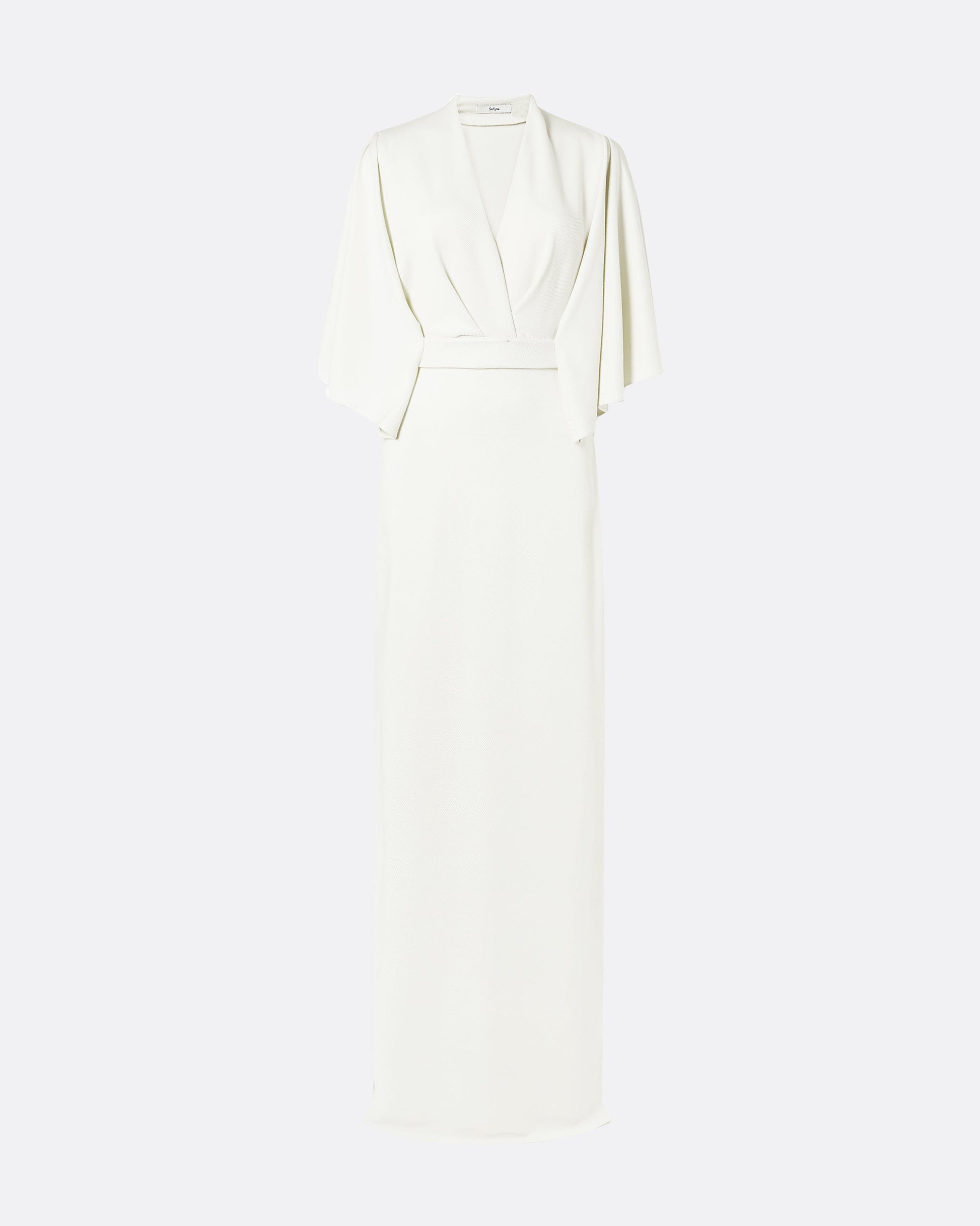 Deep V neck long dress with side slits and belted, drape kaftan style top in ivory.