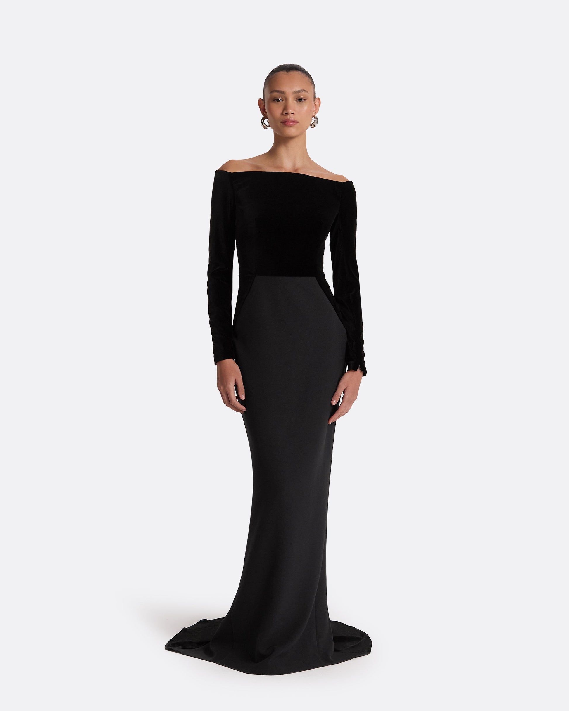 Off the shoulder gown with contrast details in black Heavy Crepe and Miller Velvet.