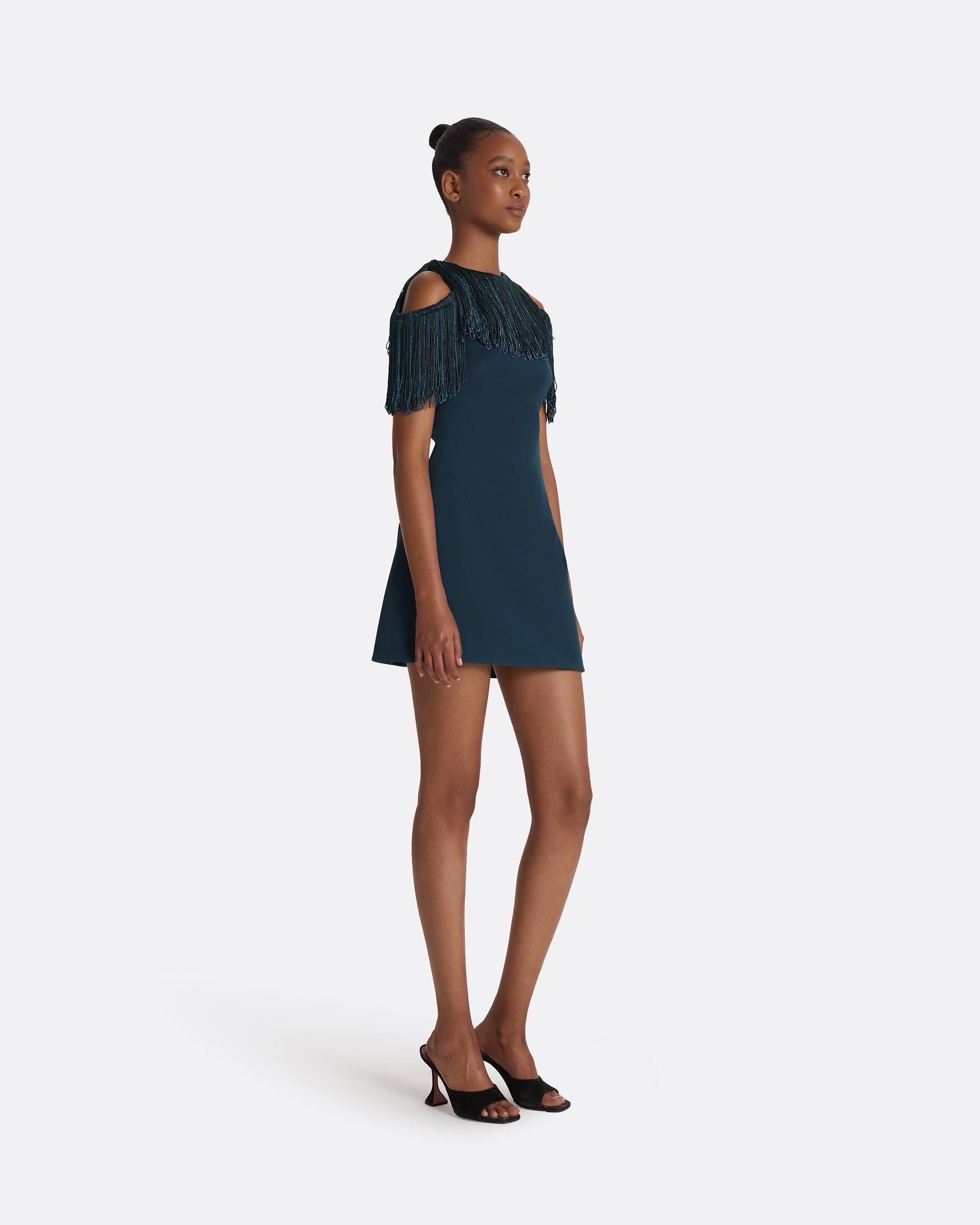 Mini A-line dress with crew neck in moonlit ocean Heavy Crepe with moonlit ocean Anemone Fringe embroidery.