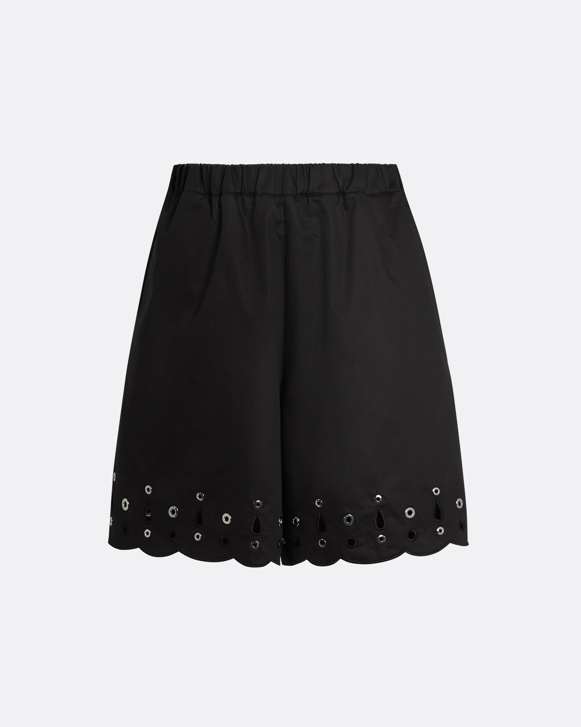 High waisted boxer style short with elasticated waist in black Cotton Poplin and silver Anglaise embroidery.