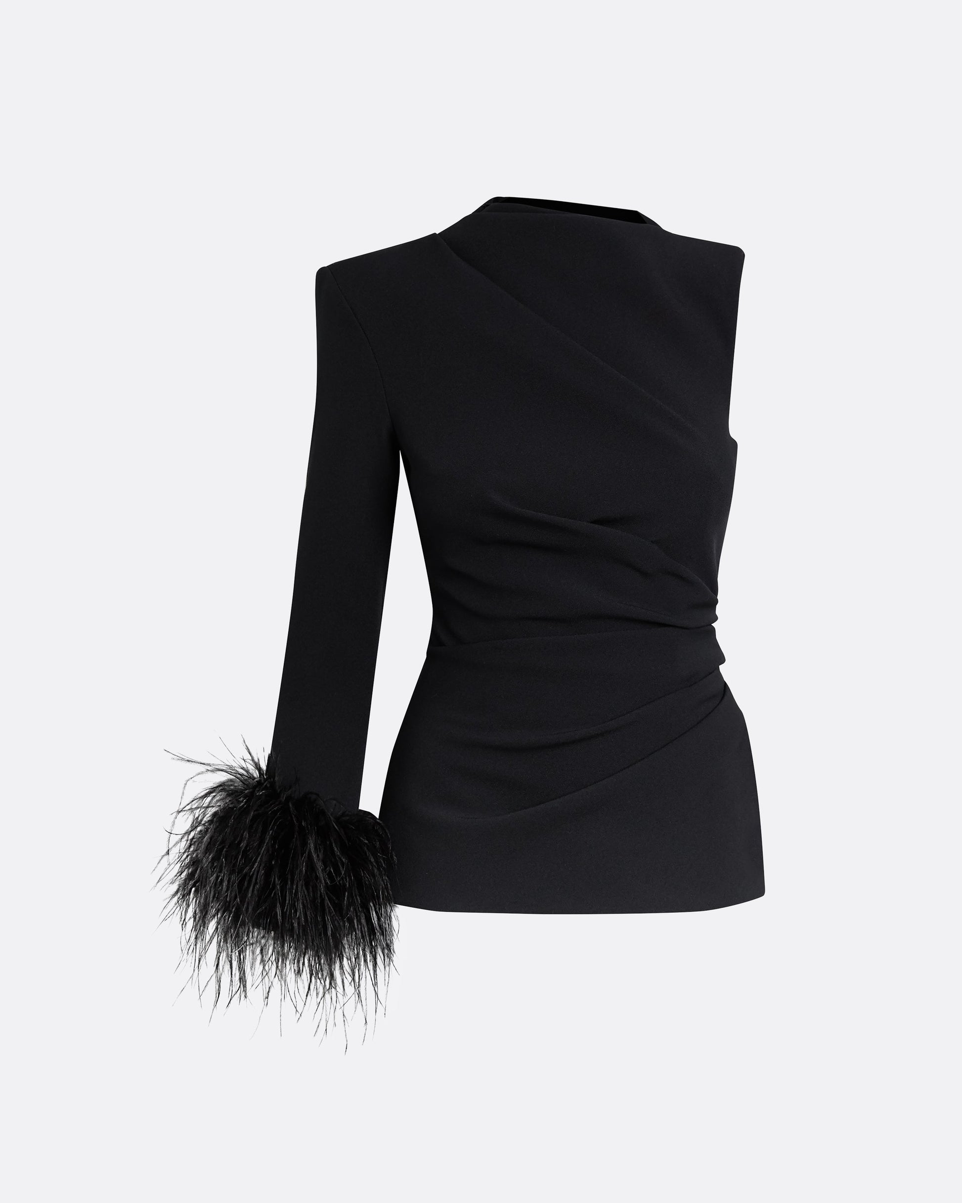 Aymmetric sleeved top with flattering pleat details in black Heavy Crepe and Ostrich Feathers.