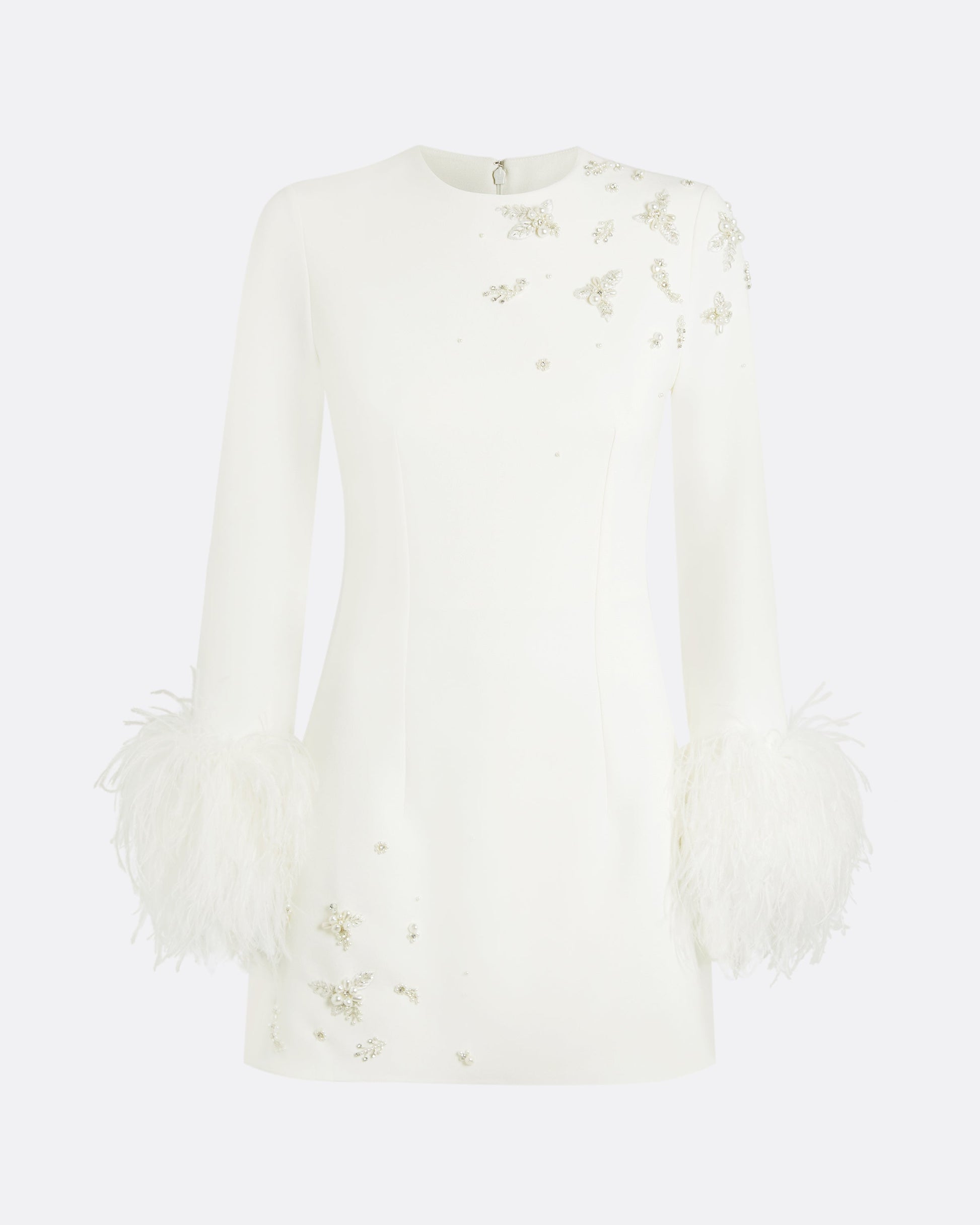 Mini A-line dress with round neck and feather-trimmed long sleeves in ivory and Pearl Floral embroidery.
