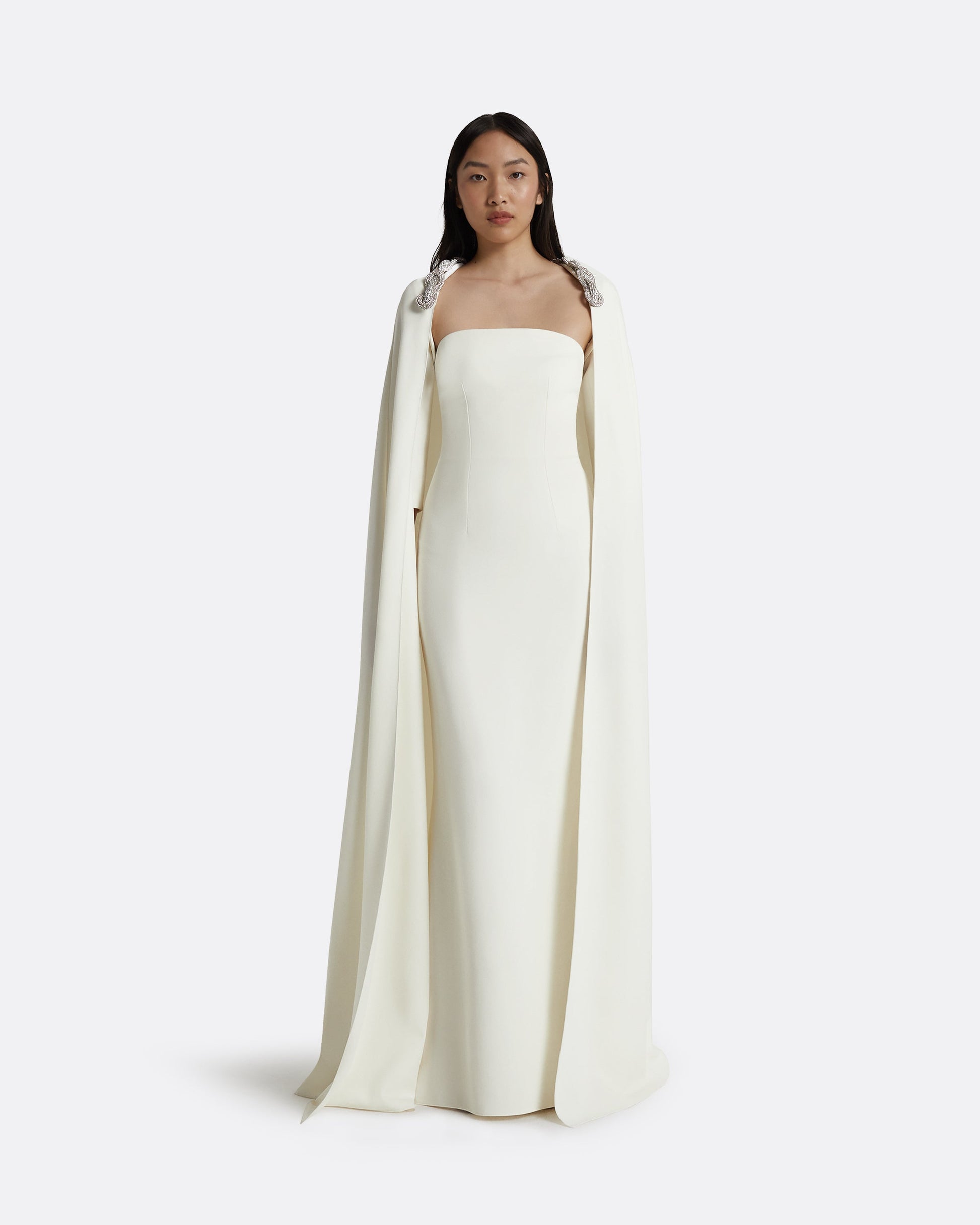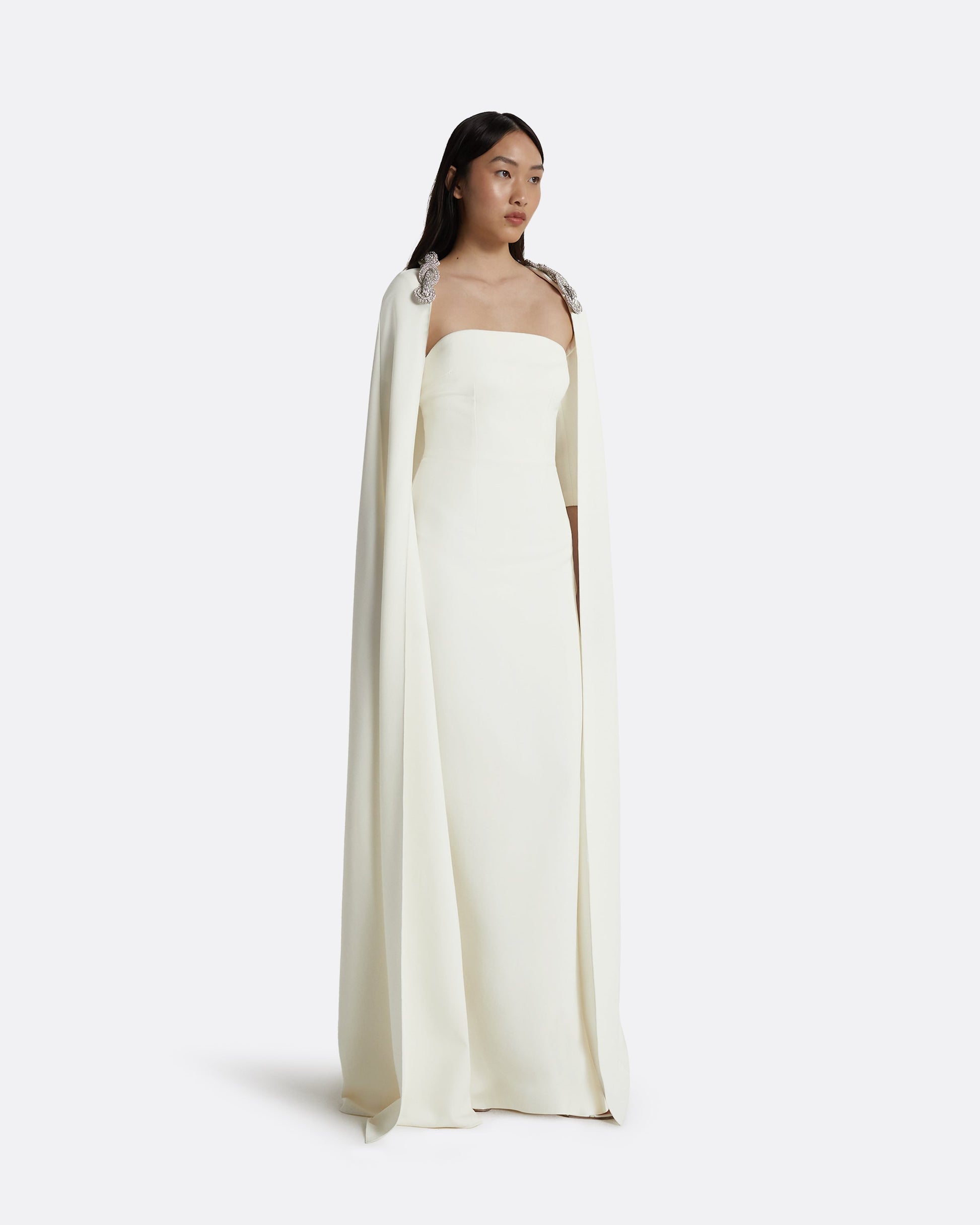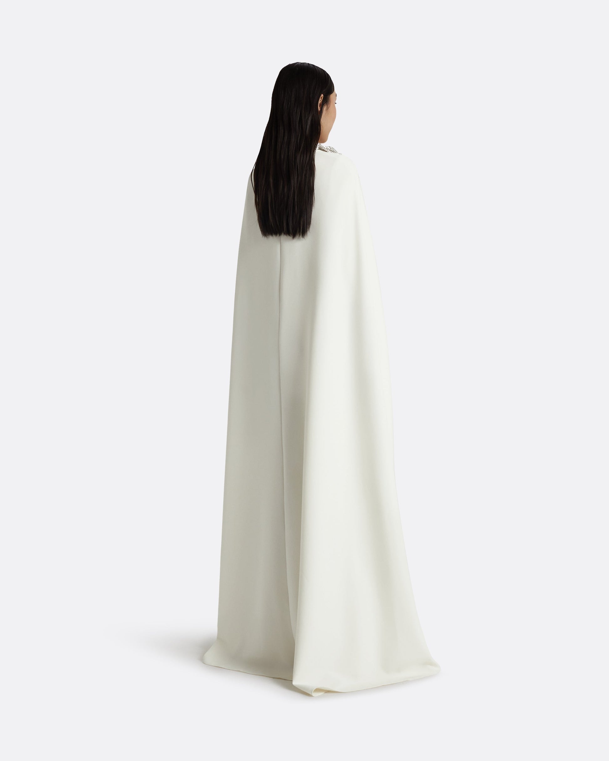 Fluid, floor length cape in ivory Heavy Crepe and Serpentine Chain embroidery.