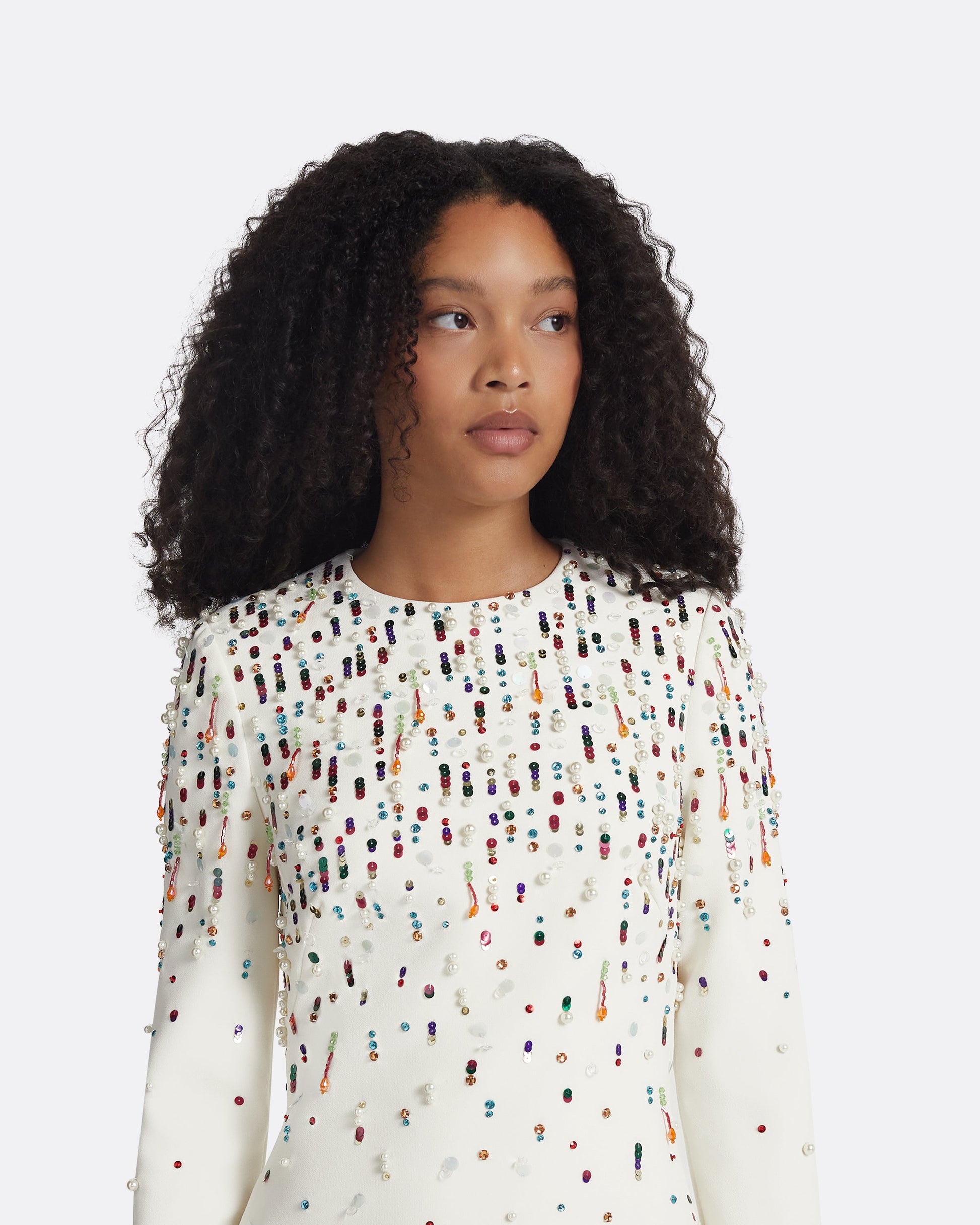 A-line mini dress with cropped sleeves in ivory Heavy Crepe with multi-brights Chandelier embroidery.