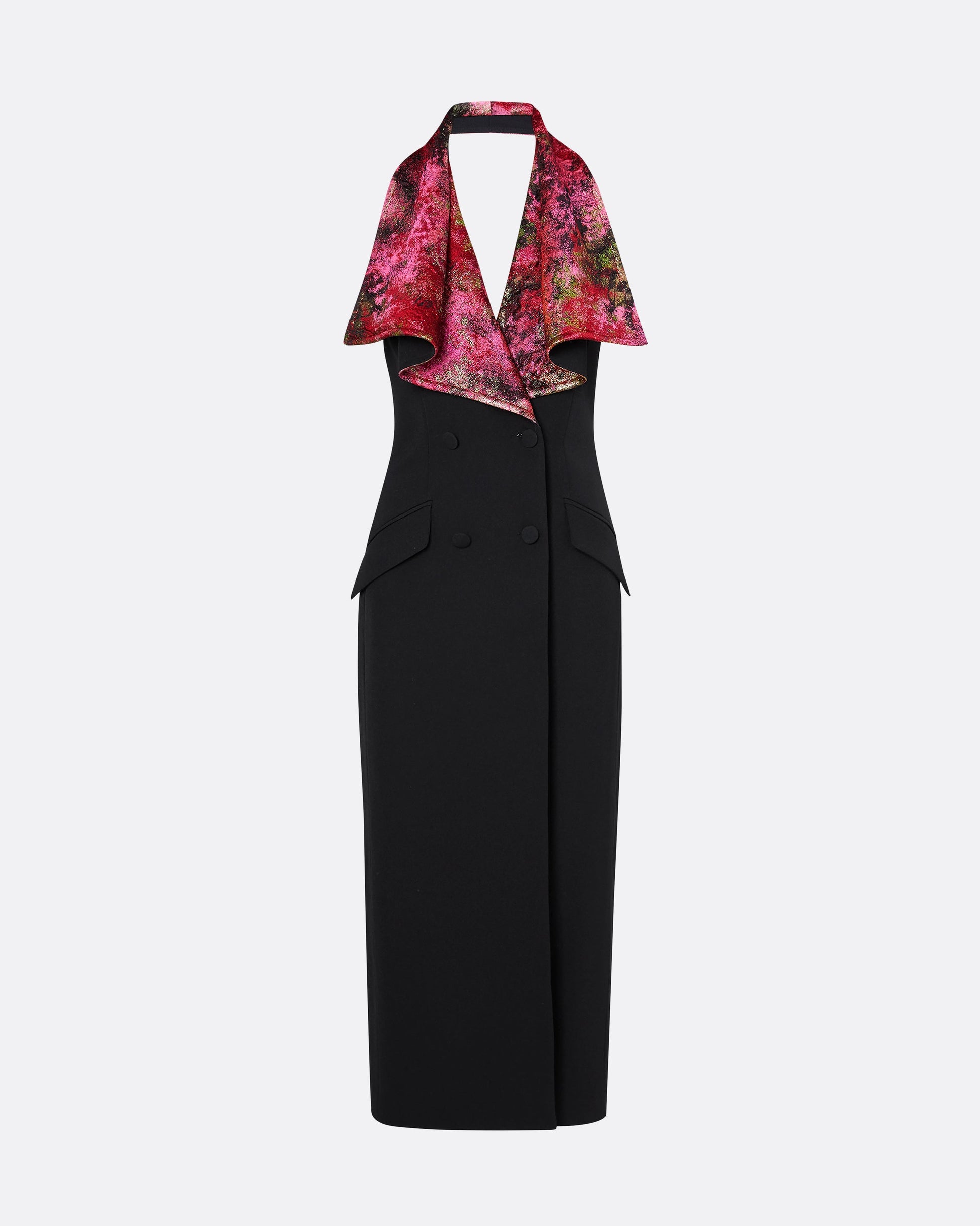 Double breasted, blazer dress with folded collar in lacquer red Kaleidoscope Jacquard on black Heavy Crepe.