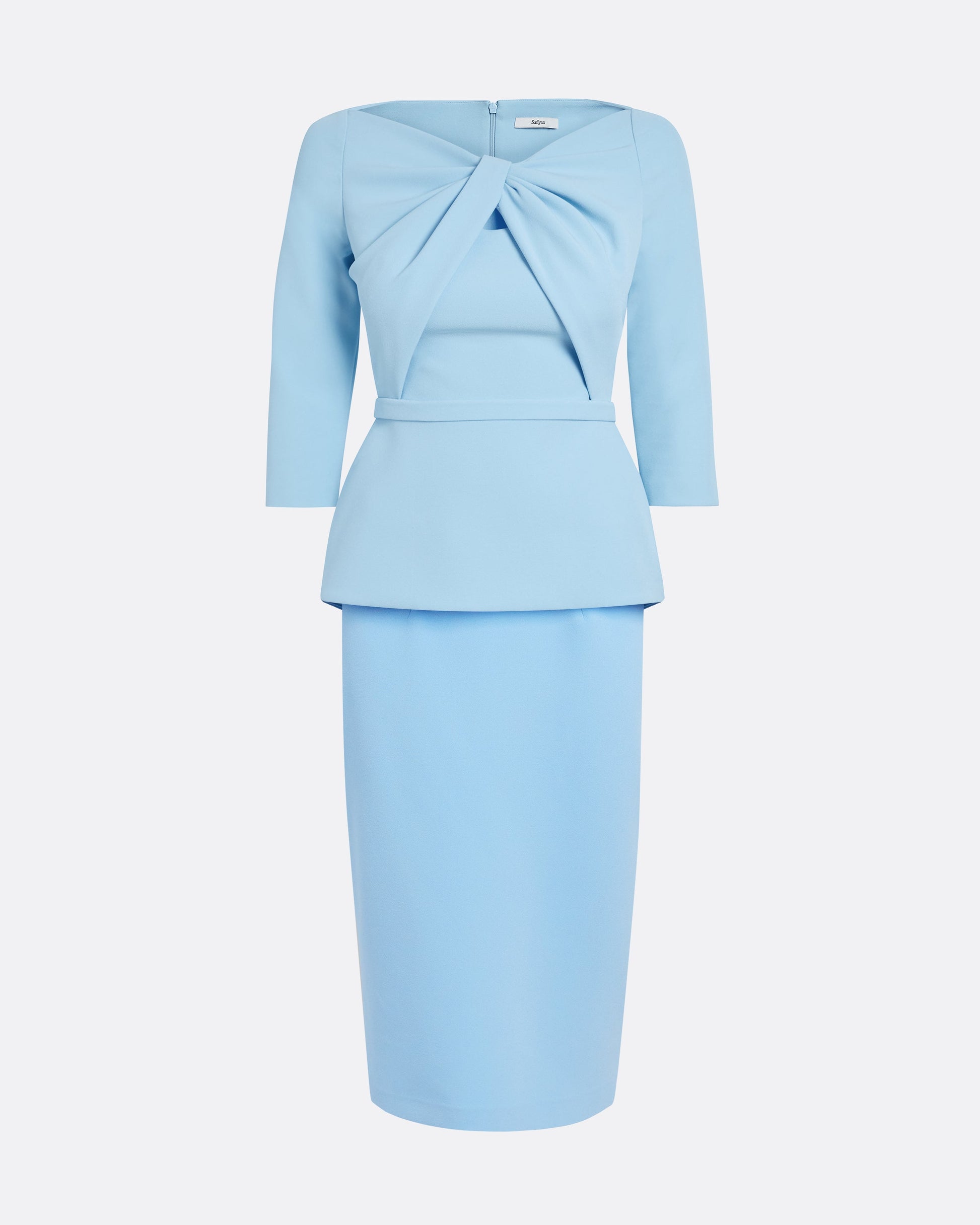 Cropped sleeve cocktail dress with peplum and twisted bust drape in vista Heavy Crepe.