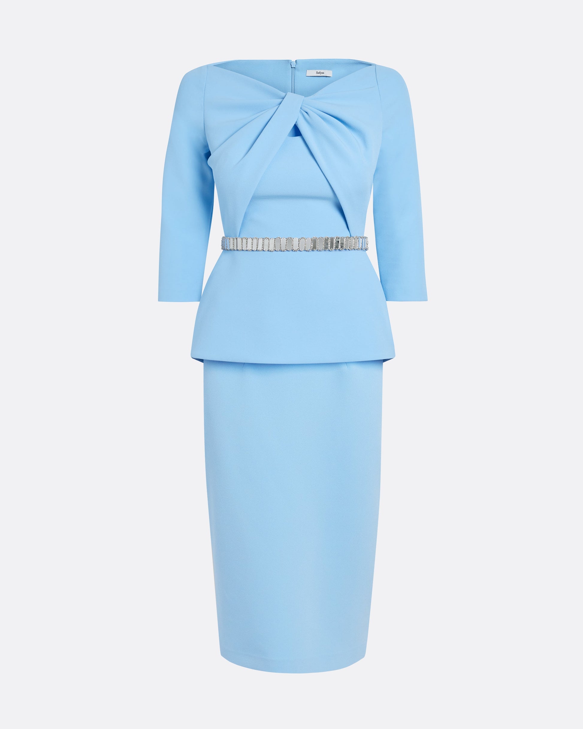 Cropped sleeve cocktail dress with peplum and twisted bust drape in vista Heavy Crepe with mirrored silver Medusa Trim embroidery.