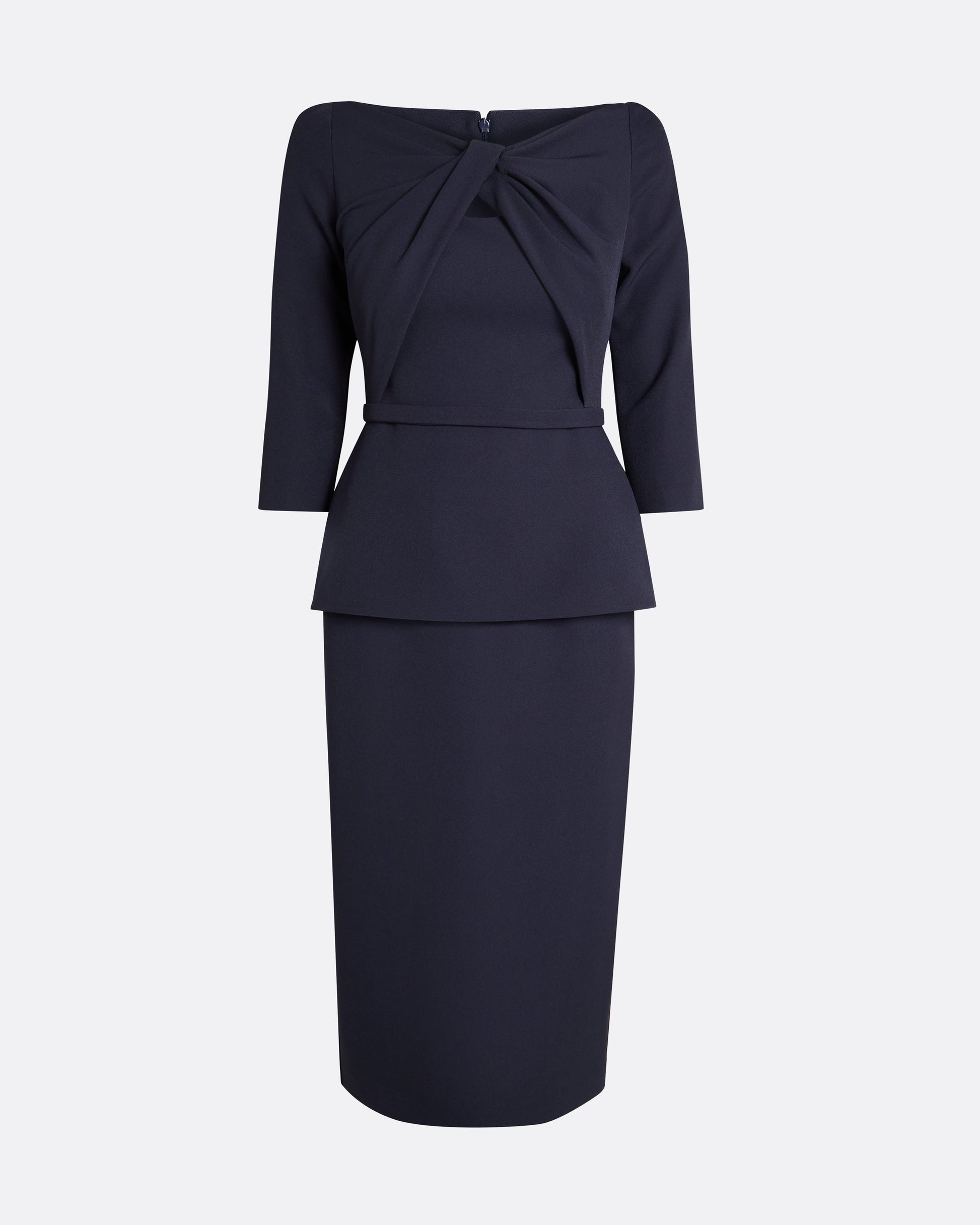 Cropped sleeve cocktail dress with peplum and twisted bust drape in midnight navy Heavy Crepe.