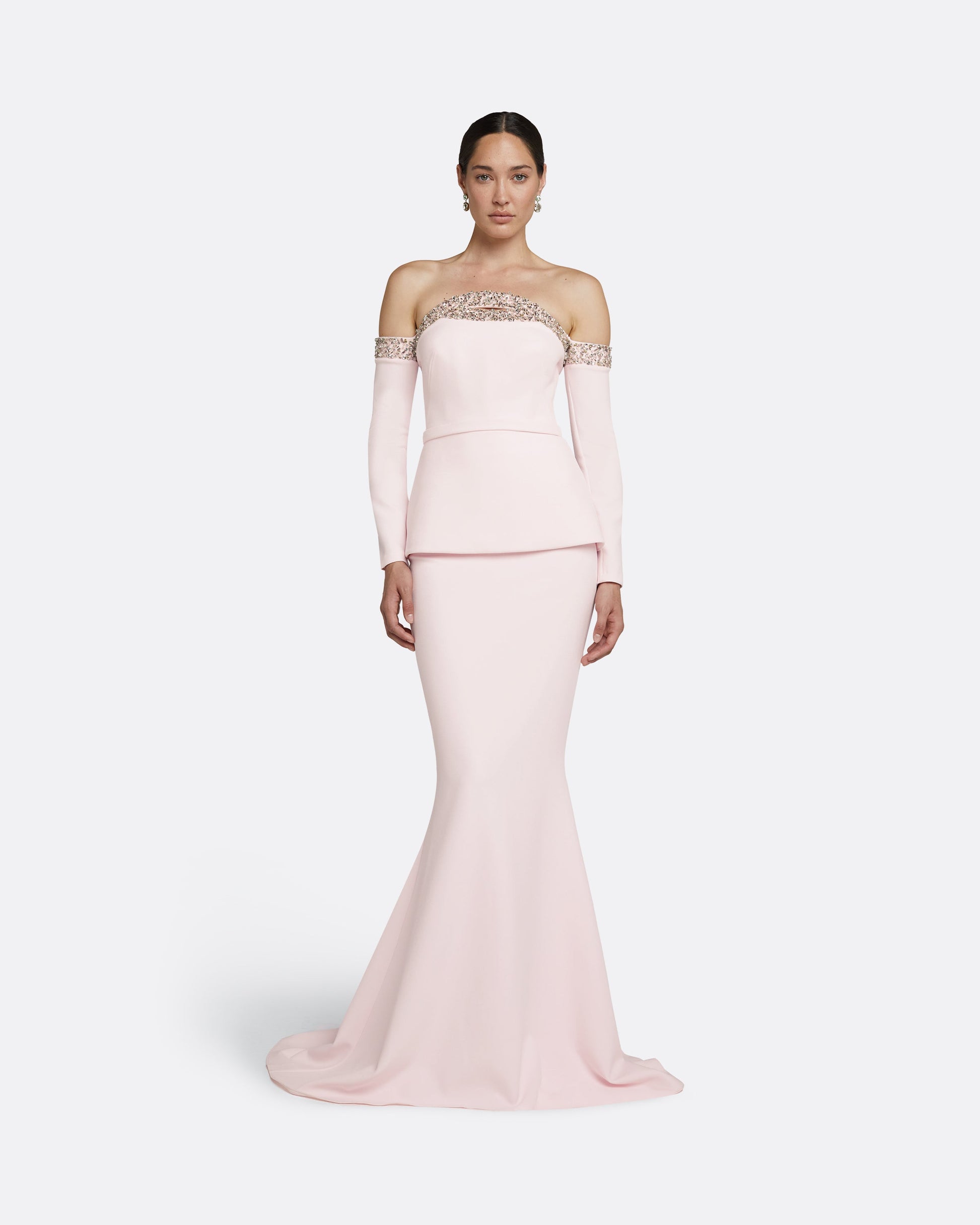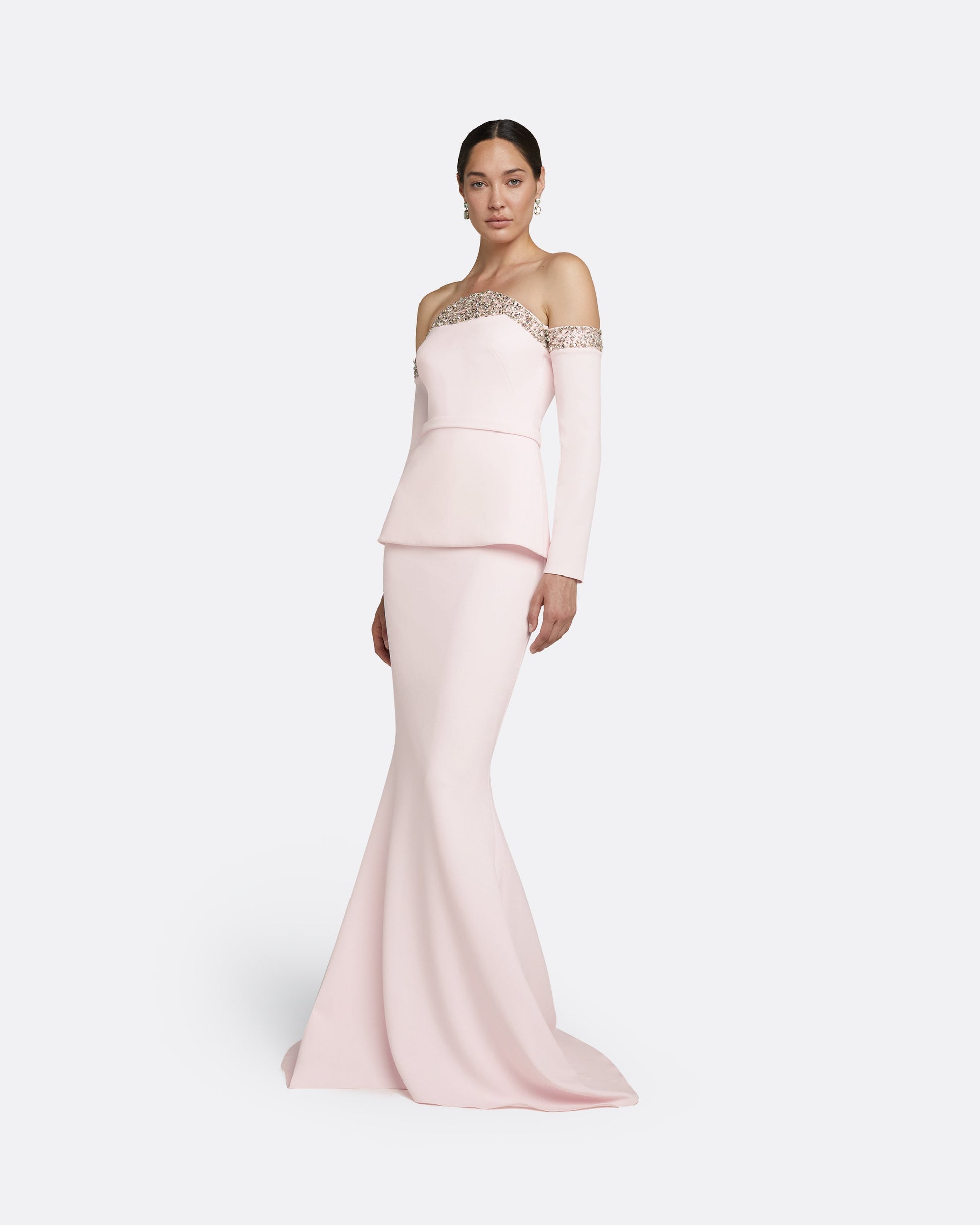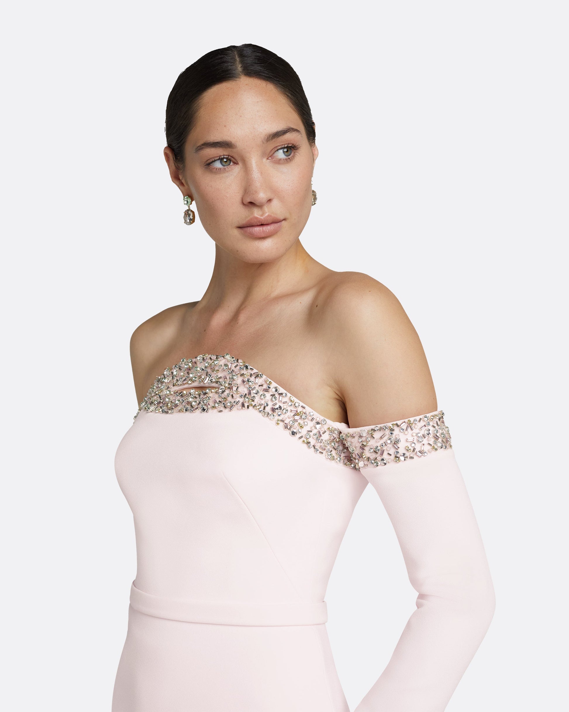 Off the shoulder top with long sleeves and rounded, cut out neckline in barely pink Heavy Crepe with multi-pinks Crystal Trim embroidery.