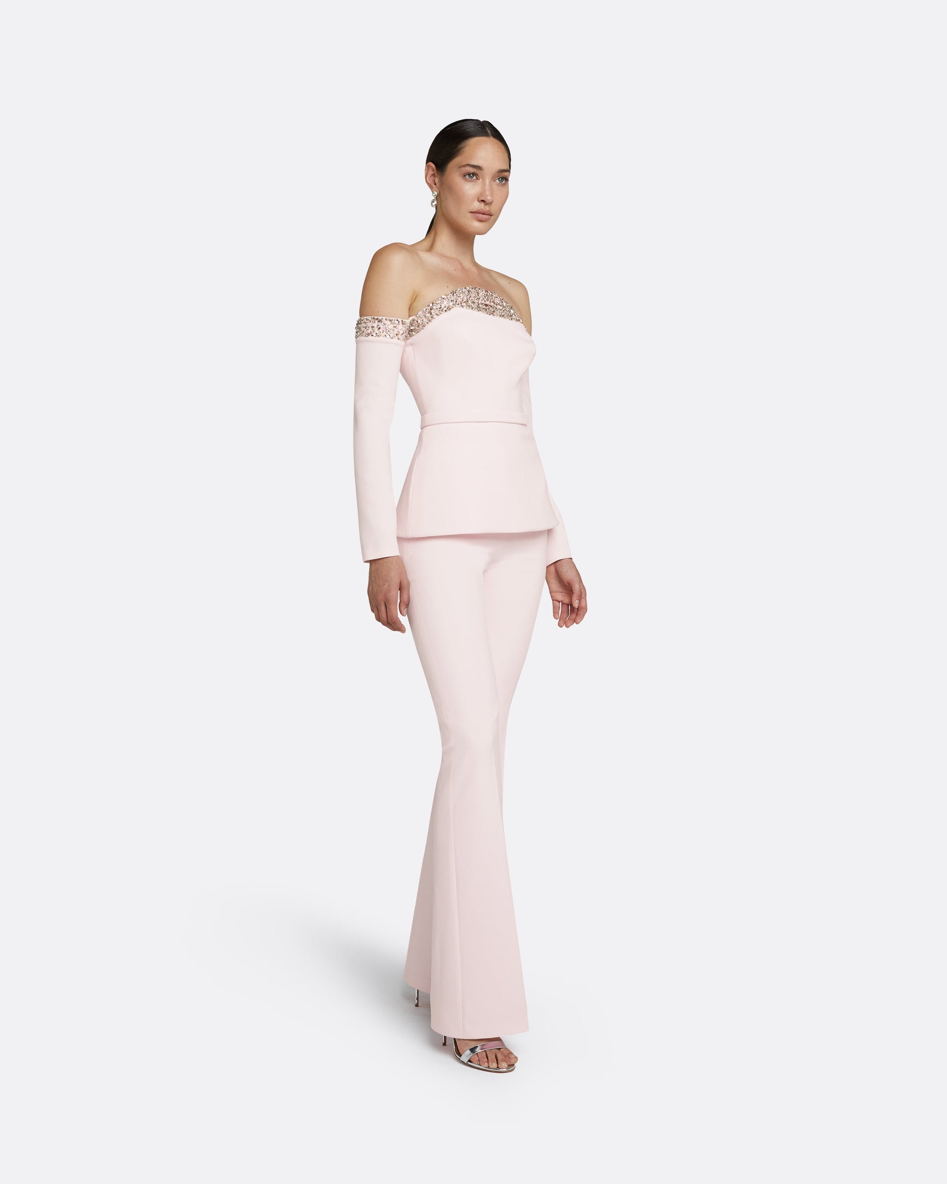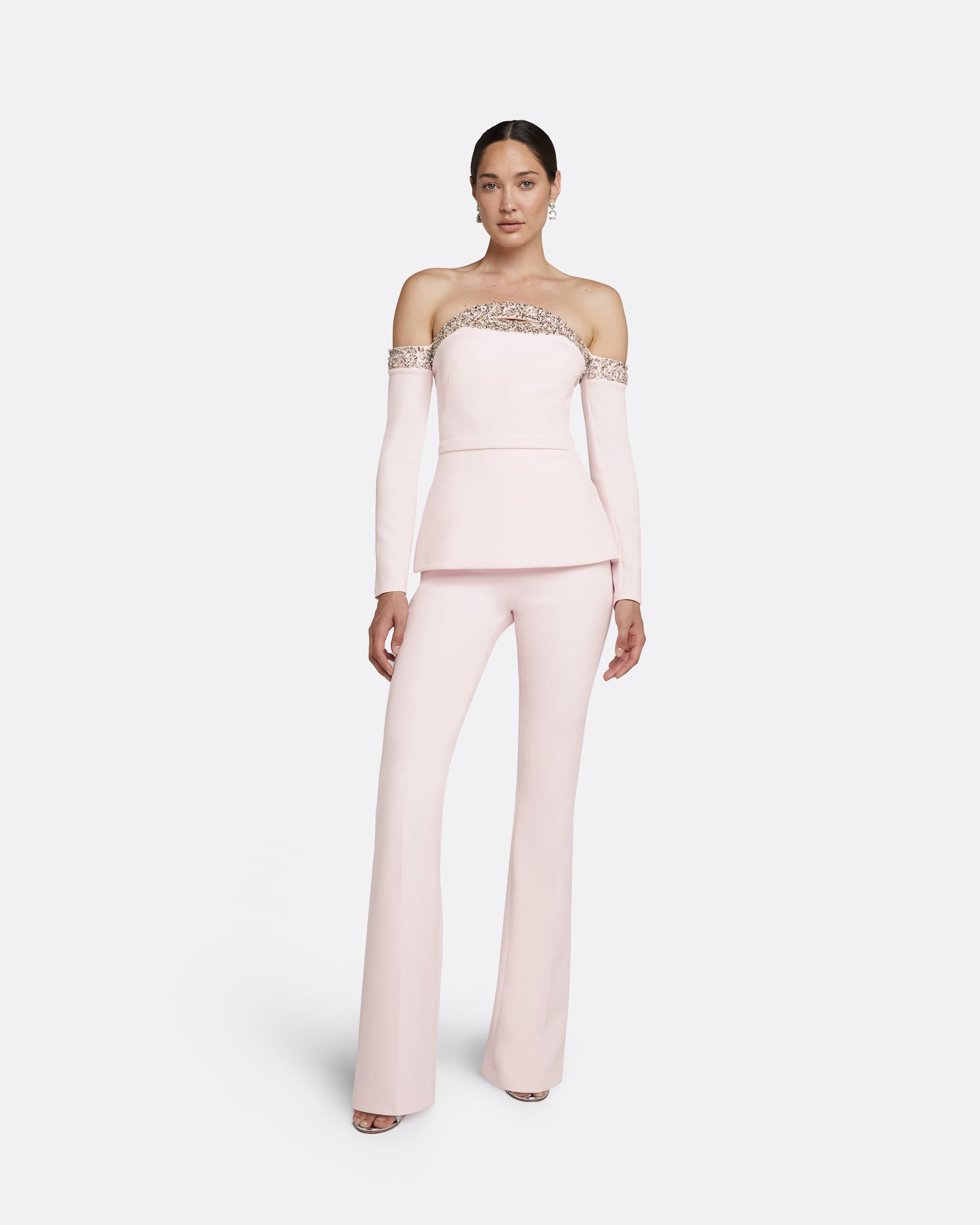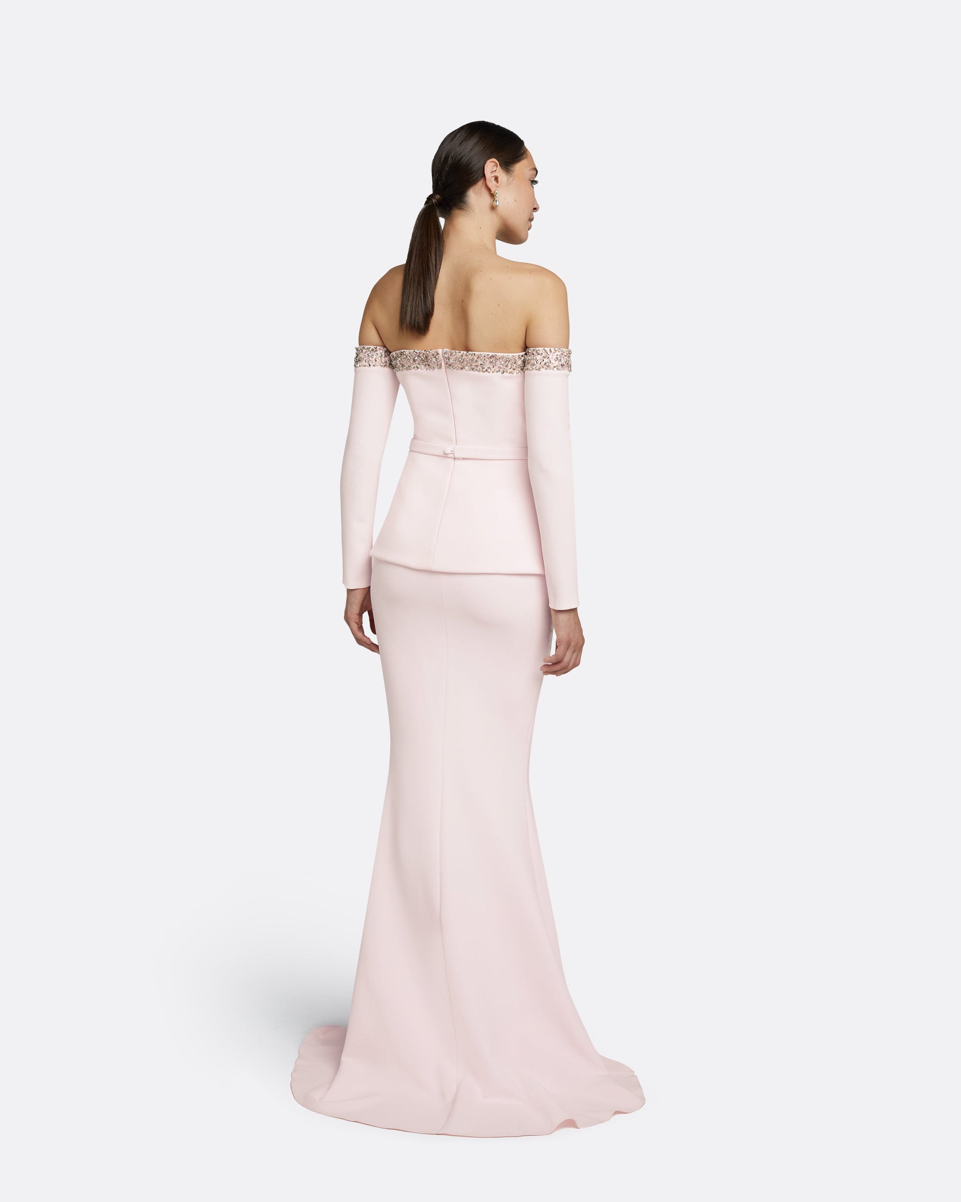 Off the shoulder top with long sleeves and rounded, cut out neckline in barely pink Heavy Crepe with multi-pinks Crystal Trim embroidery.