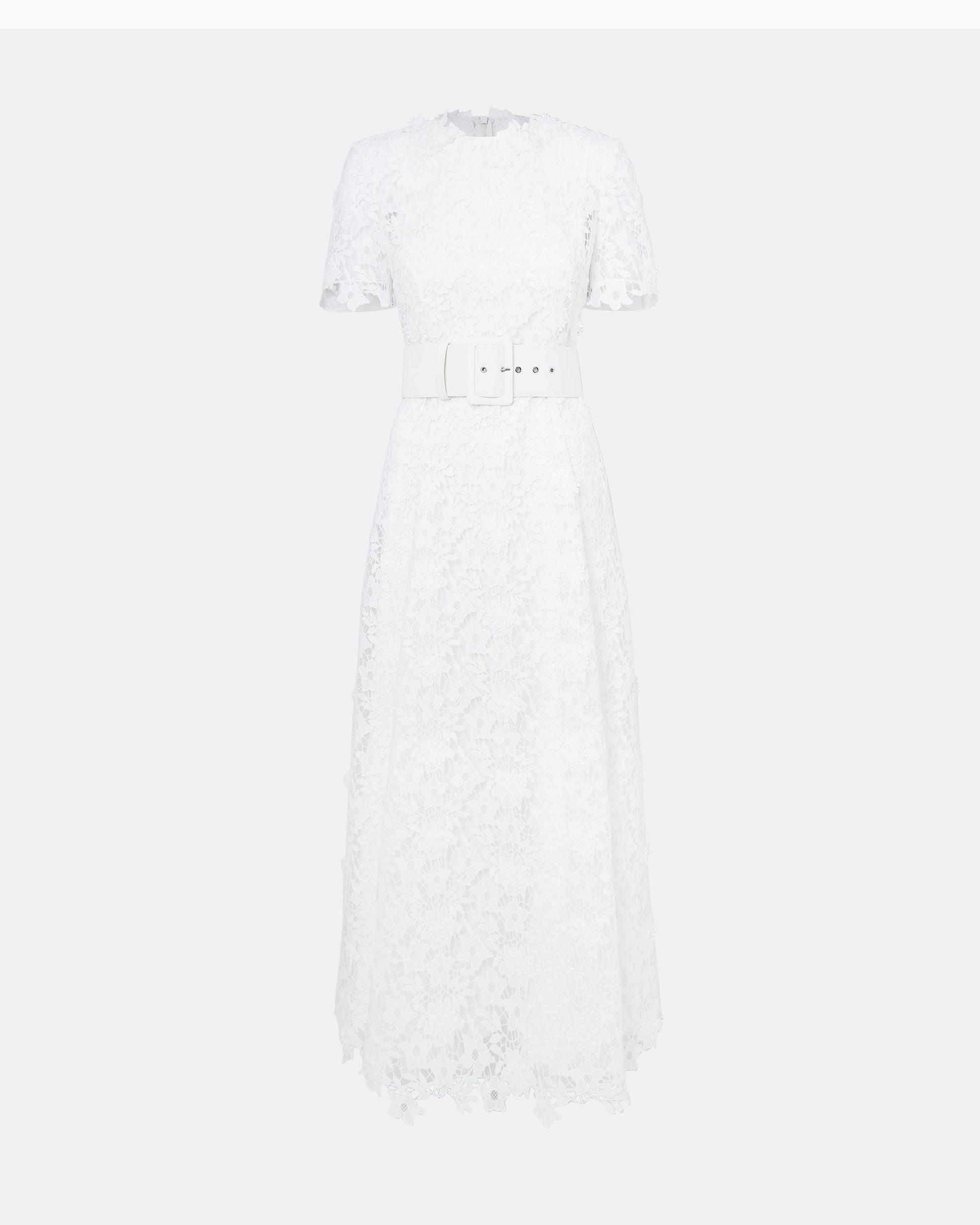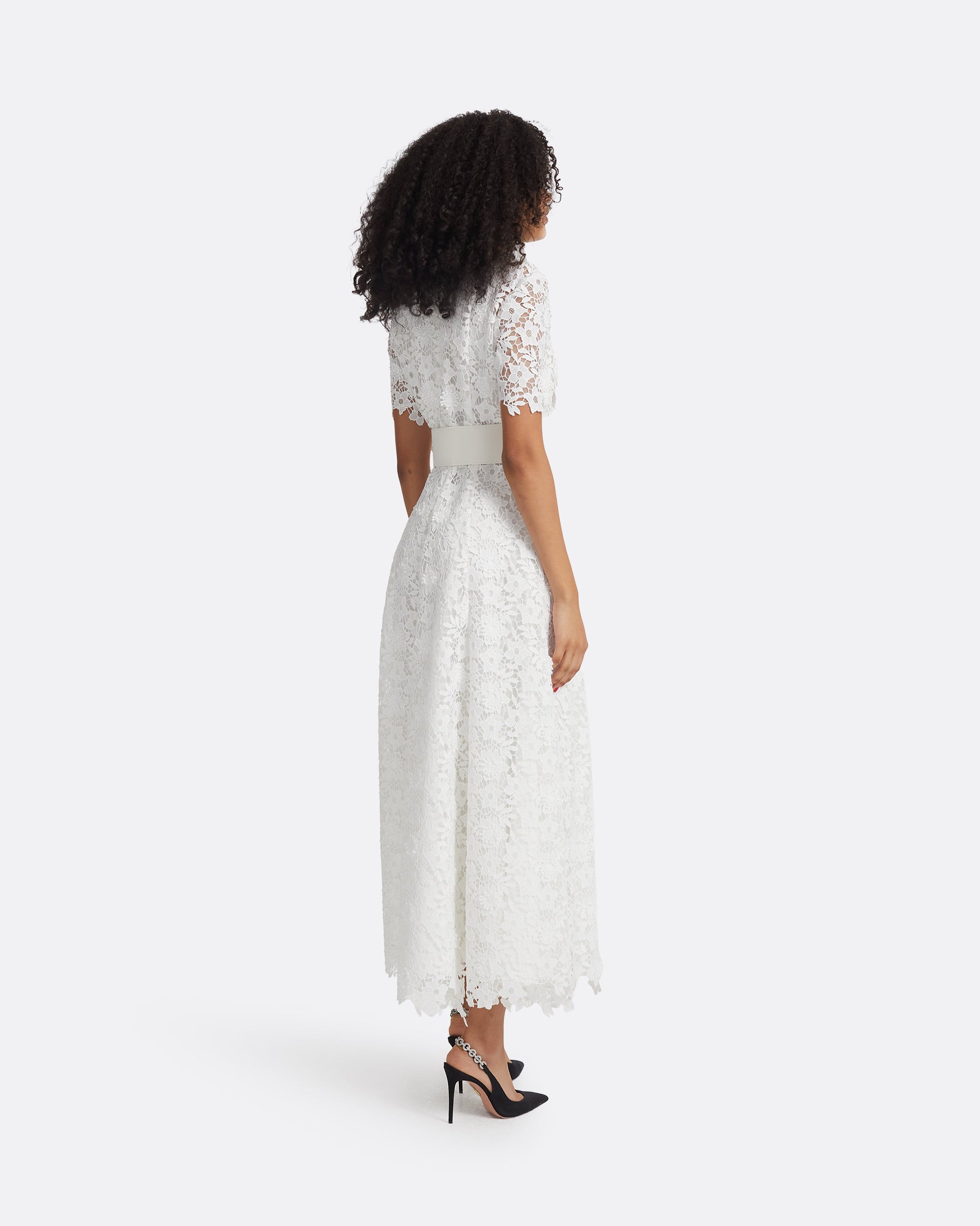 Classic, tea style dress with full skirt in ivory Picasso Lace.