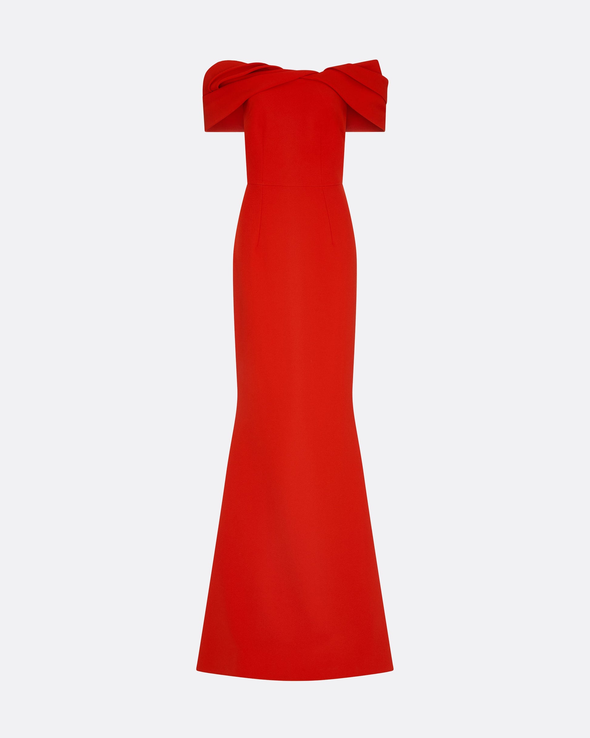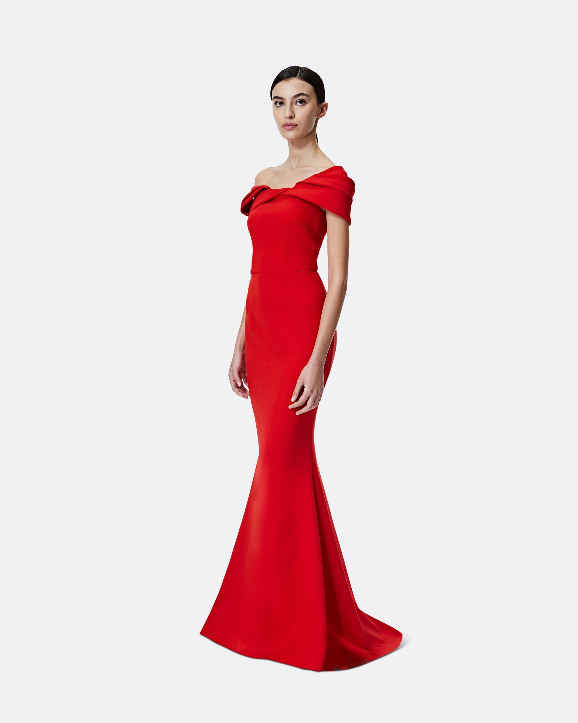 Off the shoulder dress with asymmetric shoulder drape in dazzling red.