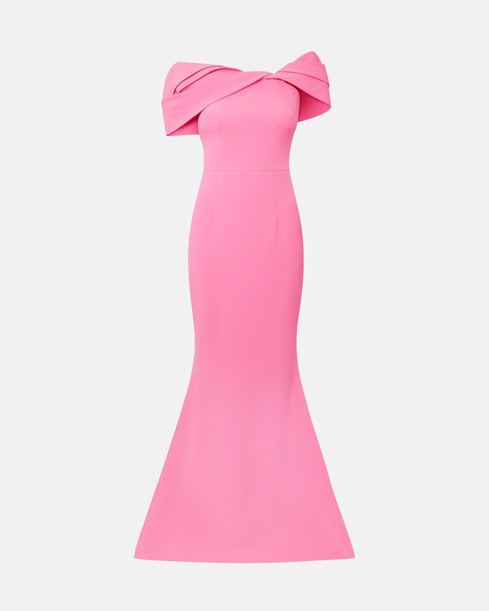 Off-shoulder dress with asymmetric shoulder drape in aurora Heavy Crepe.