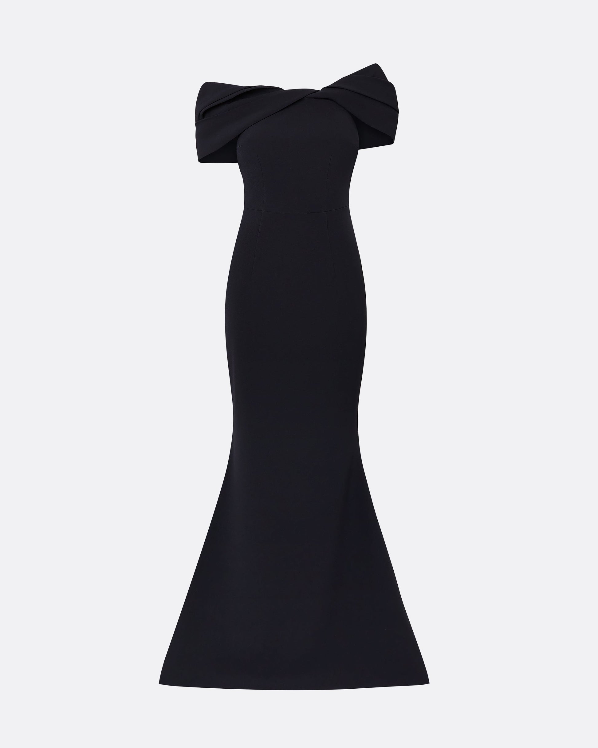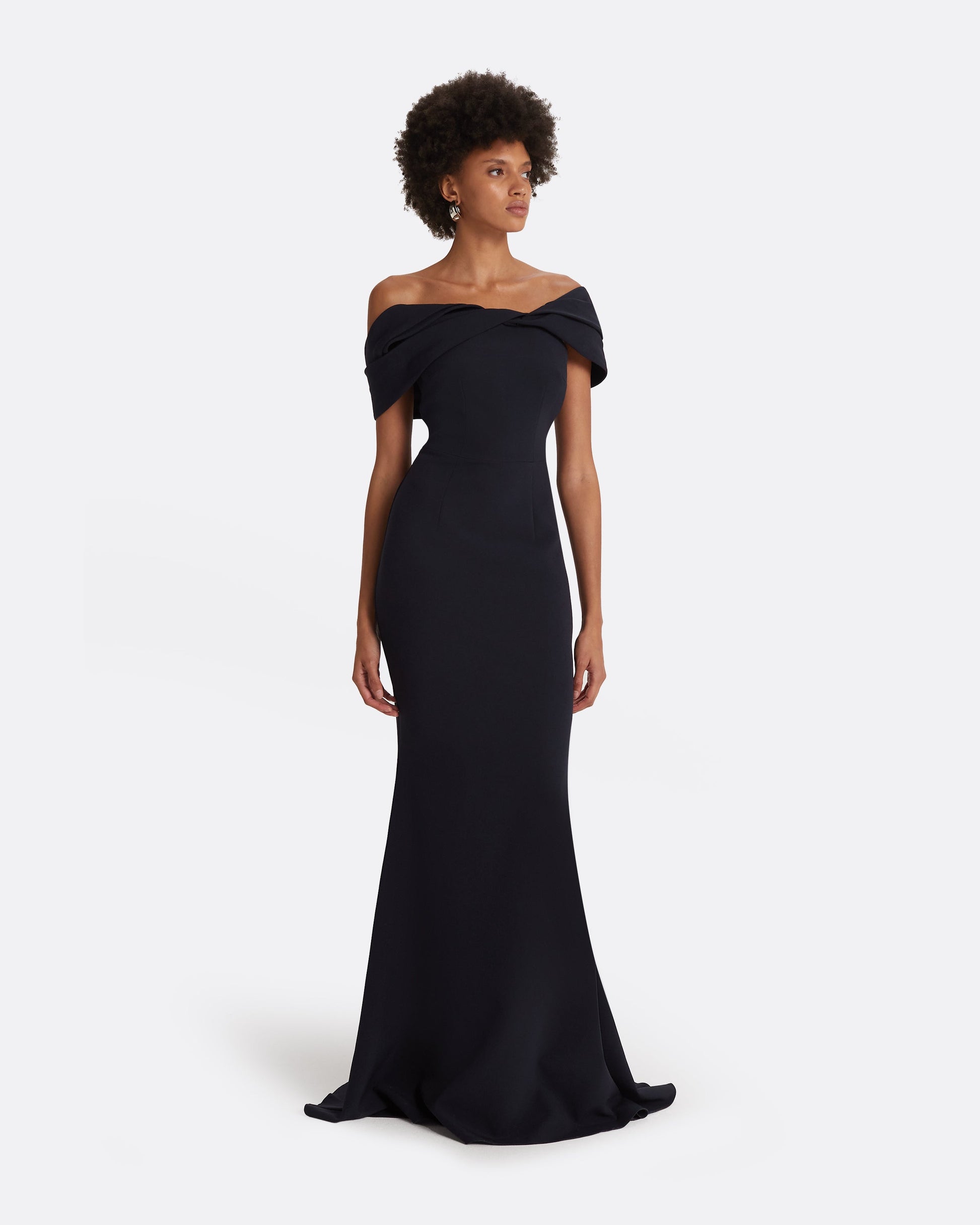 Off-shoulder dress with asymmetric shoulder drape in midnight navy Heavy Crepe.