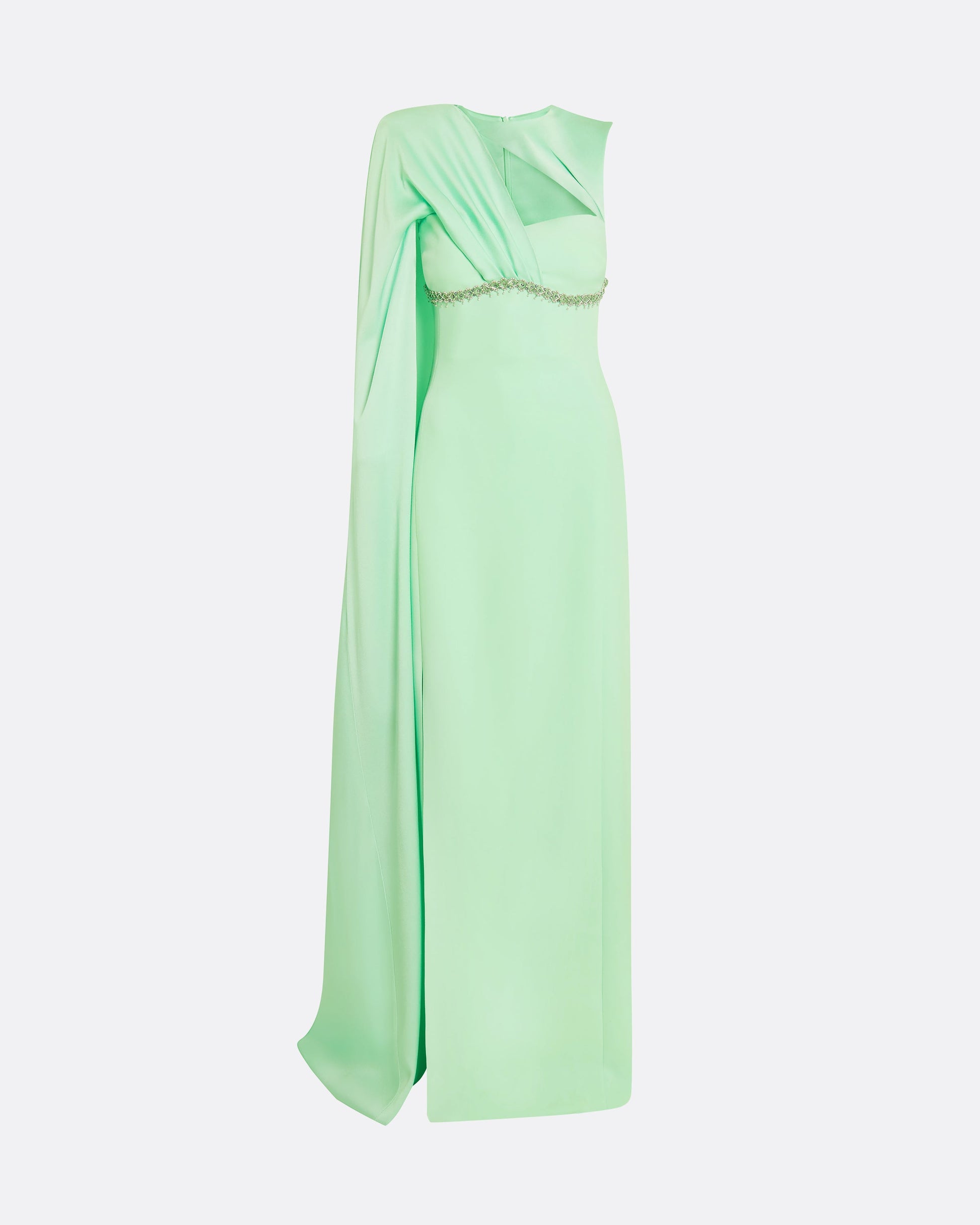 Column gown with sculpted neckline and statement contrast caped sleeve in brook green Heavy Crepe and Satin Back Crepe, with Geometrica embroidery.